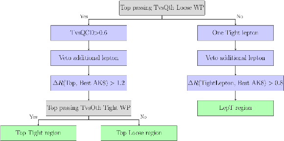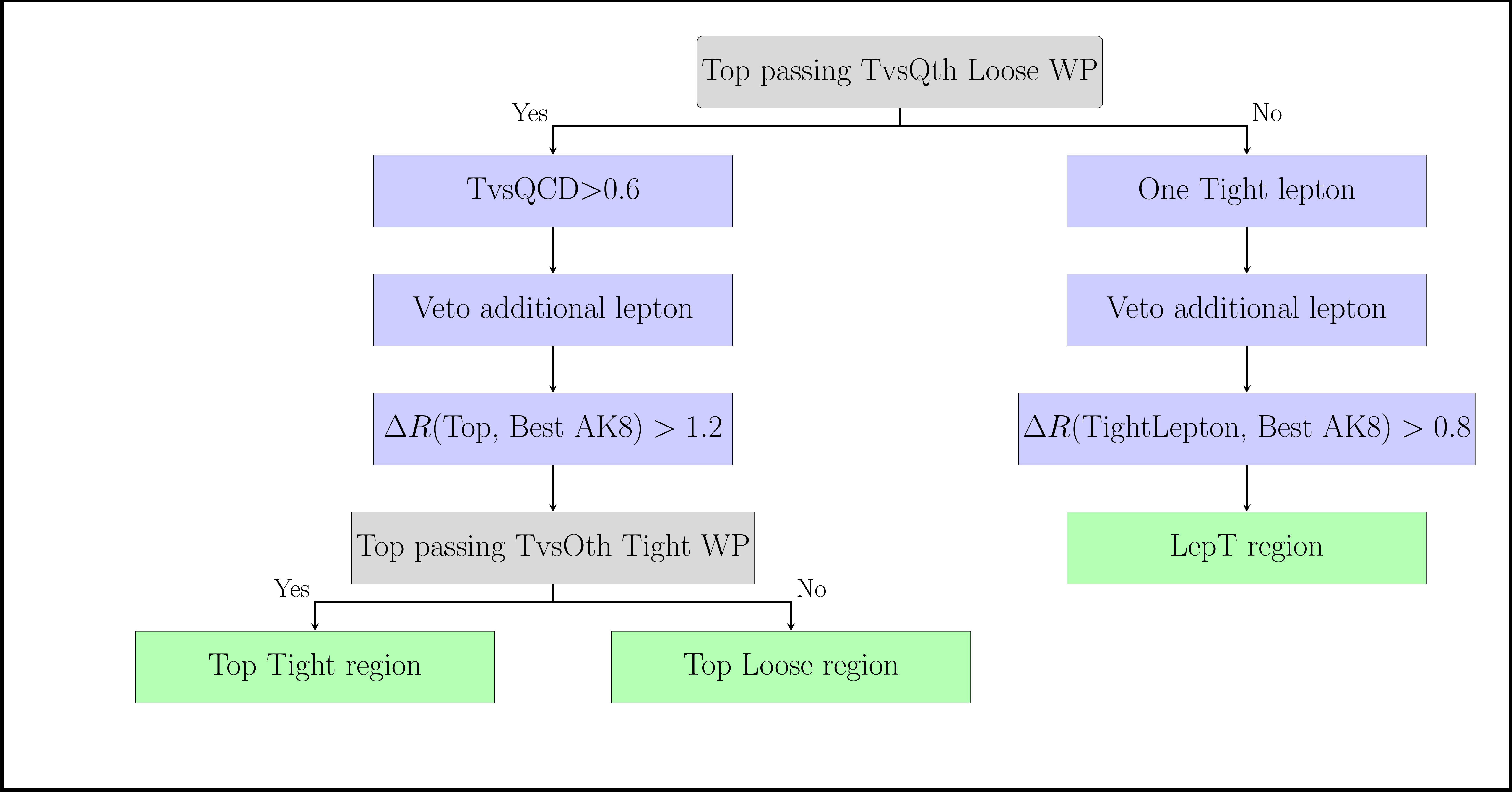 Left: block diagram showing the event classification based on top tagging. Right: schematic view of the signal, validation, and control regions defined in the analysis. |