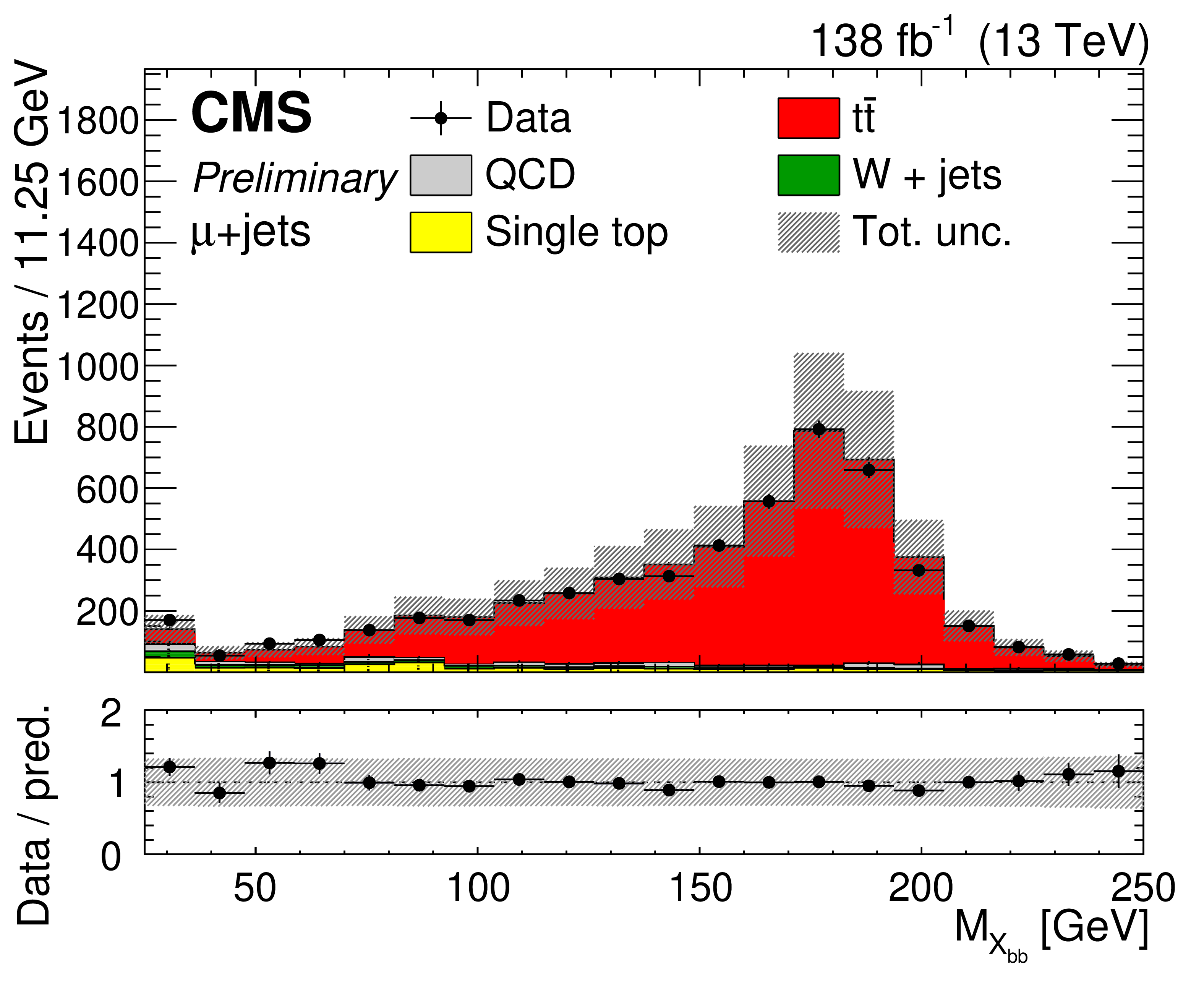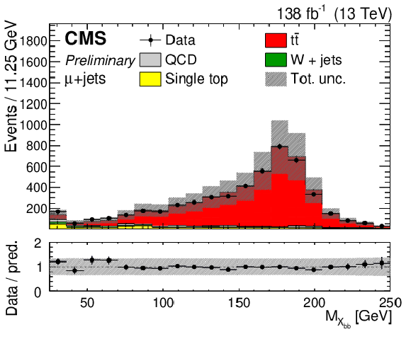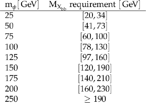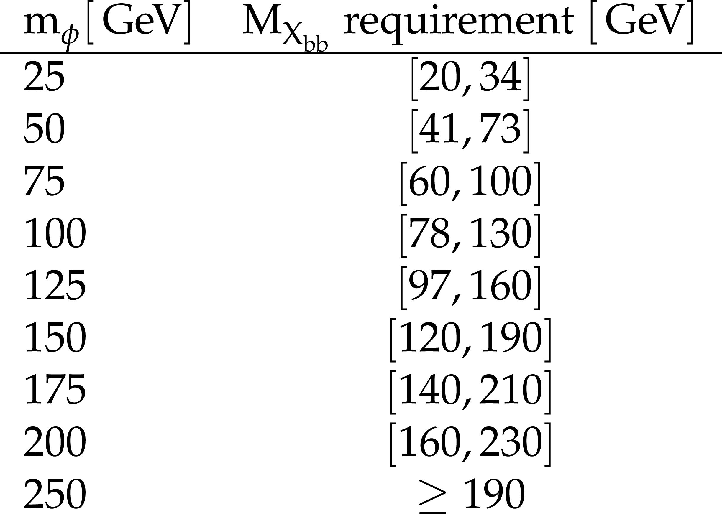 Applied requirement on the reconstructed $ \mathrm{M_{X_{bb}}} $ mass of the $ \phi $ boson candidate, as a function of the $ \mathrm{m}_{\phi} $ boson mass hypothesis being tested. The $ \mathrm{M_{X_{bb}}} $ mass must fall within the specified interval. |