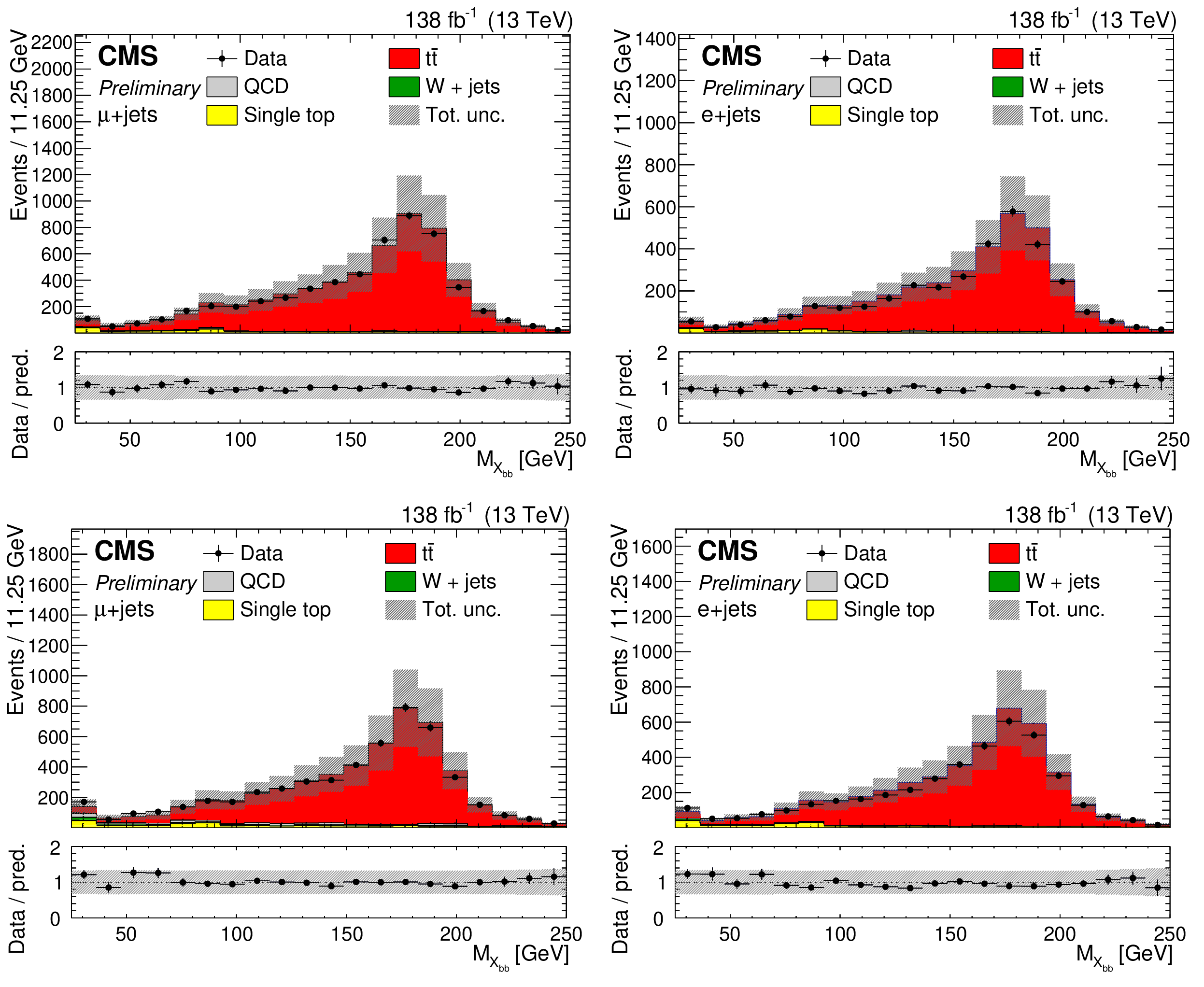 Distribution of the mass of the AK8 jet selected as the $ \phi $ boson candidate for data and simulated background events in the (TopT, XbbL) validation region (top), in the (TopL, XbbL) validation region (bottom), and for the muon (left) and electron channels (right). The distributions are shown before the final fit for the signal extraction. |