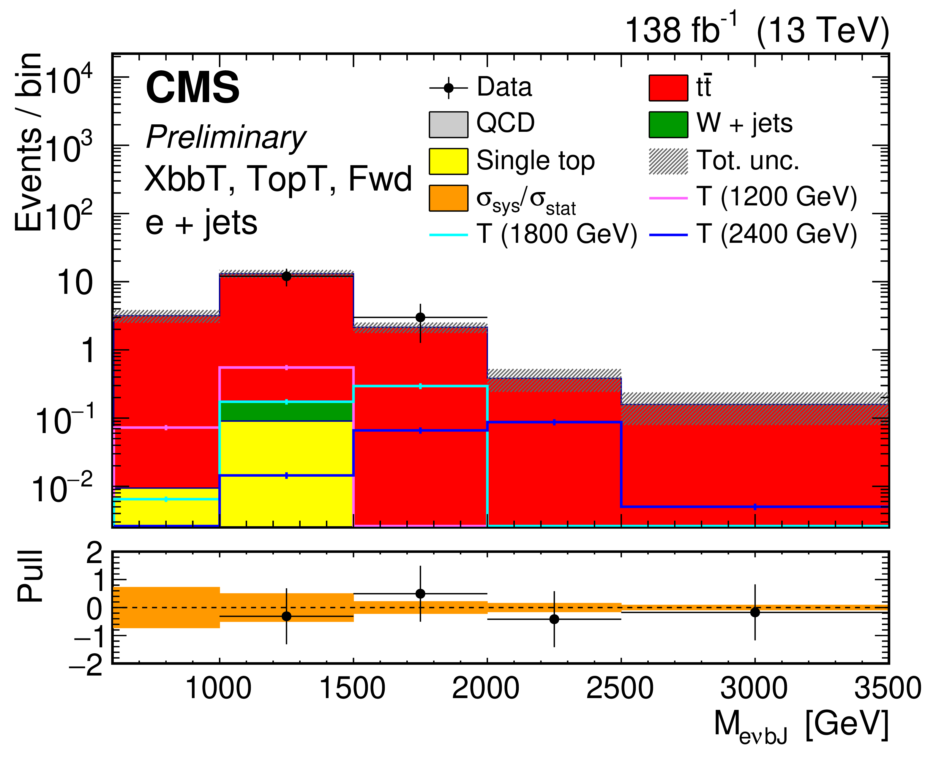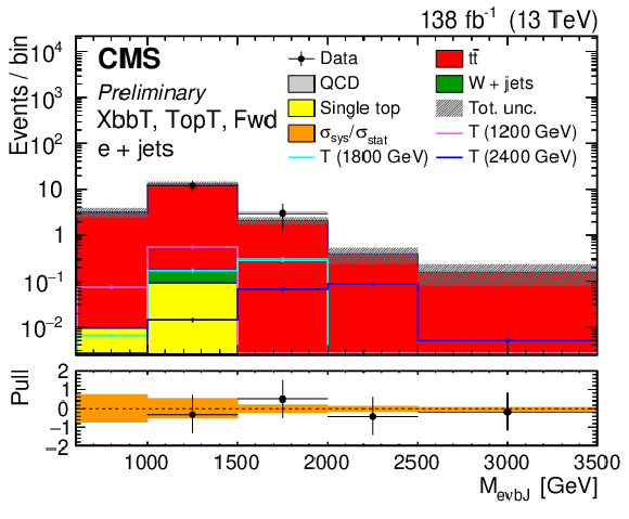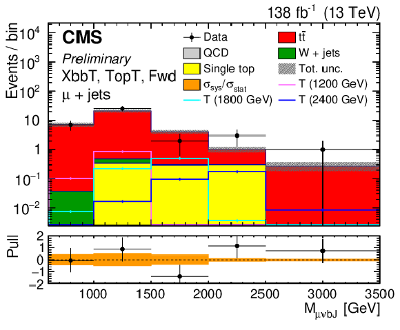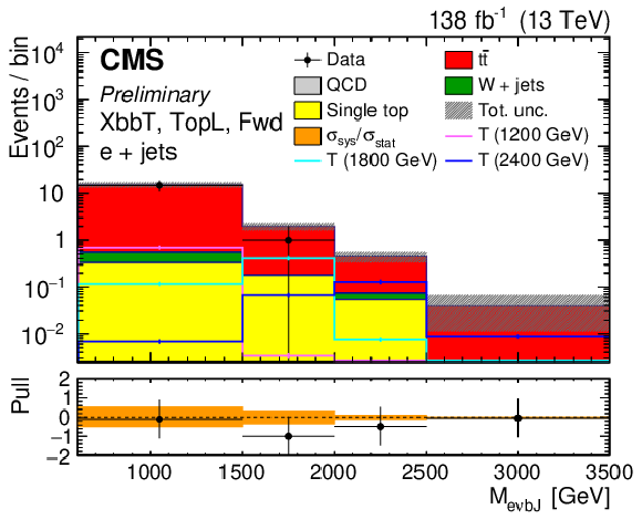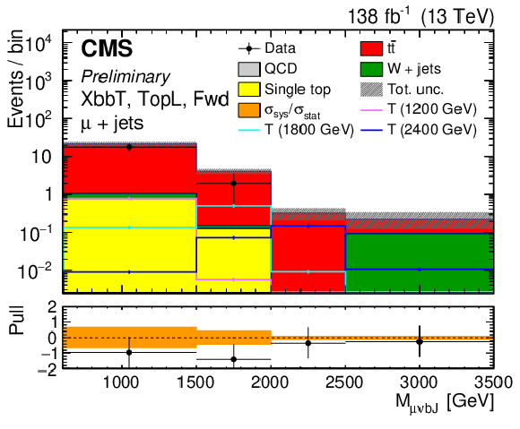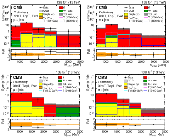 Invariant mass distribution of the $ {\mathrm{T}} $ quark candidates for events with at least one forward jet in the signal regions (TopT, XbbT) (top) and (TopL, XbbT) (bottom). Distributions are shown for events in the muon (left) and electron (right) channel. The first (last) bin of each distribution also includes underflow (overflow) events. The lower panel reports the data minus the expected number of events normalized to the statistical uncertainty of the data. The orange band represents the systematic uncertainties, also normalized to the statistical uncertainty of the data. |