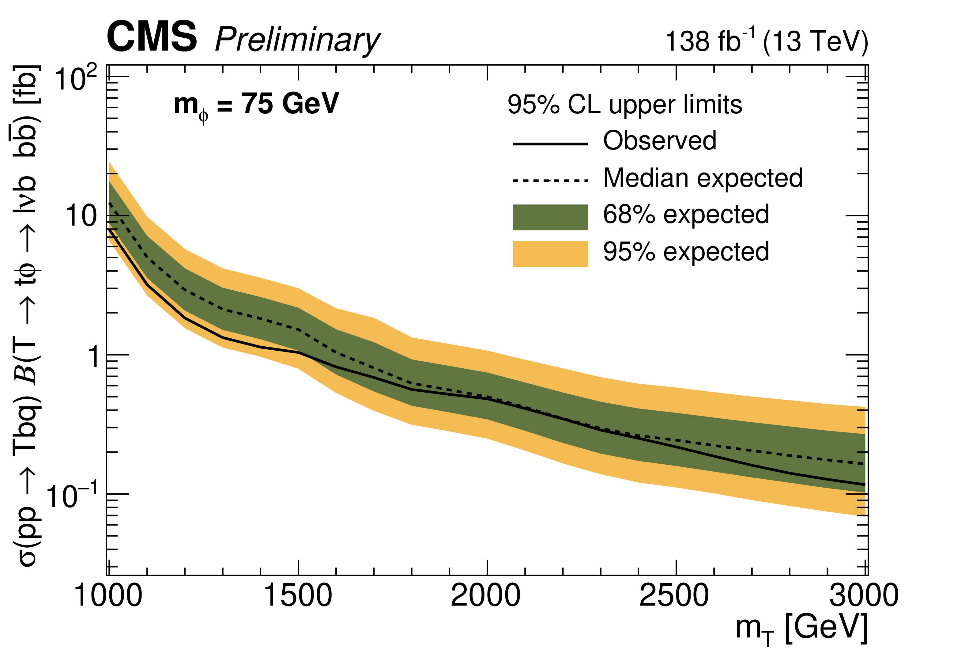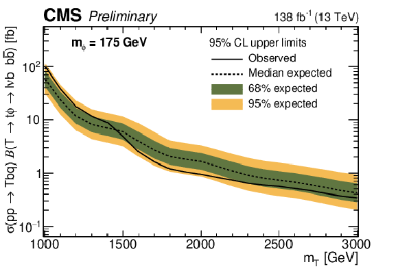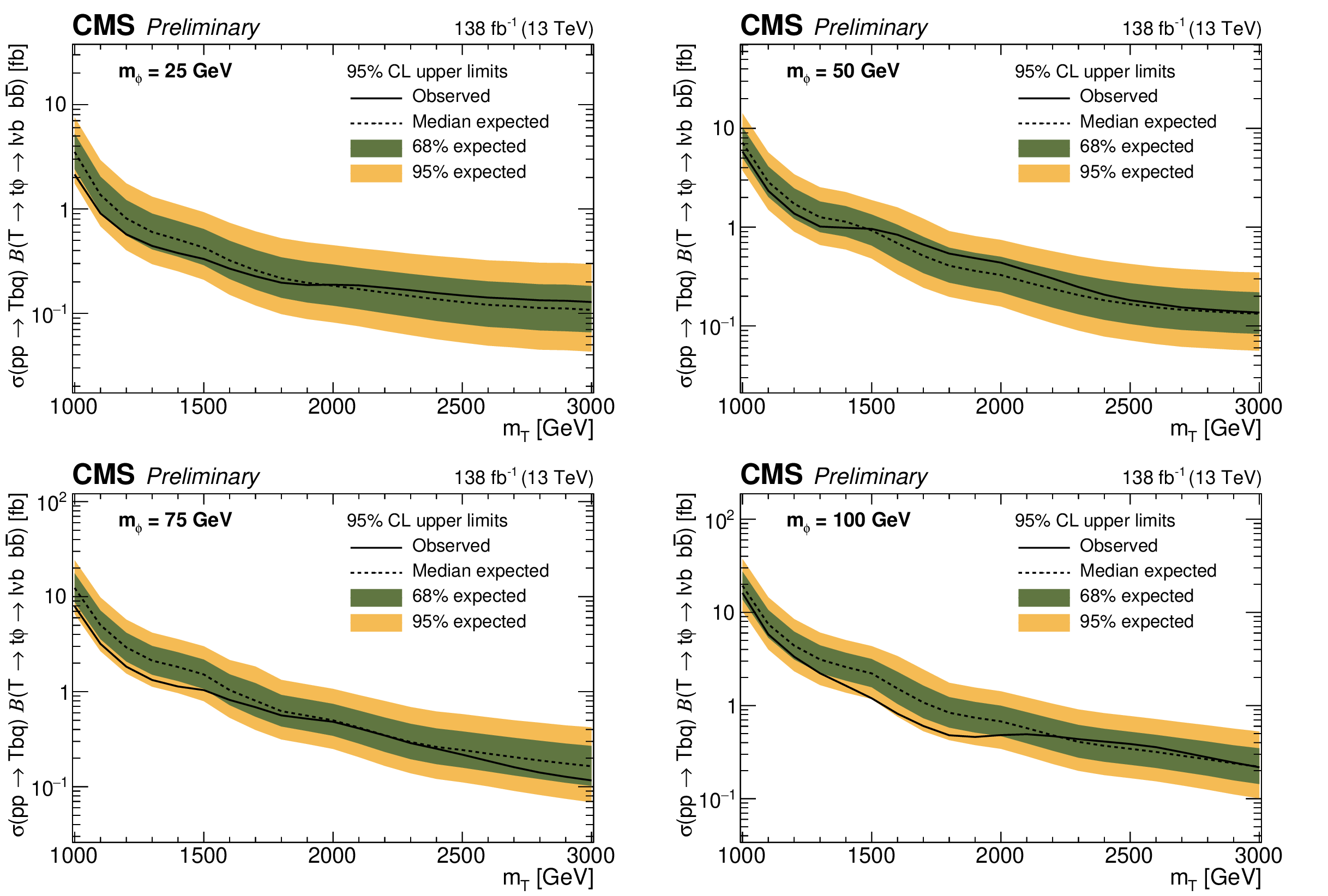 Observed (solid lines) and expected (dashed lines) 95% CL upper limits on the singleTquark production cross section times the branching fraction of the $ {\mathrm{T}} \to\mathrm{t}\phi \to \mathrm{b}\ell\nu \mathrm{b}\overline{\mathrm{b}} $ channel as a function of $ \mathrm{m}_{{\mathrm{T}} } $, for fixed values of $ \mathrm{m}_{\phi} $, from $ \mathrm{m}_{\phi}= $ 25 GeV up to $ \mathrm{m}_{\phi}= $ 100 GeV. The inner (green) and outer (yellow) bands represent the regions containing 68% and 95%, respectively, of the limit values expected under the background-only hypothesis. |