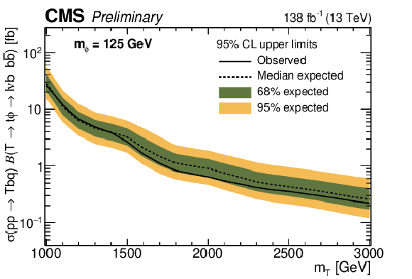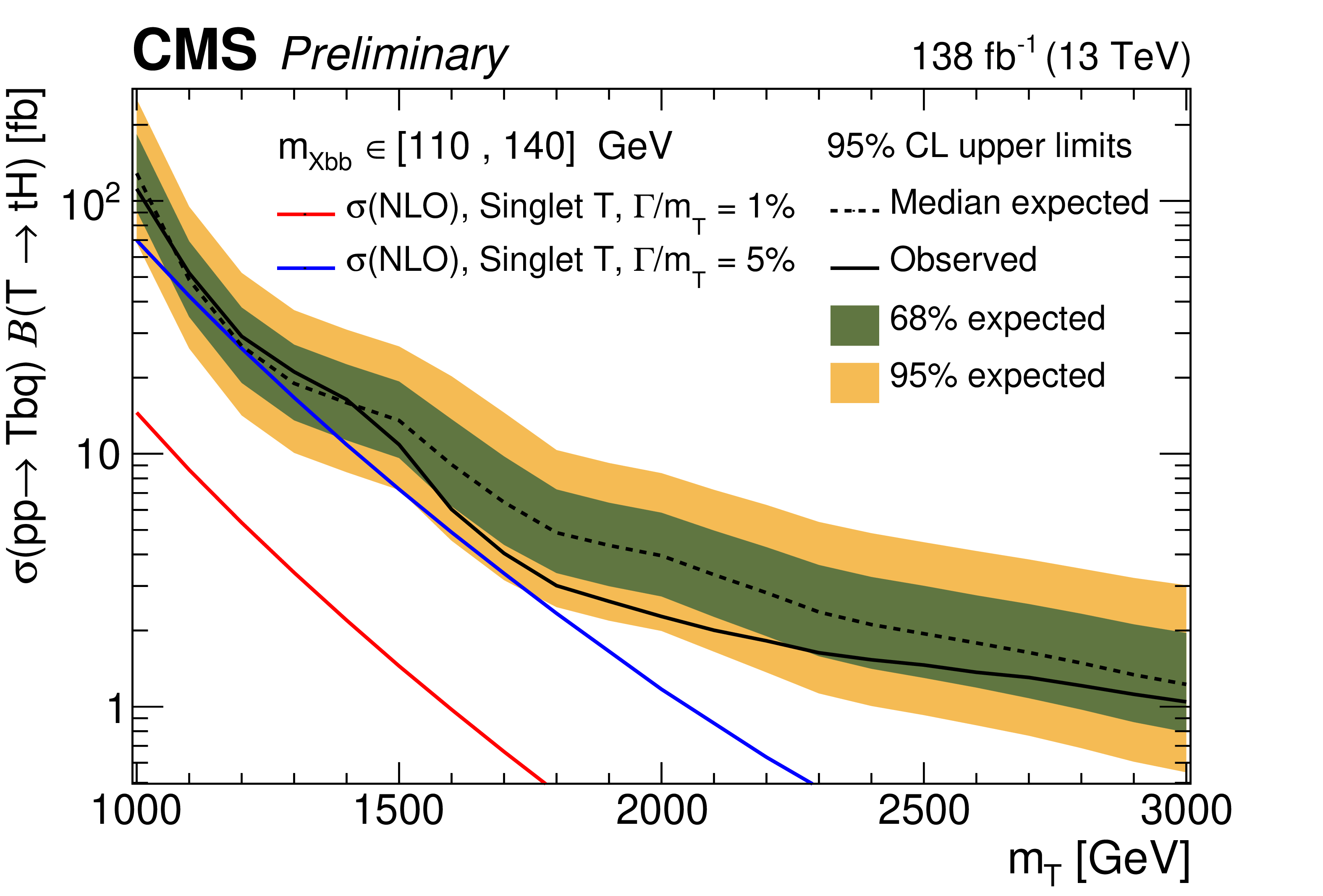 Observed (solid black line) and expected (dashed line) 95% CL upper limits on the singleTquark production cross section times the branching fraction of the $ {\mathrm{T}} \to\mathrm{t}\mathrm{H} $ channel as a function of the $ \mathrm{m}_{{\mathrm{T}} } $ mass. The inner (green) and outer (yellow) bands represent the region containing 68% and 95%, respectively, of the limit values expected under the background-only hypothesis. The solid red (blue) curve shows the theoretical expectation at NLO for a singletTquark assuming a narrow-width resonance of width 1% (5%) of the resonance mass [6,7]. |