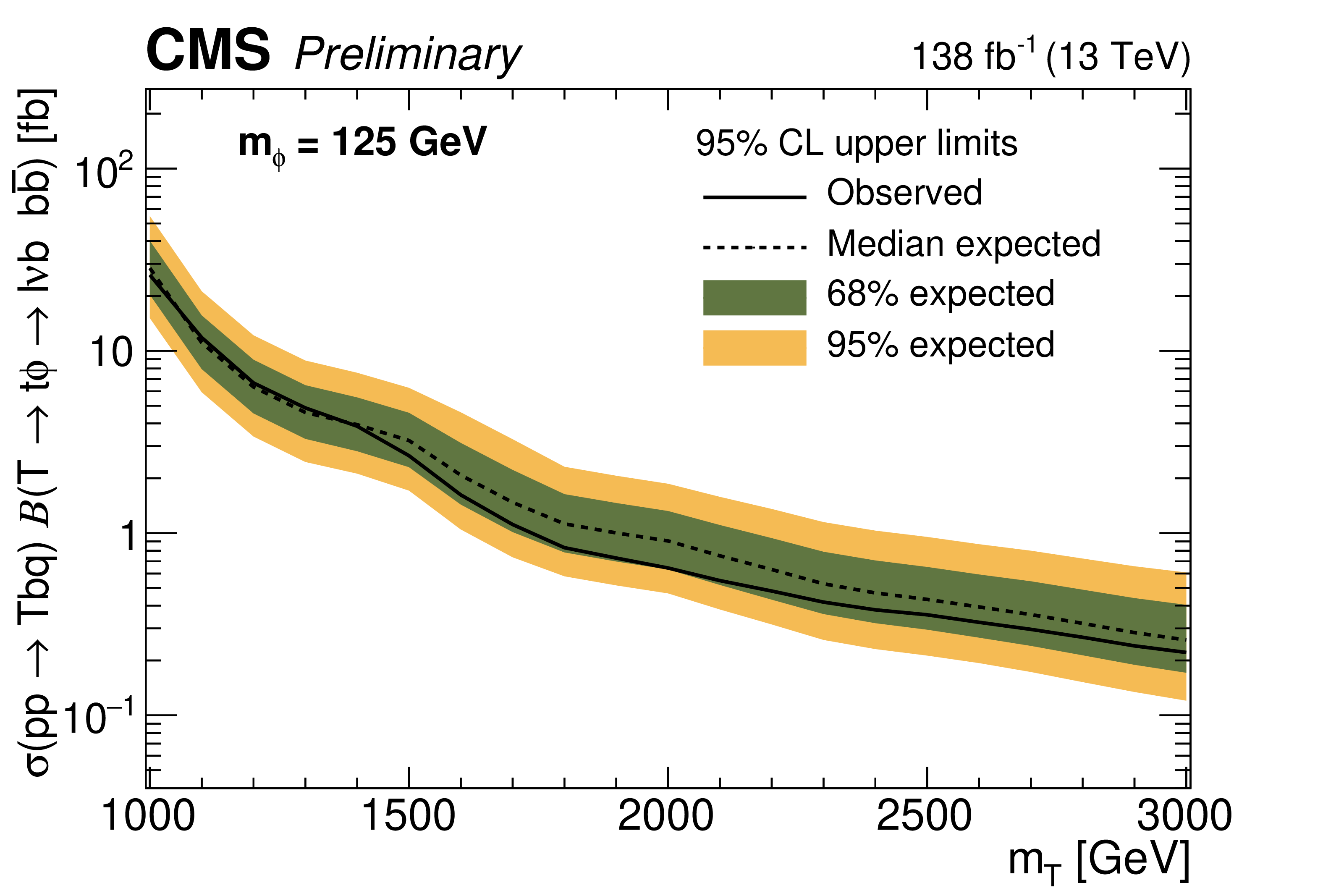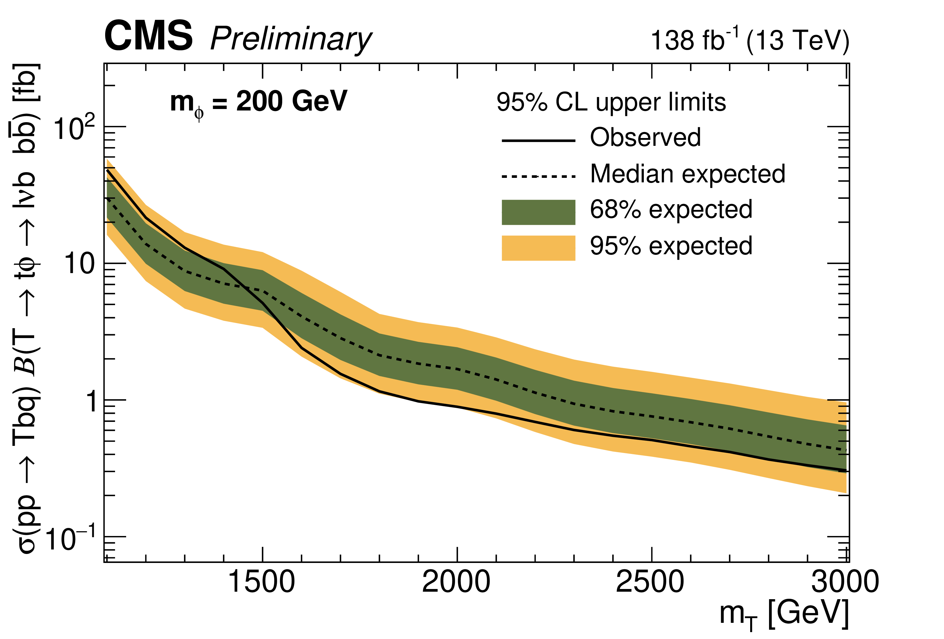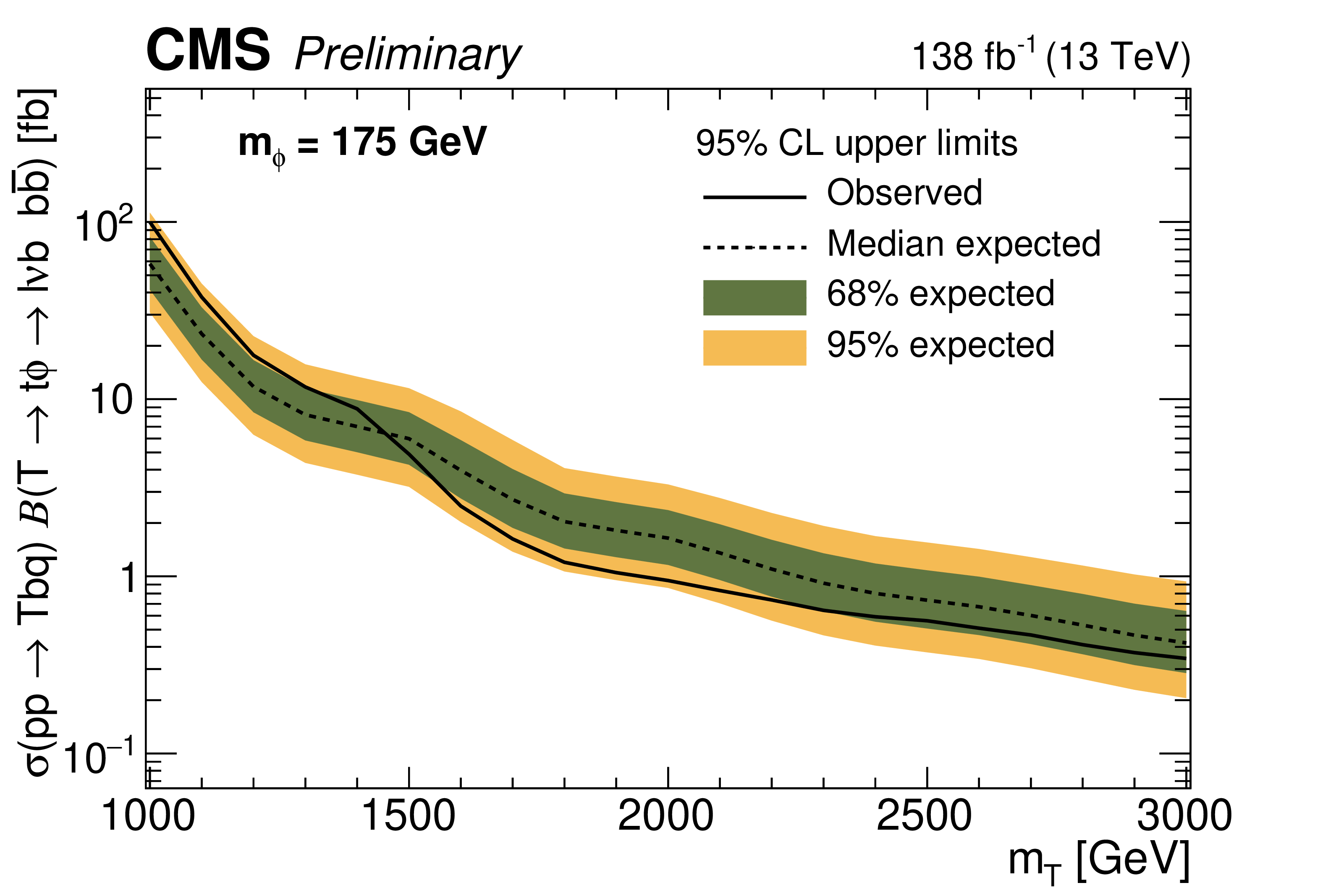 Observed 95% CL upper limits on the singleTquark production cross section times the branching fraction of the $ {\mathrm{T}} \to\mathrm{t}\phi \to \mathrm{b}\ell\nu \mathrm{b}\overline{\mathrm{b}} $ channel as a function of $ \mathrm{m}_{{\mathrm{T}} } $ and $ \mathrm{m}_{\phi} $ masses. |