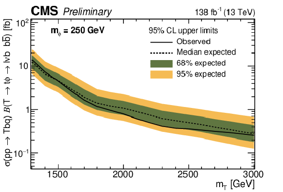 Observed (solid lines) and expected (dashed lines) 95% CL upper limits on the singleTquark production cross section times the branching fraction of the $ {\mathrm{T}} \to\mathrm{t}\phi \to \mathrm{b}\ell\nu \mathrm{b}\overline{\mathrm{b}} $ channel as a function of $ \mathrm{m}_{{\mathrm{T}} } $, for fixed values of $ \mathrm{m}_{\phi} $, from $ \mathrm{m}_{\phi}= $ 125 GeV up to $ \mathrm{m}_{\phi}= $ 250 GeV. The inner (green) and outer (yellow) bands represent the regions containing 68% and 95%, respectively, of the limit values expected under the background-only hypothesis. |
