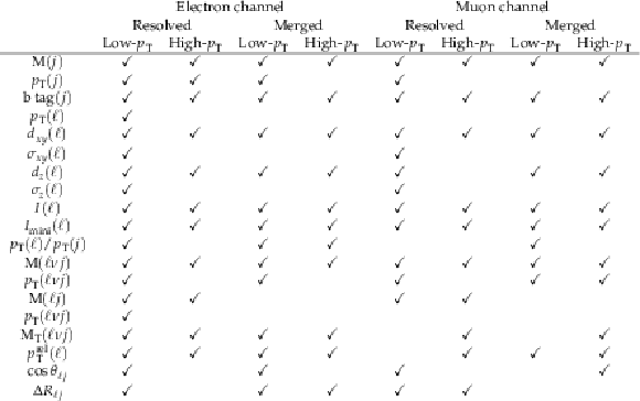 List of the variables employed for each of the eight trainings of the multiclass BDT algorithm for top quark candidate identification. The trainings are different for each lepton channel, for the merged or resolved configuration of the top quark candidate, and for the $ p_{\mathrm{T}} $ range of the top quark candidate. |