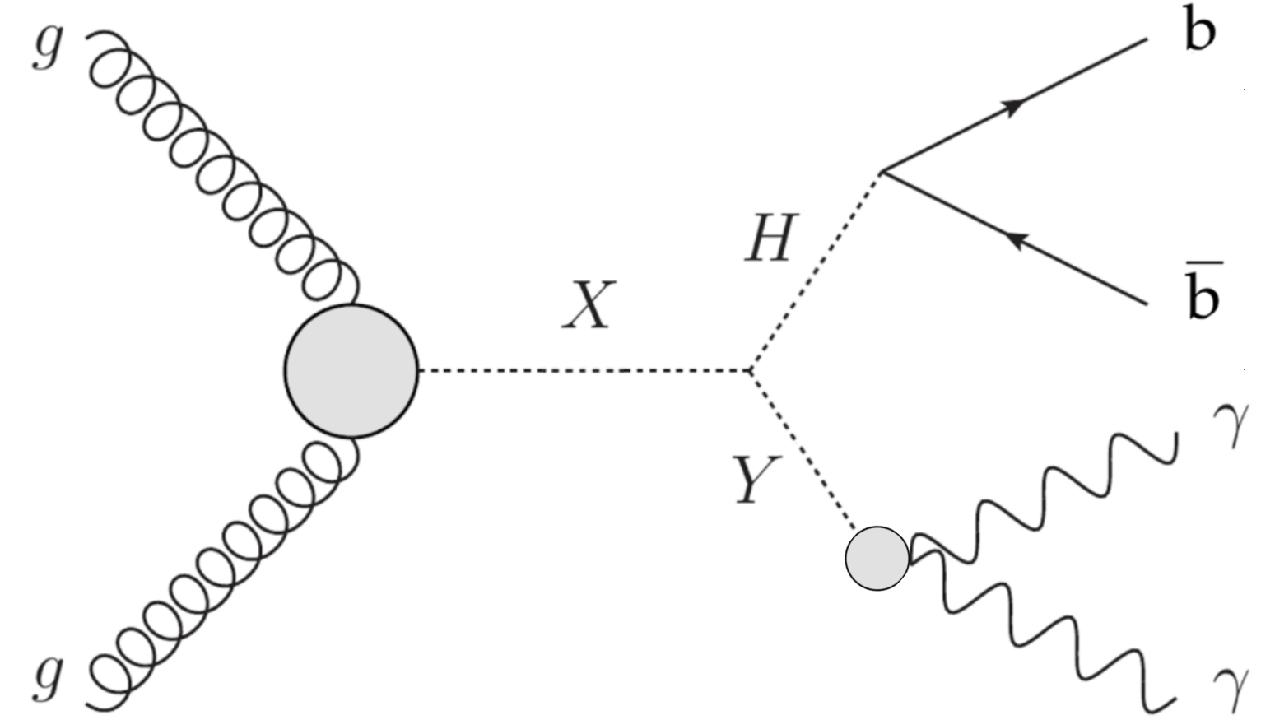 Feynman diagram for the production of the BSM resonance $ \mathrm{X} $ and its subsequent decay to two scalars, one SM Higgs boson and one BSM scalar $ \text{Y} $, with $ \mathrm{H}\to\mathrm{b}\overline{\mathrm{b}} $ and $ \text{Y}\to\gamma\gamma $ |
