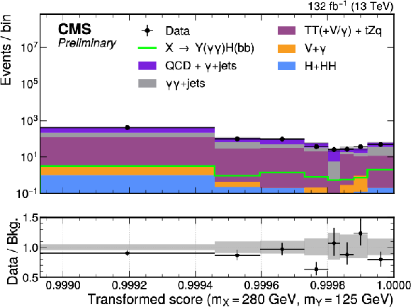 Distributions of the transformed pNN score for the signal hypotheses of $ m_\text{X}= $ 280 GeV, $ m_\text{Y}= $ 125 GeV (left) and $ m_\text{X}= $ 600 GeV, $ m_\text{Y}= $ 70 GeV (right) in their corresponding SRs. The bin boundaries correspond to the SR boundaries of each mass point. The distributions are inclusive in the $ m_{\gamma\gamma} $ distribution. The grey bands in the lower panels show the statistical uncertainty on the background estimation. |