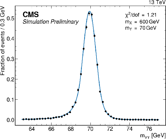 Parametric models of the signal process for $ m_\text{X}= $ 600 GeV, $ m_\text{Y}= $ 70 GeV (left), and for $ m_\text{X}= $ 1000 GeV, $ m_\text{Y}= $ 800 GeV (right) in their most sensitive signal region. The histograms are normalized to unity. The acronym ``dof" stands for the numbers of degrees of freedom of the parametric model. |