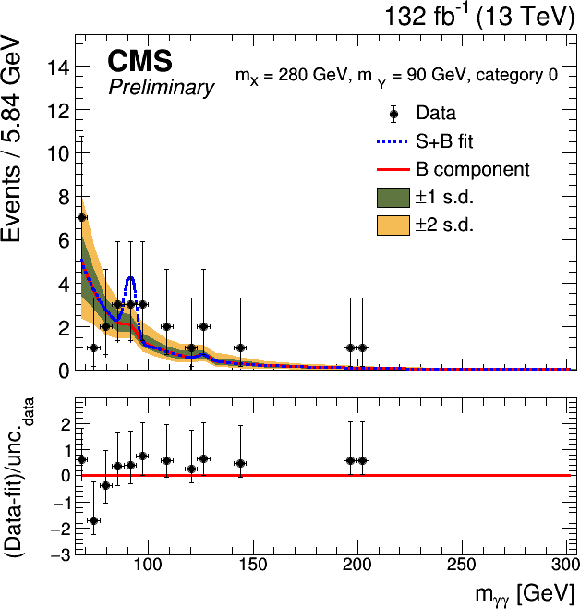 Background-only fit (red line) and signal+background fit (blue line) for the mass point hypothesis of $ m_\text{X}= $ 280 GeV, $ m_\text{Y}= $ 90 GeV. The red line in the lower panel shows the background-only fit, which is by definition zero, and it is added as a visual aid. From left to right, the first and second most sensitive signal regions are shown. The choice of the background functional form is determined by the maximum likelihood fit. |