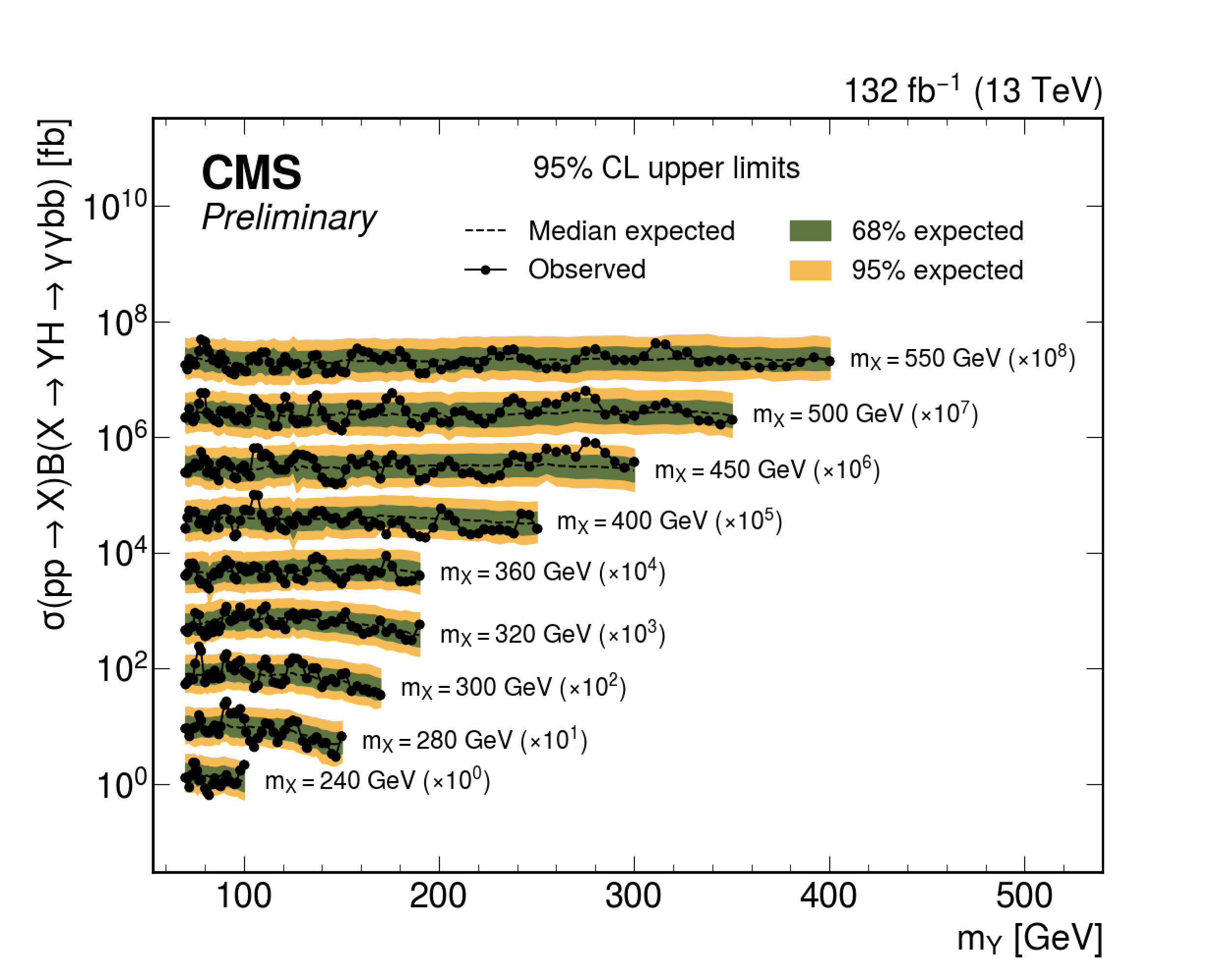 Observed\,(expected) upper limits on the $ \sigma \times BR $ for the $ \text{X}\to\text{Y}(\gamma\gamma)\mathrm{H}(\mathrm{b}\overline{\mathrm{b}}) $ signal with the different mass hypotheses are shown with solid\,(dashed) lines. The green and the yellow bands define the $ \pm 68% $ and $ \pm 95% $ uncertainty bands, respectively. For visualization purposes, the upper limit for mass points with different $ m_\text{X} $ has been multiplied with a constant factor quoted on the right of each band. Mass points with $ m_\text{X} $ ranging from 240 to 550 GeV are shown. |
