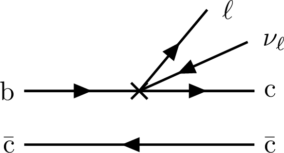 Tree level $ \mathrm{b}\to\mathrm{c}\ell\nu $ transition representation: in the SM, the vertex is mediated by a W boson exchange, while in BSM scenarios other contributions could be foreseen. |