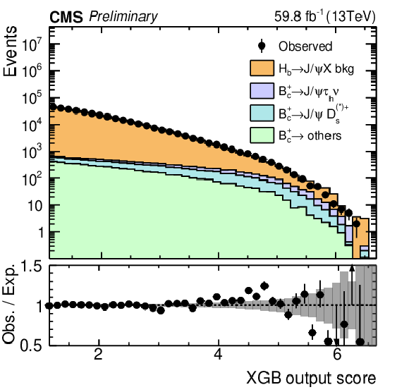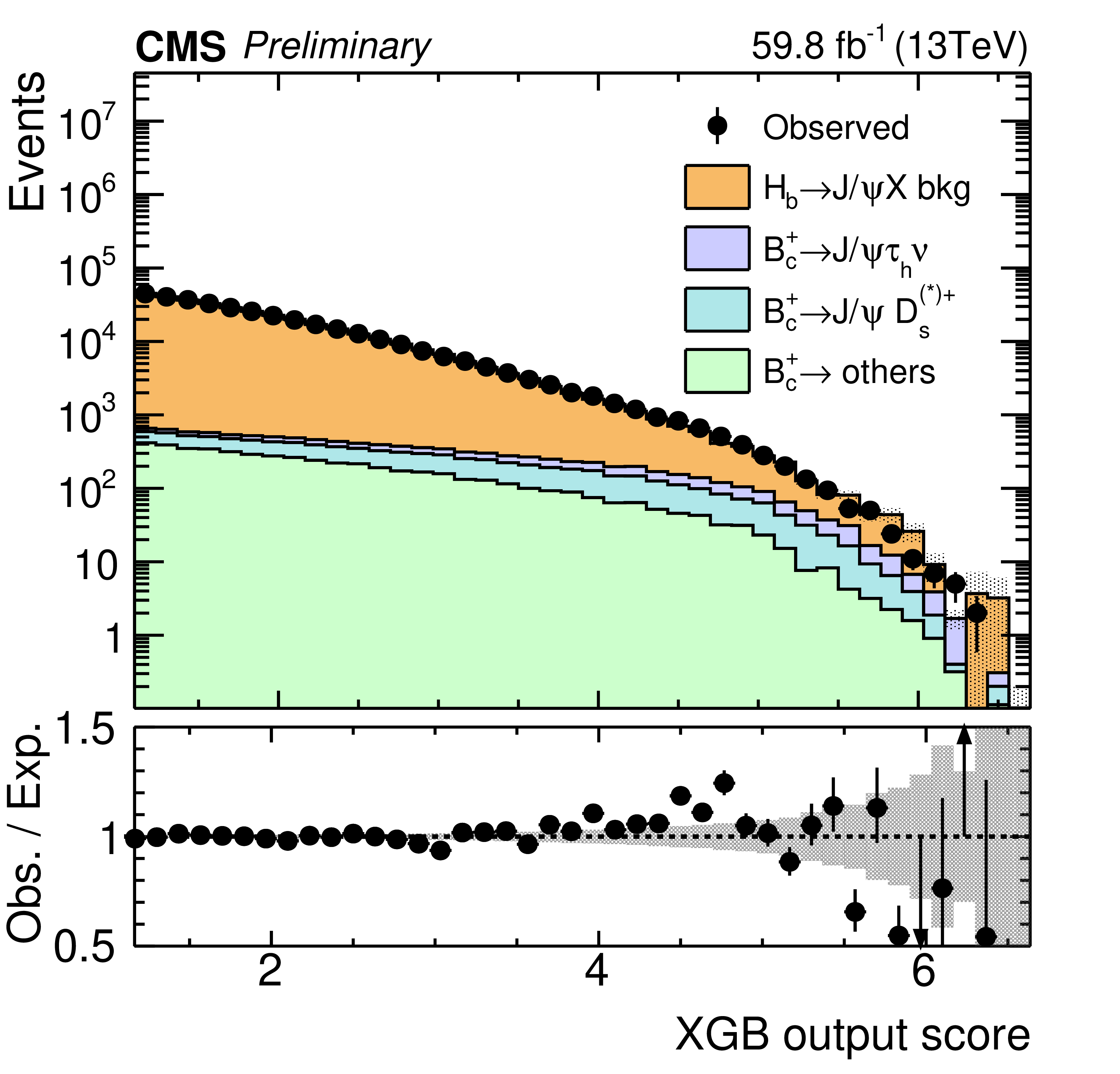 Distribution of the BDT score. The data, represented by black points, is compared to the expectations from simulations (where $ \mathrm{H}_\mathrm{b}\to{\mathrm{J}/\psi} \mathrm{X} $ shown in orange, $ \mathrm{B}_{c}^{+}\to{\mathrm{J}/\psi} \tau^{+}\nu_{\!\tau} $ in purple, $ \mathrm{B}_{c}^{+}\to{\mathrm{J}/\psi} \mathrm{D}_\mathrm{s}^{(\ast)+} $ in cyan and $ \mathrm{B}_{c}^{+}\rightarrow\mathrm{others} $ in lime green). The $ \mathrm{H}_\mathrm{b}\to{\mathrm{J}/\psi} \mathrm{X} $ simulated contribution is normalized to match the yield in data, as obtained following the application of all event selection criteria except for the BDT. The $ \mathrm{B}_{c}^{+}\to{\mathrm{J}/\psi} X $ processes are normalized according to their expectations. The ratio between the data and the expected sum of signal and background contributions is shown in the lower panel. The uncertainty displayed is statistical. |