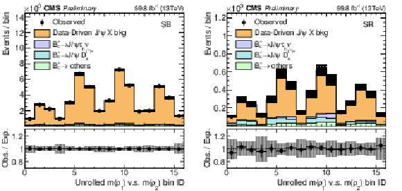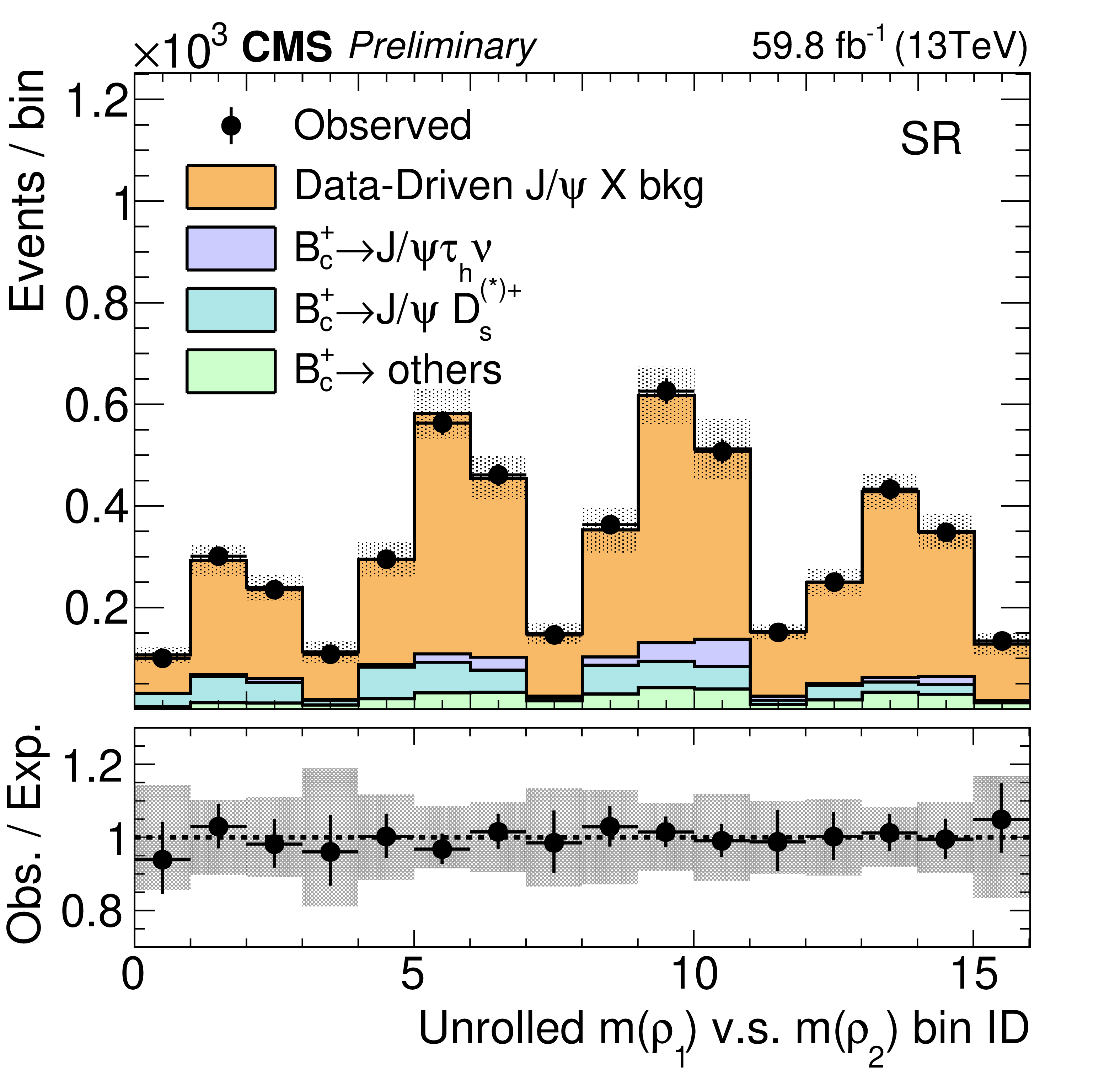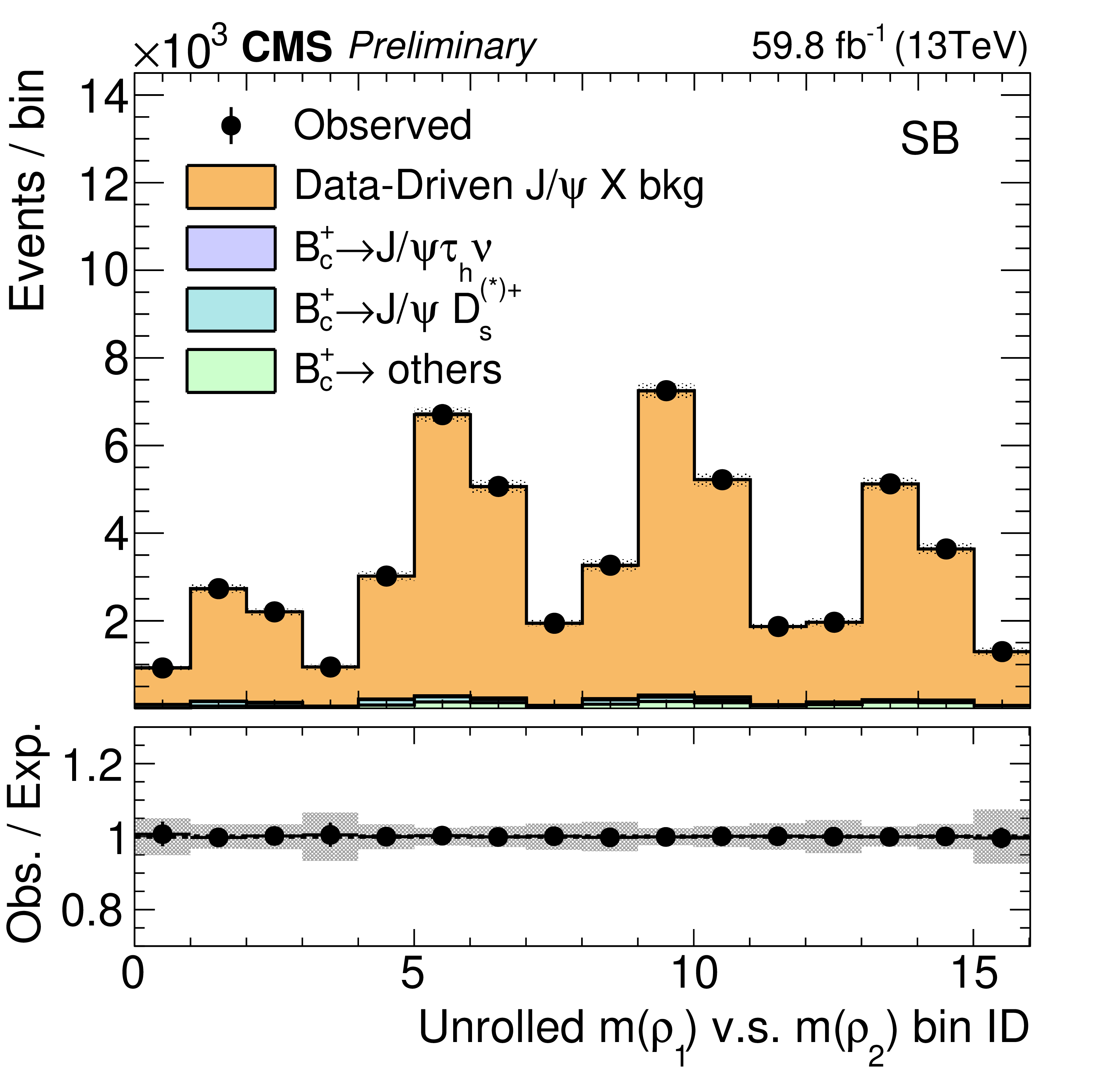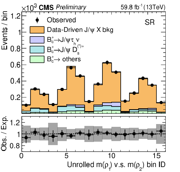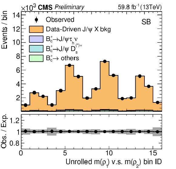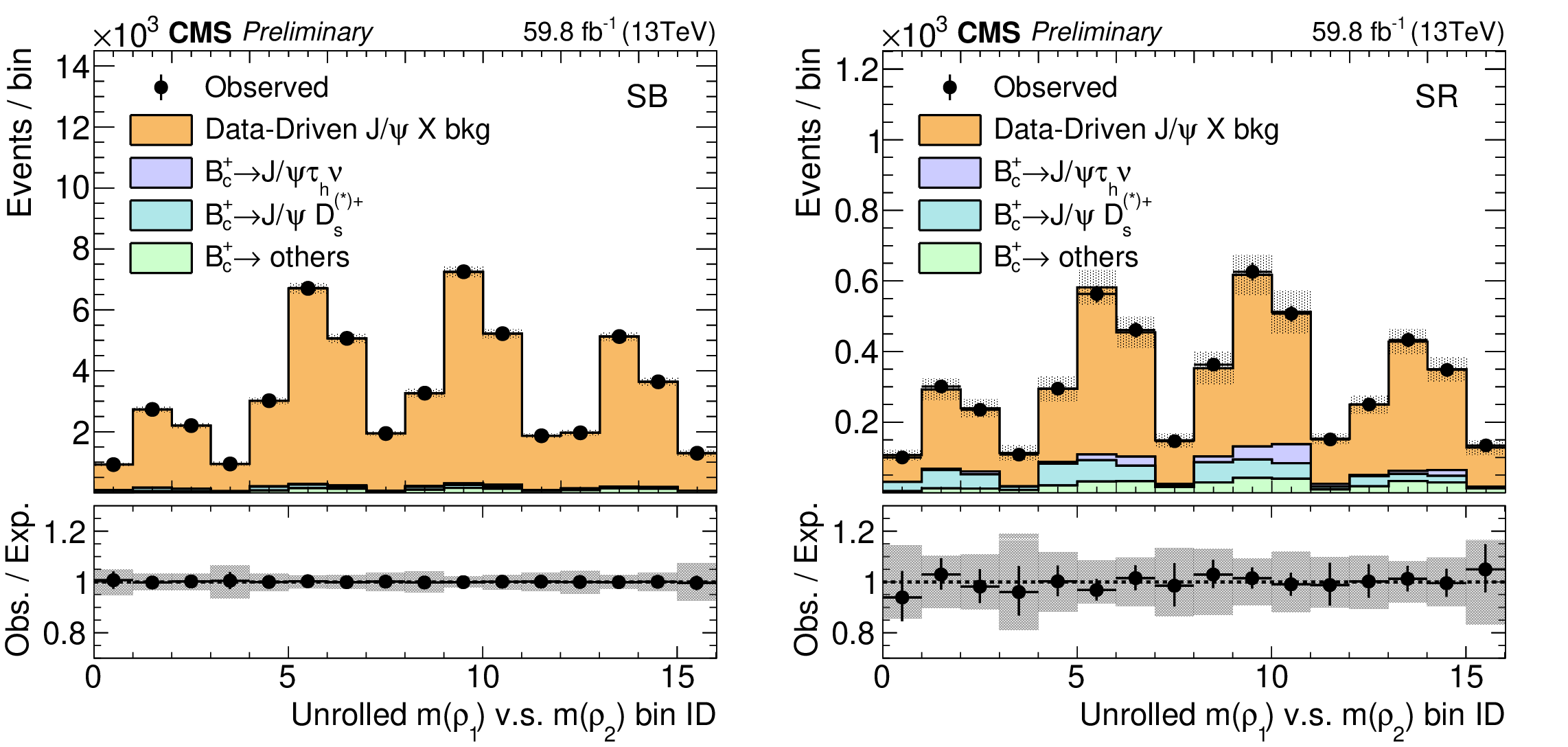 Distributions of the unrolled $ \rho^0 $ mass variable in the sideband (left) and signal-enriched (right) data regions. In each panel, data (black markers), is compared to the some of the expected yields from data-driven $ \mathrm{H}_\mathrm{b}\to{\mathrm{J}/\psi} \mathrm{X} $ background and simulation-based $ \mathrm{B}_{c}^{+}\to{\mathrm{J}/\psi} \tau^{+}\nu_{\!\tau} $, $ \mathrm{B}_{c}^{+}\to{\mathrm{J}/\psi} \mathrm{D}_\mathrm{s}^{(\ast)+} $, and $ \mathrm{B}_{c}^{+}\rightarrow\mathrm{others} $ (orange, purple, cyan, and lime green histograms, respectively). The normalization and shape parameters for the different contributions, as well as $ \mathcal{R}_{\mathrm{J}/\psi} $, are shown for their best fit values. The ratio between the data and the expected sum of signal and background contributions is shown in the lower panel of each observable. The postfit total uncertainty in the expectation is represented by the hashed band. |
