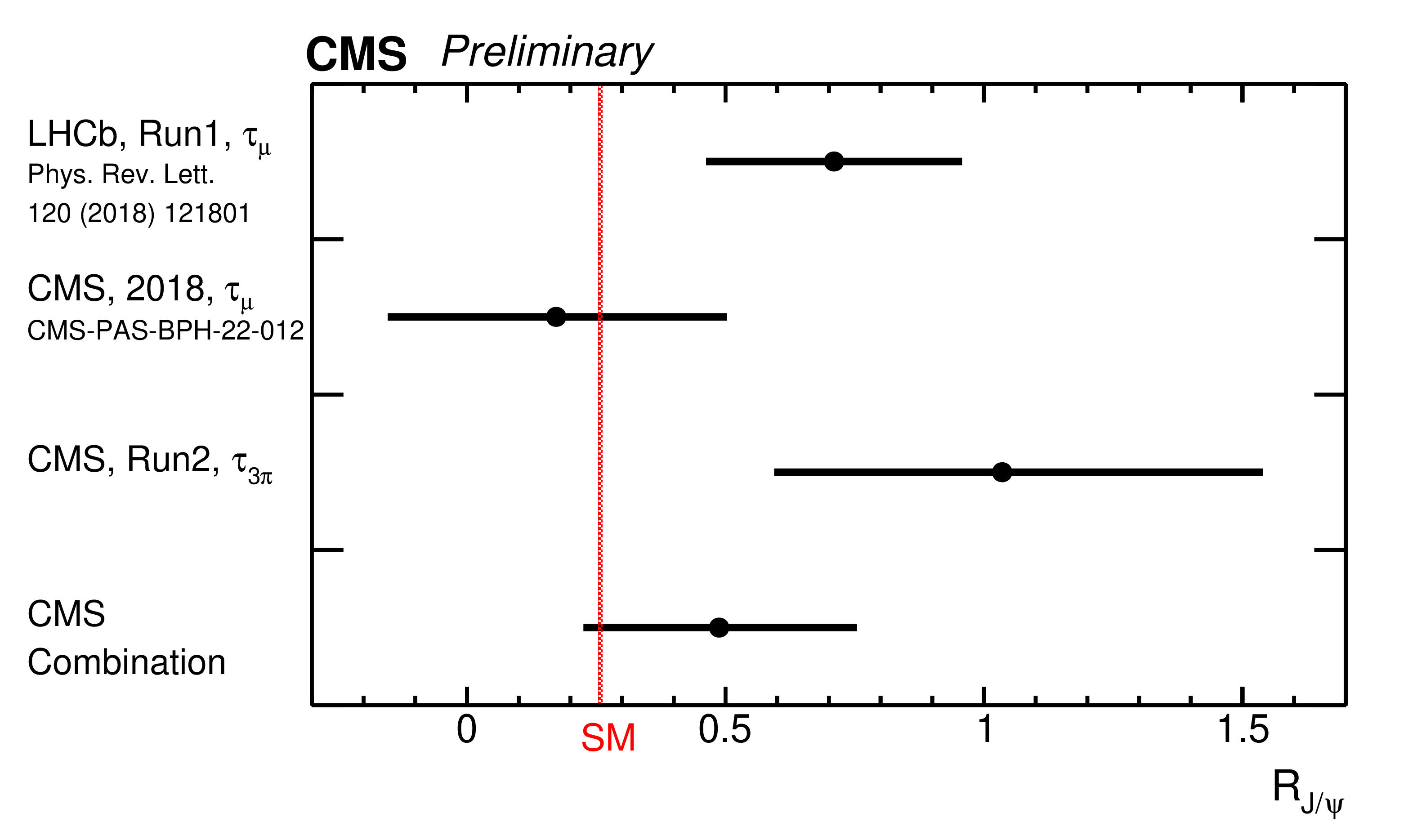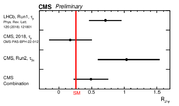 Summary of the $ \mathcal{R}_{\mathrm{J}/\psi} $ measurements. The upper row corresponds to the existing LHCb [8] measurement. The second and third row, respectively, correspond to the CMS analysis using leptonic tau decays [14] and hadronic tau decay. The last row represents the combination of the CMS analyses in the leptonic and hadronic final states. The total uncertainties are indicated by the horizontal lines. The SM value is shown as a red perpendicular line. |