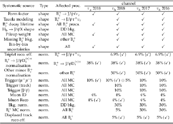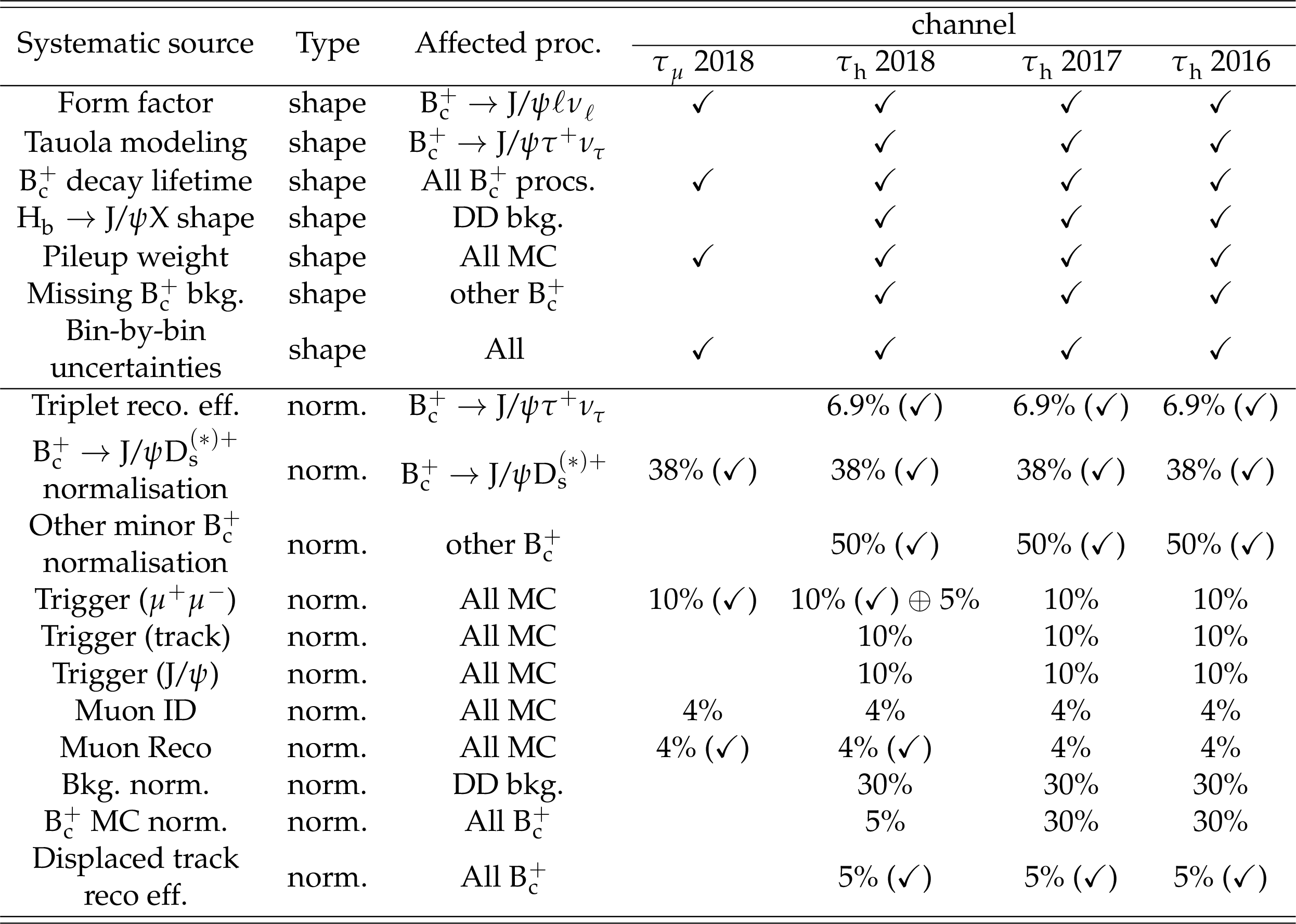 List of systematic uncertainties. The first category is for the shape and the second category is for the normalization, denoted as ``shape" and ``norm.", respectively, in the table. The presence of a check mark (\checkmark) represents nuisance parameters that are correlated among the ones that are shown in that row. The empty column denotes no corresponding nuisance parameters being assigned. The DD stands for data driven. |