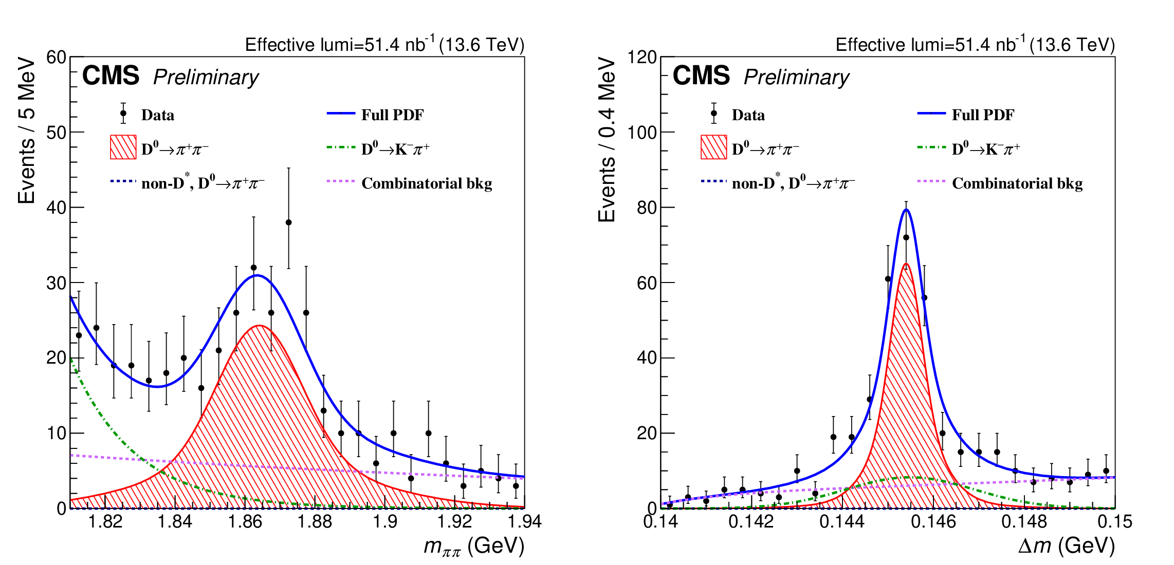 Dipion invariant mass $ m_{\pi\pi} $ (left) and $ \mathrm{D}^{*} $-$ \mathrm{D^0} $ mass difference $ \Delta m $ (right) from the reconstructed candidates from zero bias samples after MVA$_{\mathrm{D}}$ selection. |