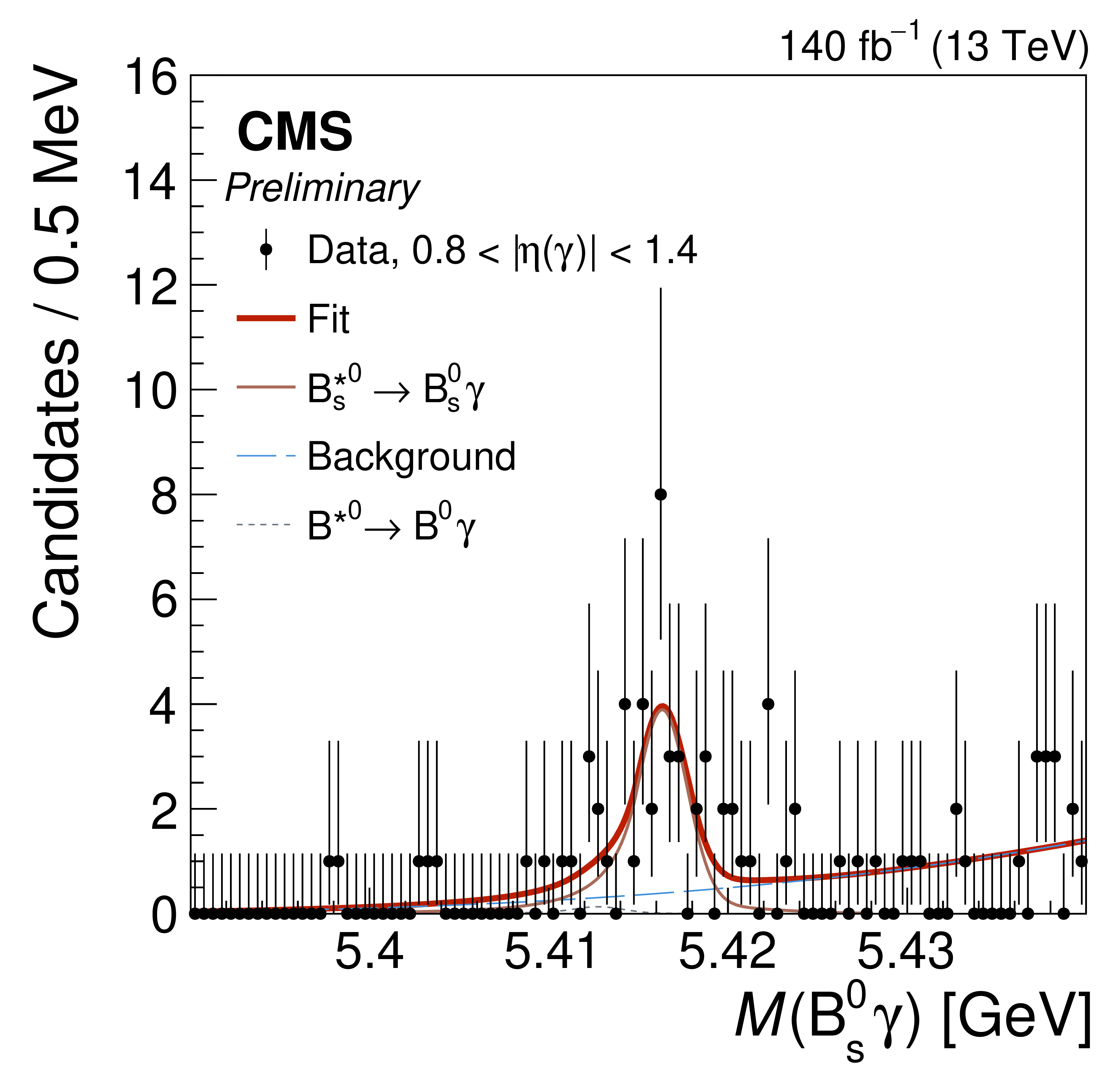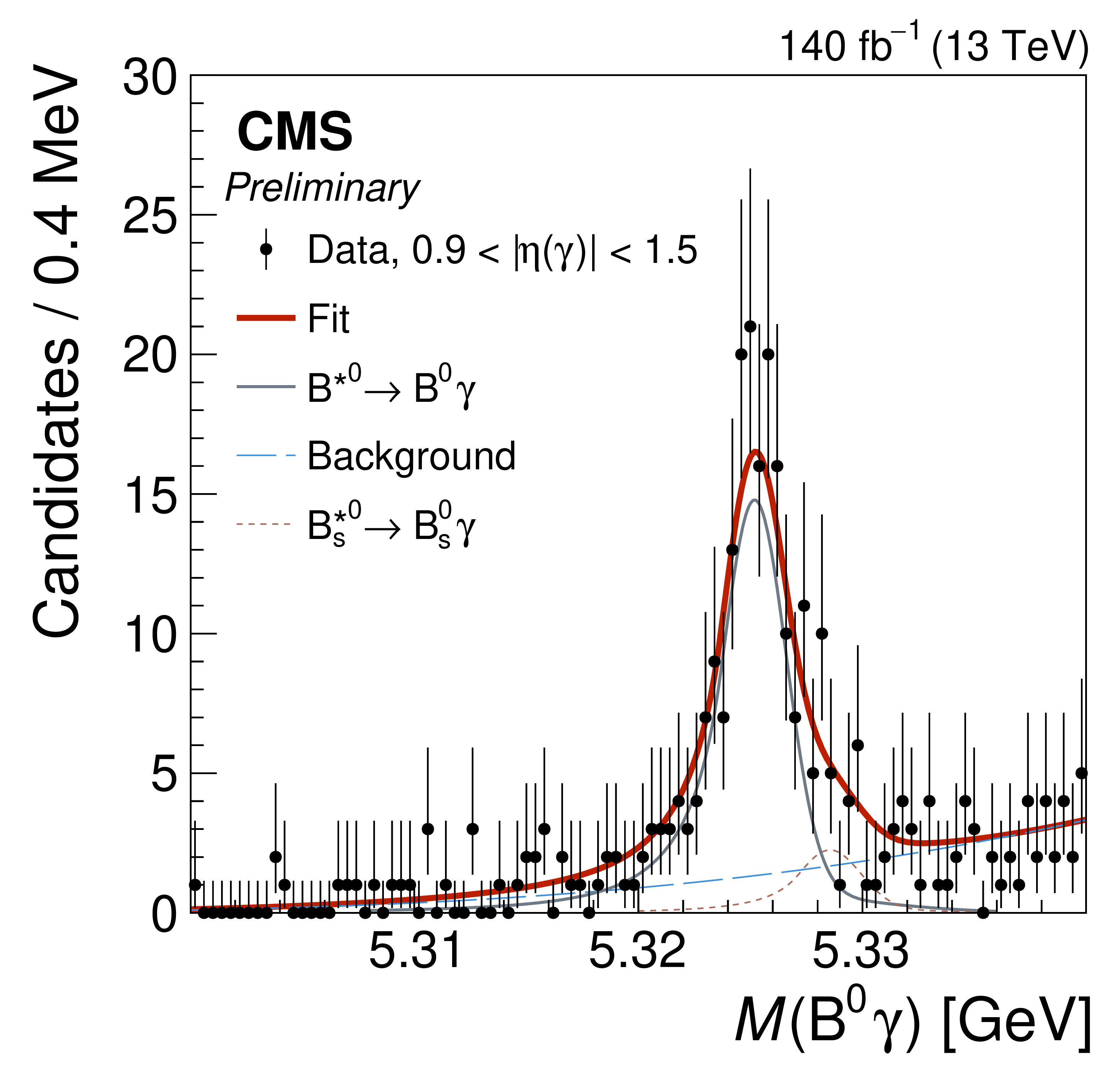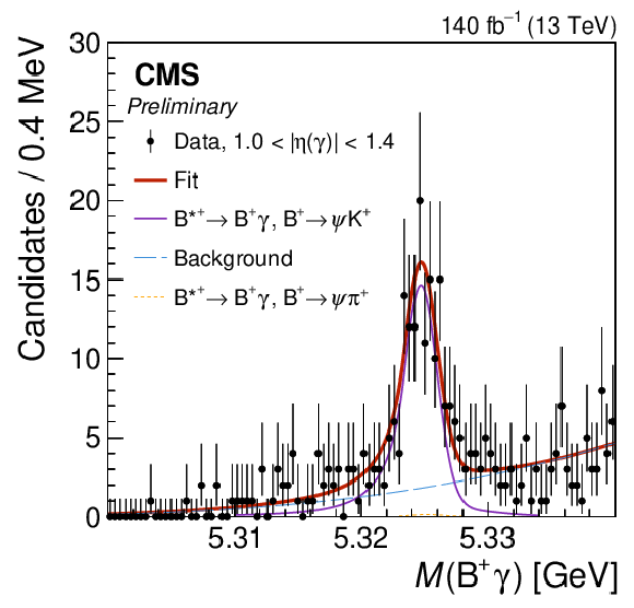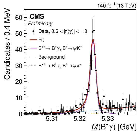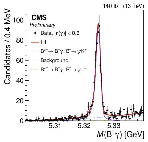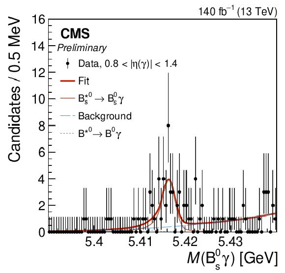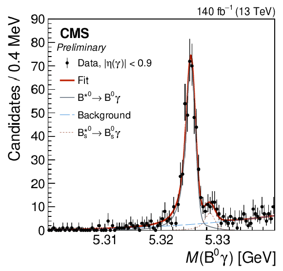 | In summary, the three vector $ {\mathrm{B}} $ meson states, $ \mathrm{B}^{*+} $, $ \mathrm{B}^{*0} $, and $ \mathrm{B}_{s}^{*0} $ have been fully reconstructed in exclusive final states for the first time, using a $ \sqrt{s}= $ 13 TeV proton-proton collision data sample corresponding to an integrated luminosity of 140 fb$^{-1}$ collected by the CMS experiment. Their masses are measured with respect to the corresponding ground states to be $ m(\mathrm{B}^{*+})-m({\mathrm{B}^{+}}) = $ 45.277 $ \pm $ 0.039 $ \pm$ 0.021 MeV, $ m(\mathrm{B}^{*0})-m({\mathrm{B}^0}) = $ 45.471 $ \pm $ 0.056 $ \pm$ 0.024 MeV, and $ m(\mathrm{B}_{s}^{*0})-m(\mathrm{B}_{s}^{0}) = $ 49.407 $ \pm $ 0.132 $ \pm$ 0.034 MeV, where the first uncertainty is statistical and the second is systematic. These results are consistent with, and an order of magnitude more precise than, the current world-average values. A number of difference and ratio measurements between the reported masses and mass differences are also provided, where both experimental and theoretical uncertainties are expected to be lower. The measurements are performed using a new conversion photon energy scale calibration method that uses the $ \pi^{0}\to\gamma\gamma $ decay reconstructed from two conversions. |