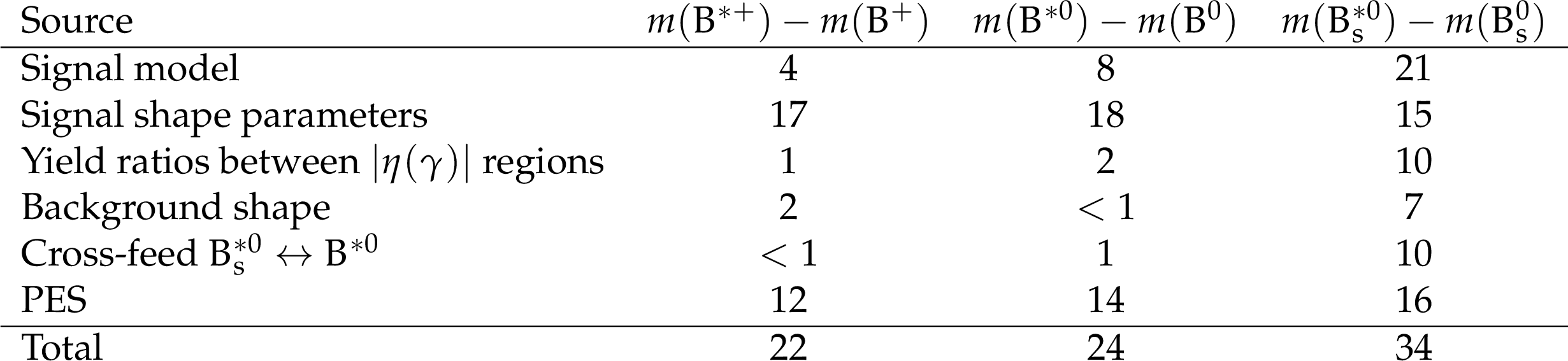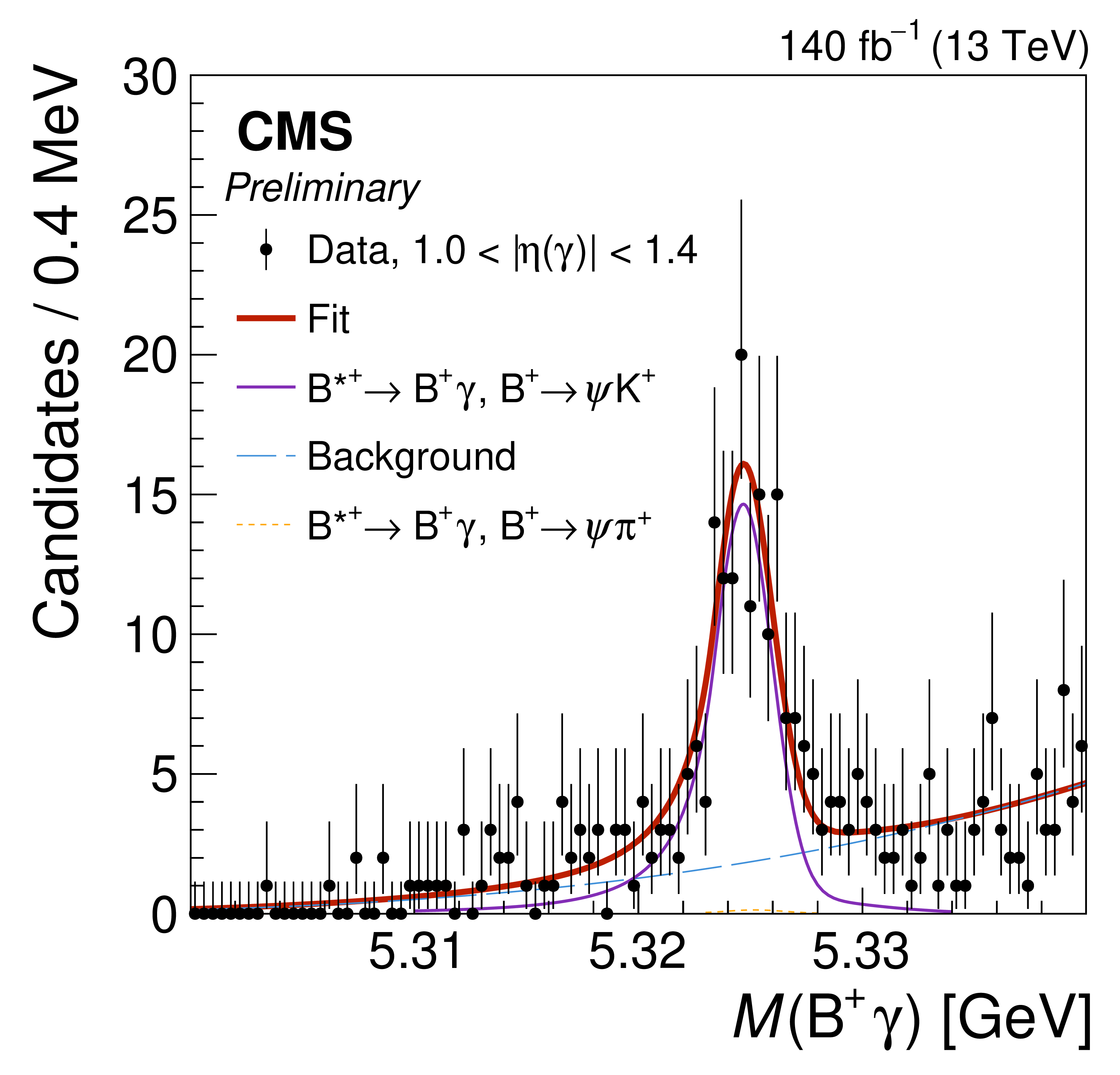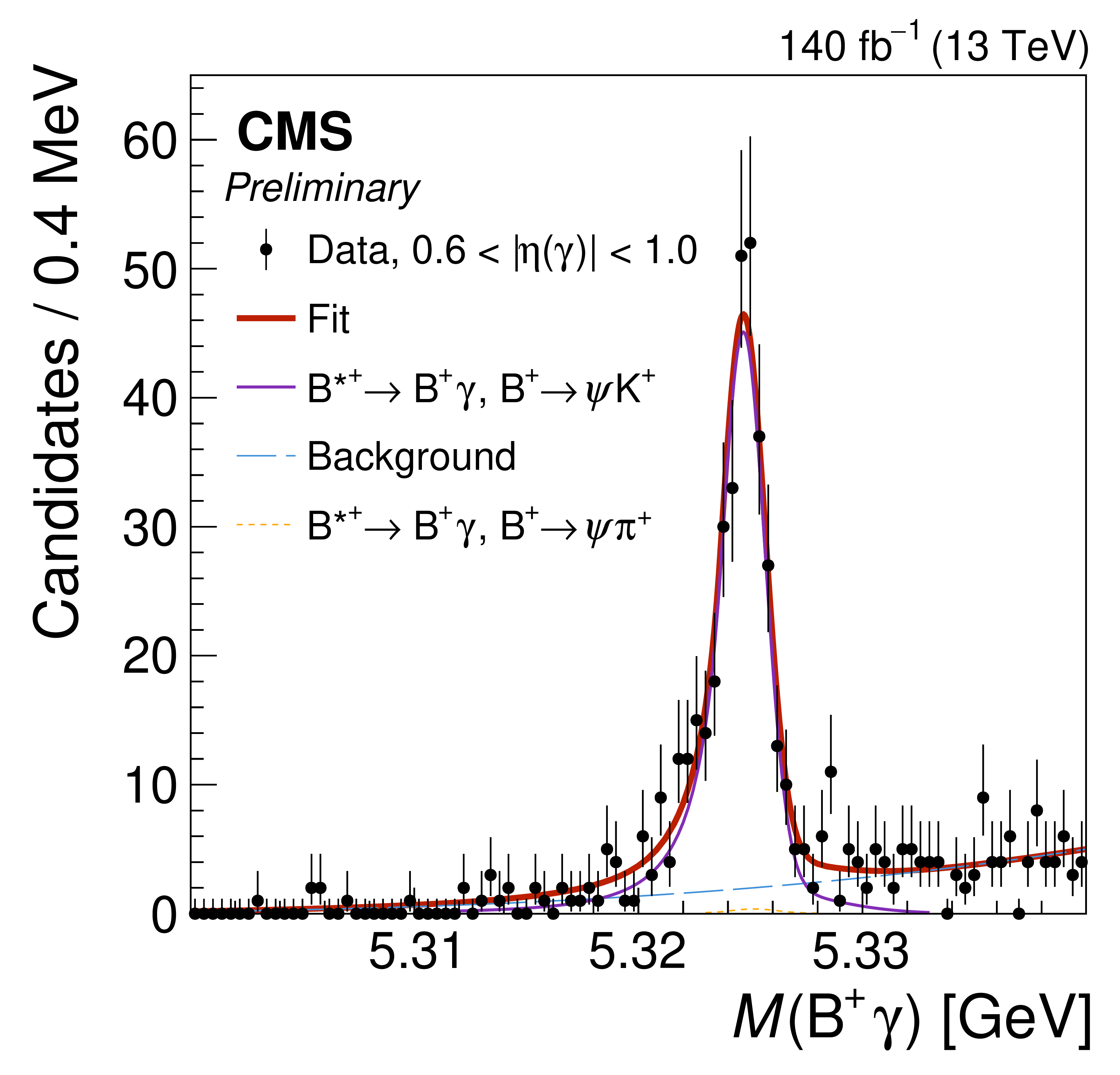 | In summary, the three vector $ {\mathrm{B}} $ meson states, $ \mathrm{B}^{*+} $, $ \mathrm{B}^{*0} $, and $ \mathrm{B}_{s}^{*0} $ have been fully reconstructed in exclusive final states for the first time, using a $ \sqrt{s}= $ 13 TeV proton-proton collision data sample corresponding to an integrated luminosity of 140 fb$^{-1}$ collected by the CMS experiment. Their masses are measured with respect to the corresponding ground states to be $ m(\mathrm{B}^{*+})-m({\mathrm{B}^{+}}) = $ 45.277 $ \pm $ 0.039 $ \pm$ 0.021 MeV, $ m(\mathrm{B}^{*0})-m({\mathrm{B}^0}) = $ 45.471 $ \pm $ 0.056 $ \pm$ 0.024 MeV, and $ m(\mathrm{B}_{s}^{*0})-m(\mathrm{B}_{s}^{0}) = $ 49.407 $ \pm $ 0.132 $ \pm$ 0.034 MeV, where the first uncertainty is statistical and the second is systematic. These results are consistent with, and an order of magnitude more precise than, the current world-average values. A number of difference and ratio measurements between the reported masses and mass differences are also provided, where both experimental and theoretical uncertainties are expected to be lower. The measurements are performed using a new conversion photon energy scale calibration method that uses the $ \pi^{0}\to\gamma\gamma $ decay reconstructed from two conversions. |