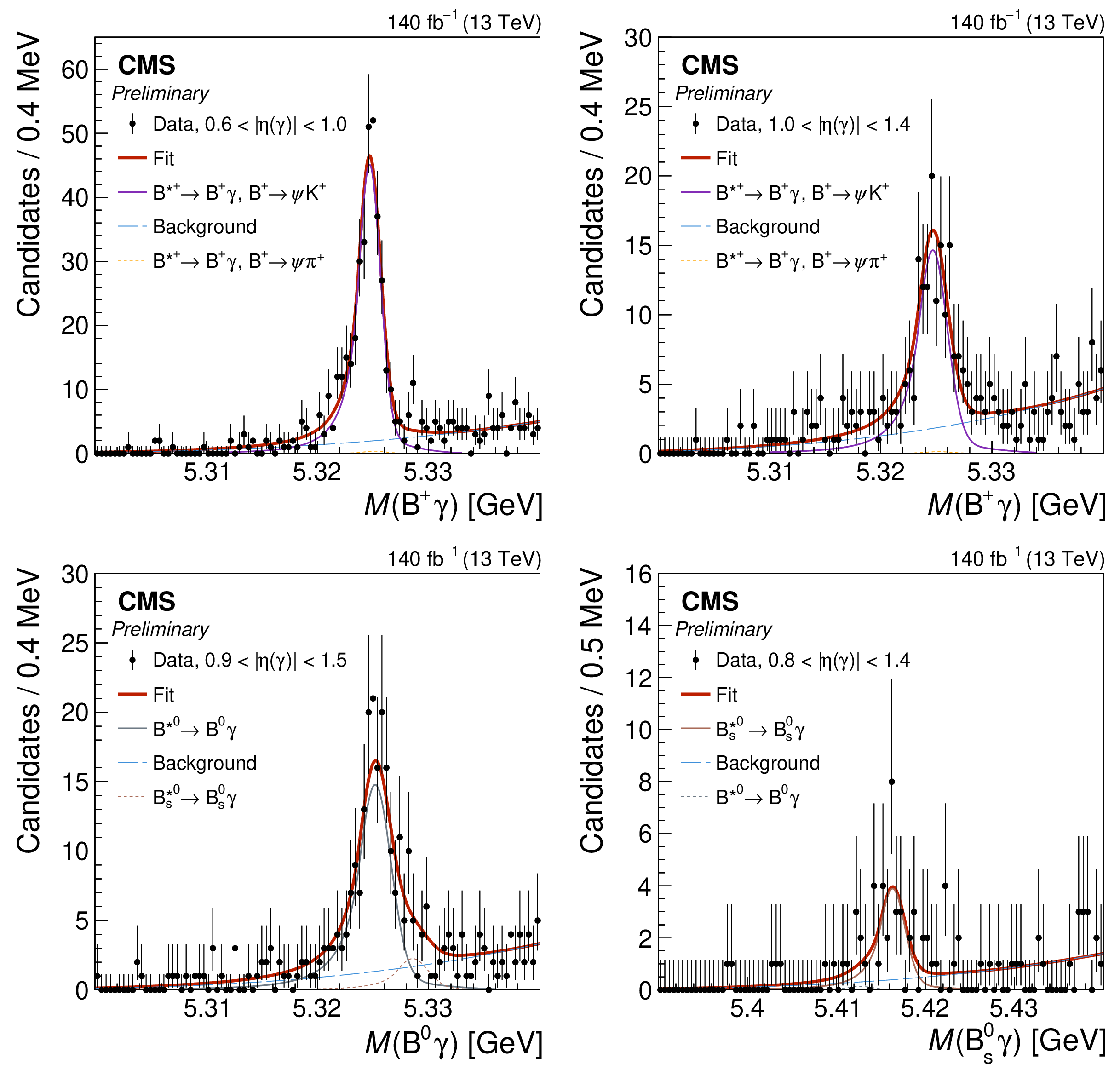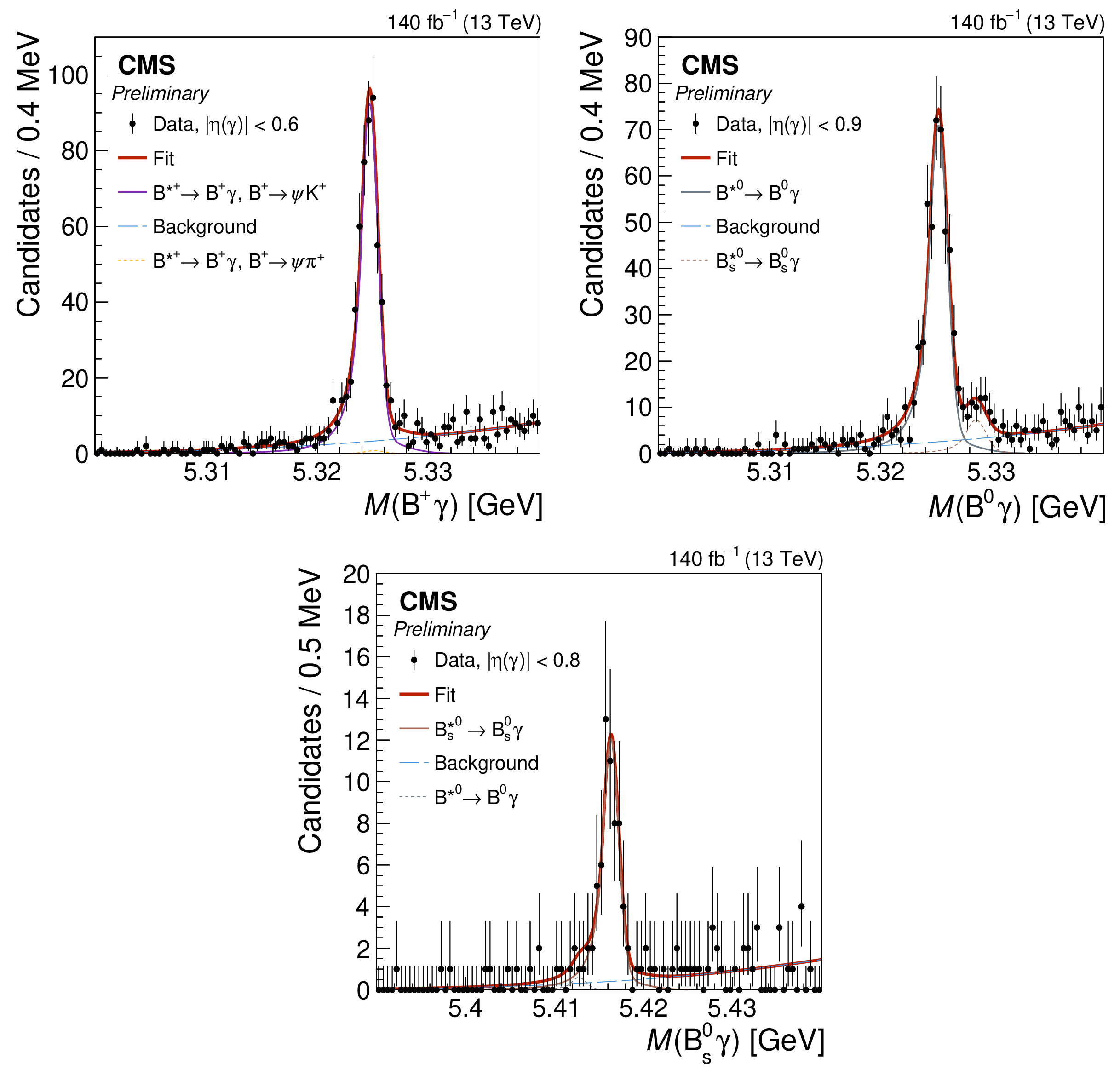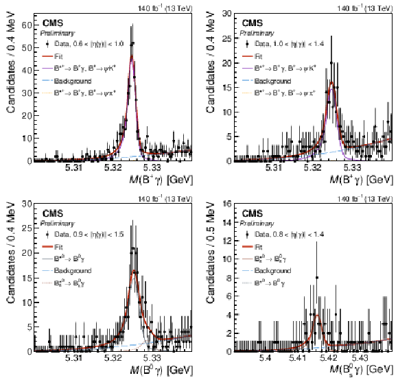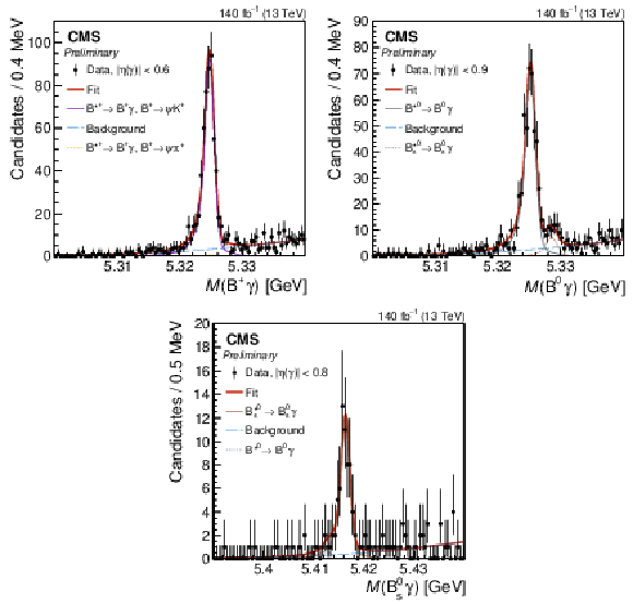 The measured distributions (black dots) of the $ {\mathrm{B}^{+}}\gamma $ (upper left), $ {\mathrm{B}^0}\gamma $ (upper right), and $ \mathrm{B}_{s}^{0}\gamma $ (lower) invariant mass in the lowest $ |\eta(\gamma)| $ range, which has the best invariant mass resolution. The simultaneous fit projections are shown with thick red lines, and various components are described in the legends. |