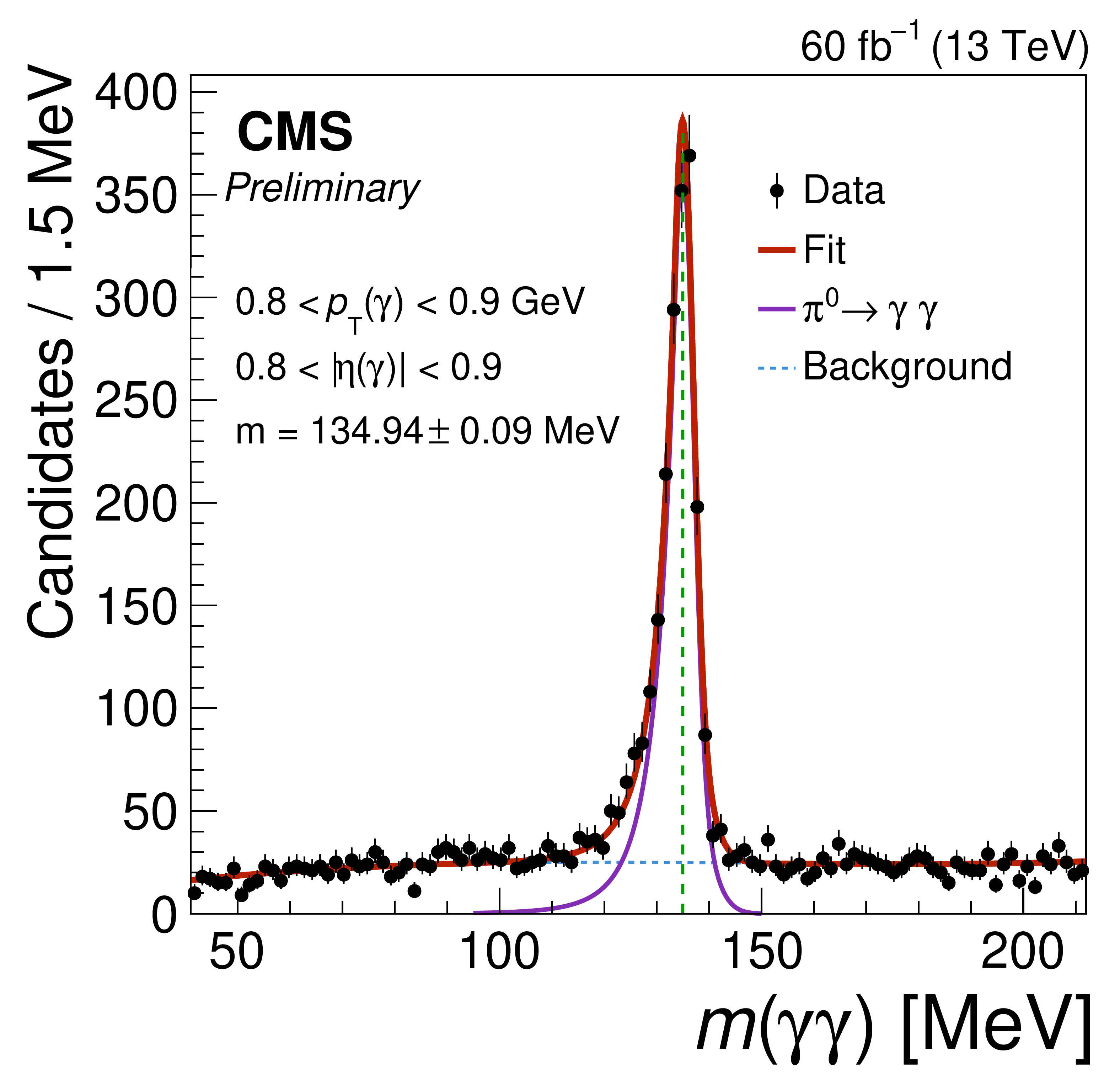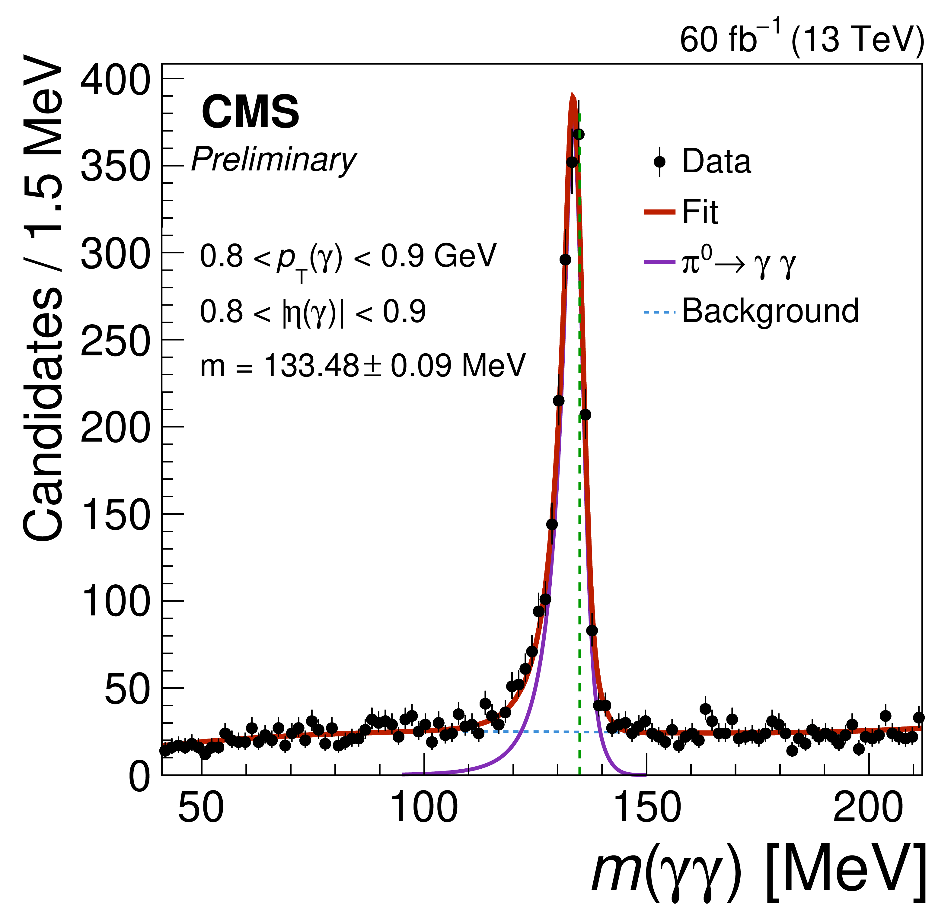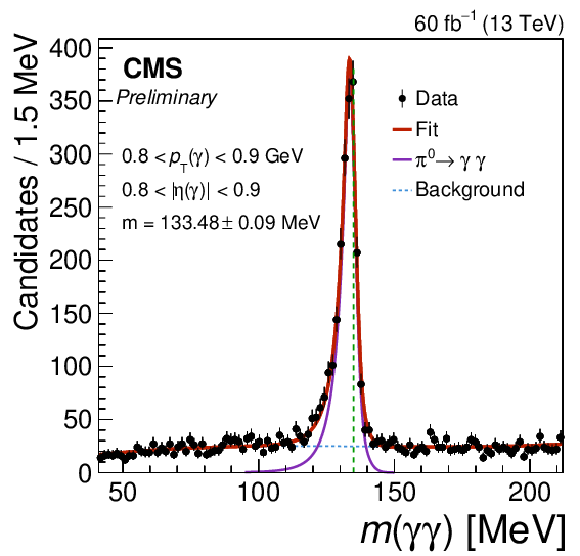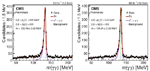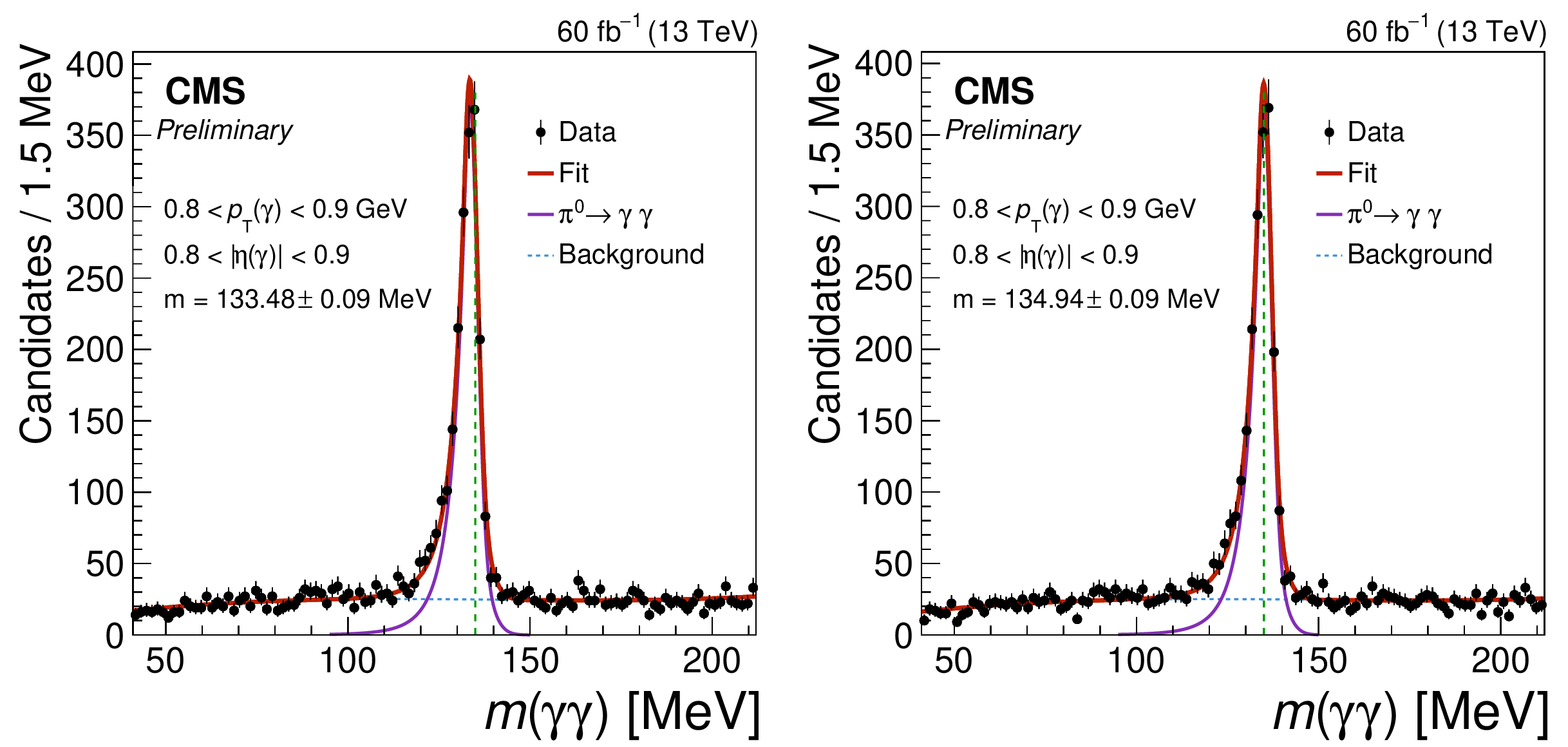 The measured distributions of the diphoton invariant mass near the $ \pi^{0} $ mass with the fit results overlaid, before (left) and after (right) the PES correction, in the kinematic range 0.8 $ < p_{\mathrm{T}}(\gamma) < $ 0.9 GeV, 0.8 $ < |\eta(\gamma)| < $ 0.9. The green vertical line shows the world-average value of the $ \pi^{0} $ mass of 134.977 MeV [24]. |