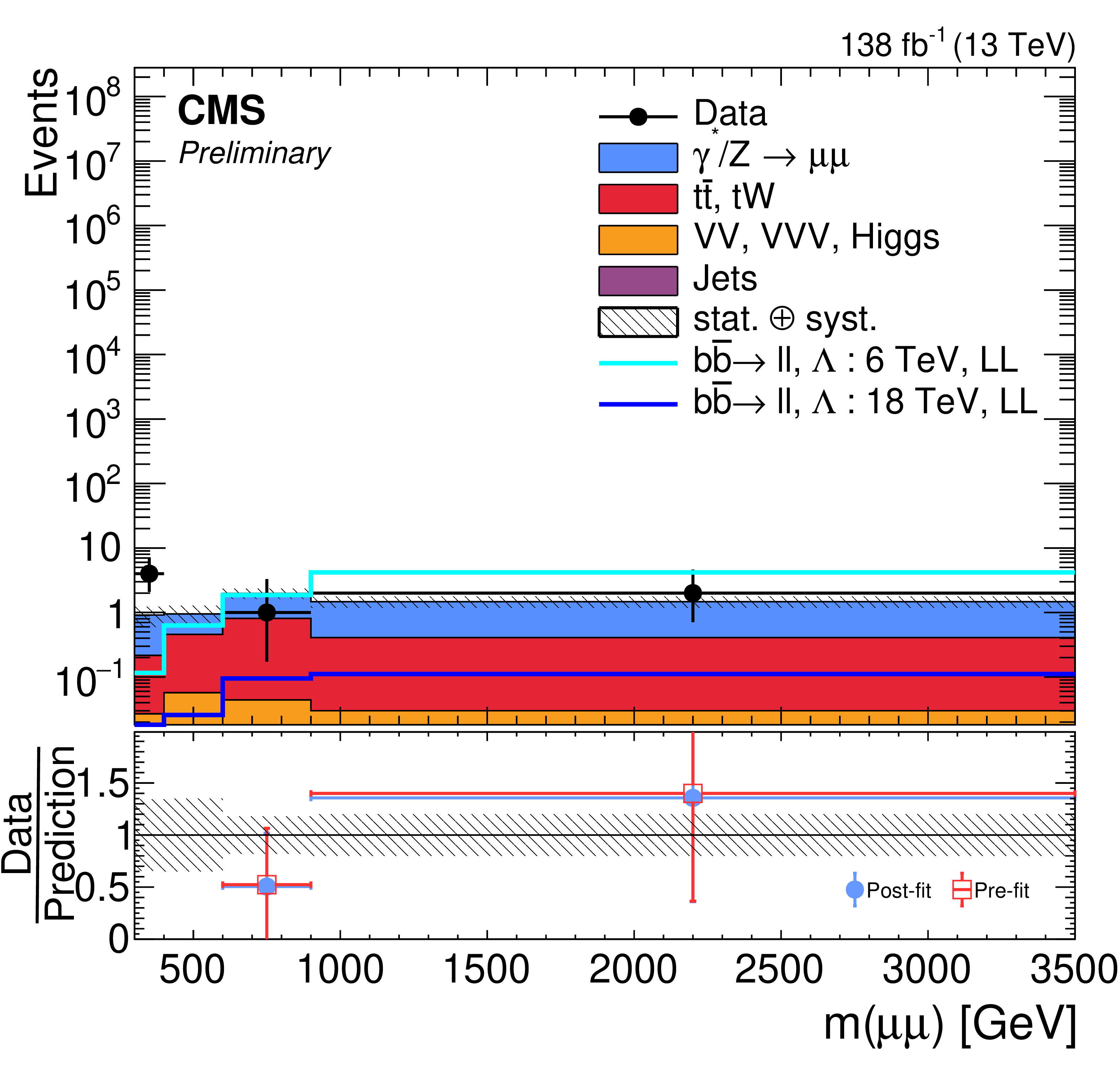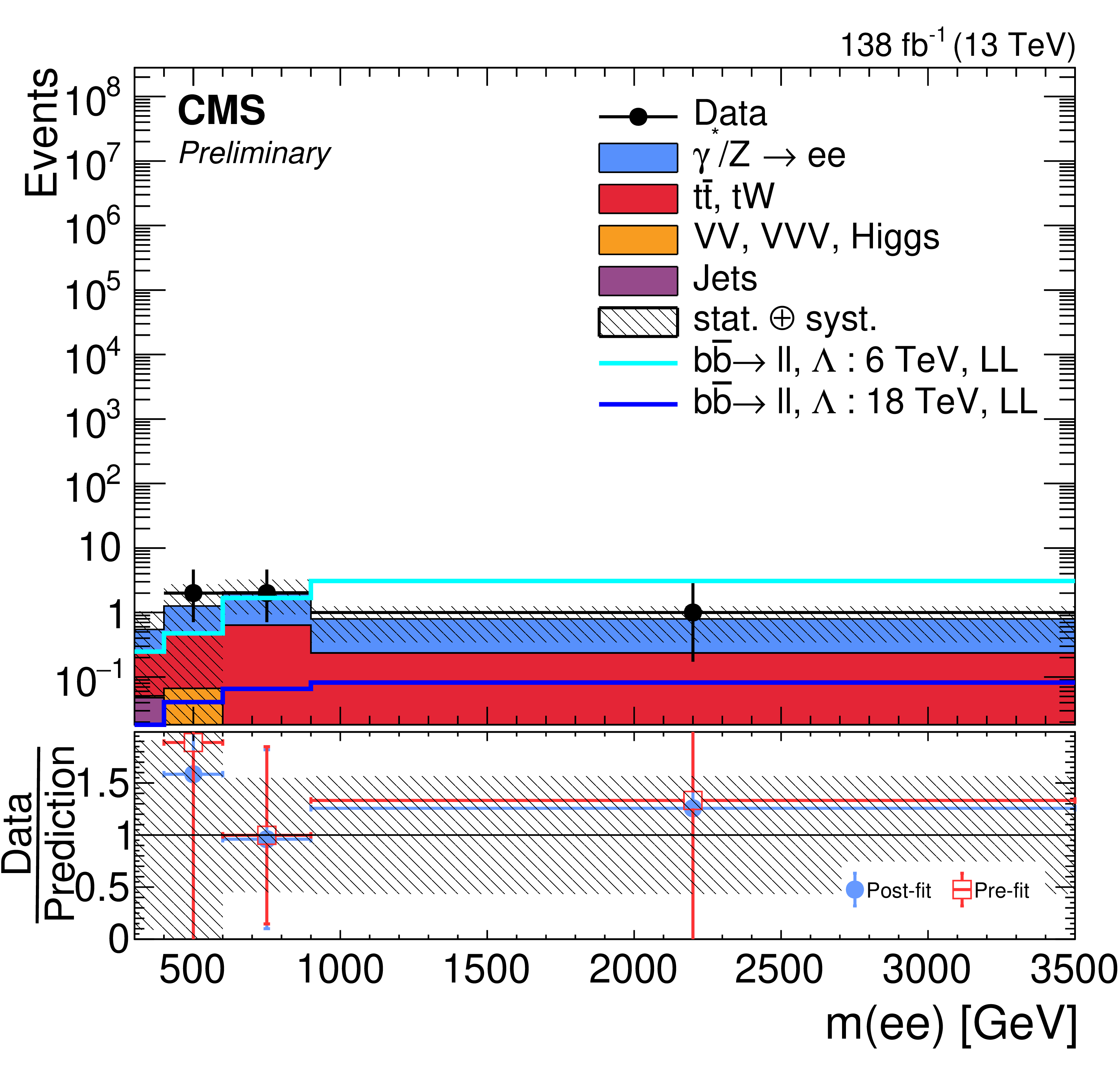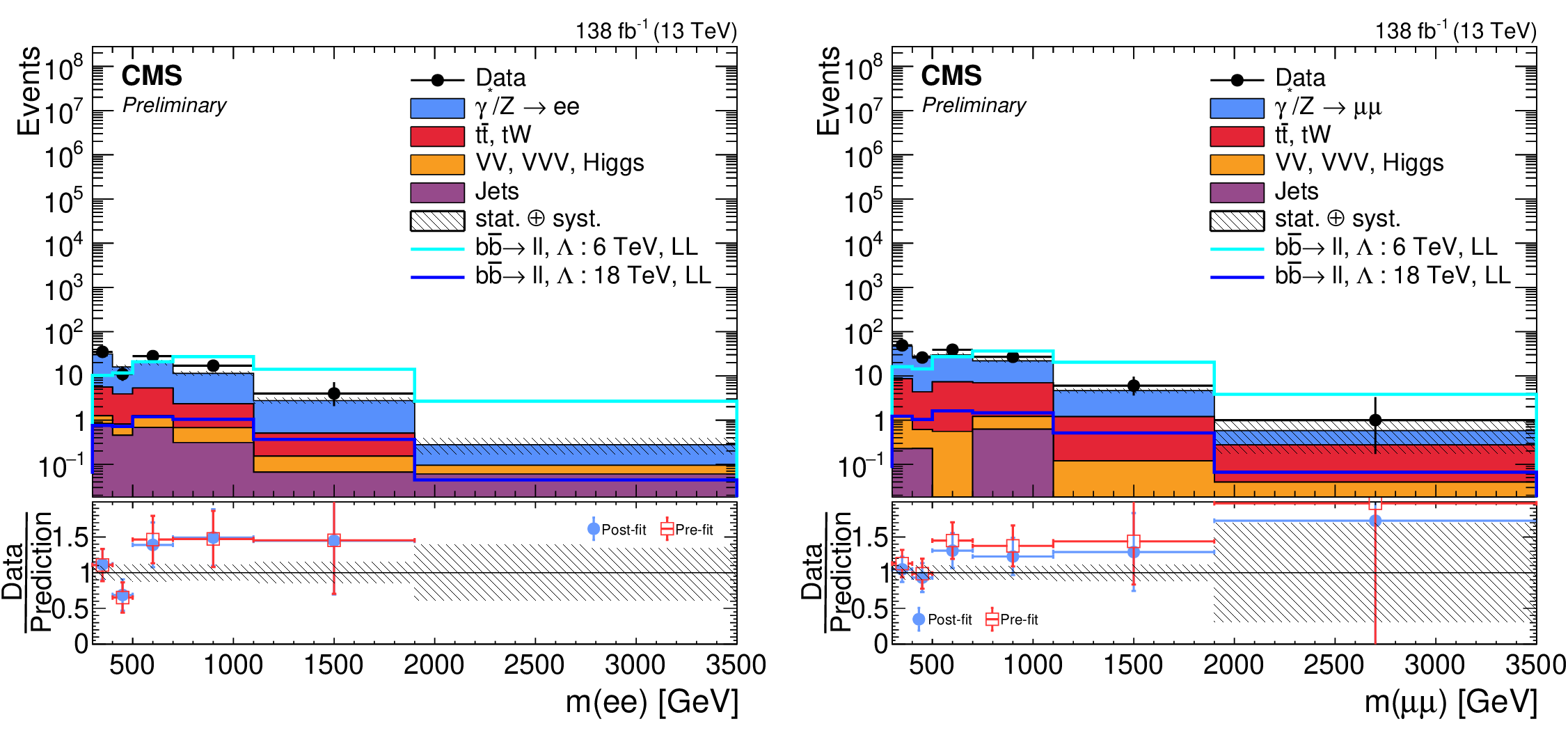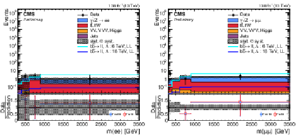 Observed $ m_{\ell\ell} $ for the data, and the post-fit backgrounds (stacked histograms), in the signal region for $ \mathrm{e}\mathrm{e} $ + $ > $1 b jet (left) and $ \mu\mu $ + $ > $1 b jet (right) channels. The lower panels show ratios of the data to the pre-fit background prediction and post-fit background yield as red open squares and blue points, respectively. The dashed band in the lower panels indicates the systematic component of the post-fit uncertainty. The solid lines in the upper panel corresponds to the $ \mathrm{b}\mathrm{b}\ell\ell $ signal expectation, for $ \Lambda = $ 6 TeV and 18 TeV. |