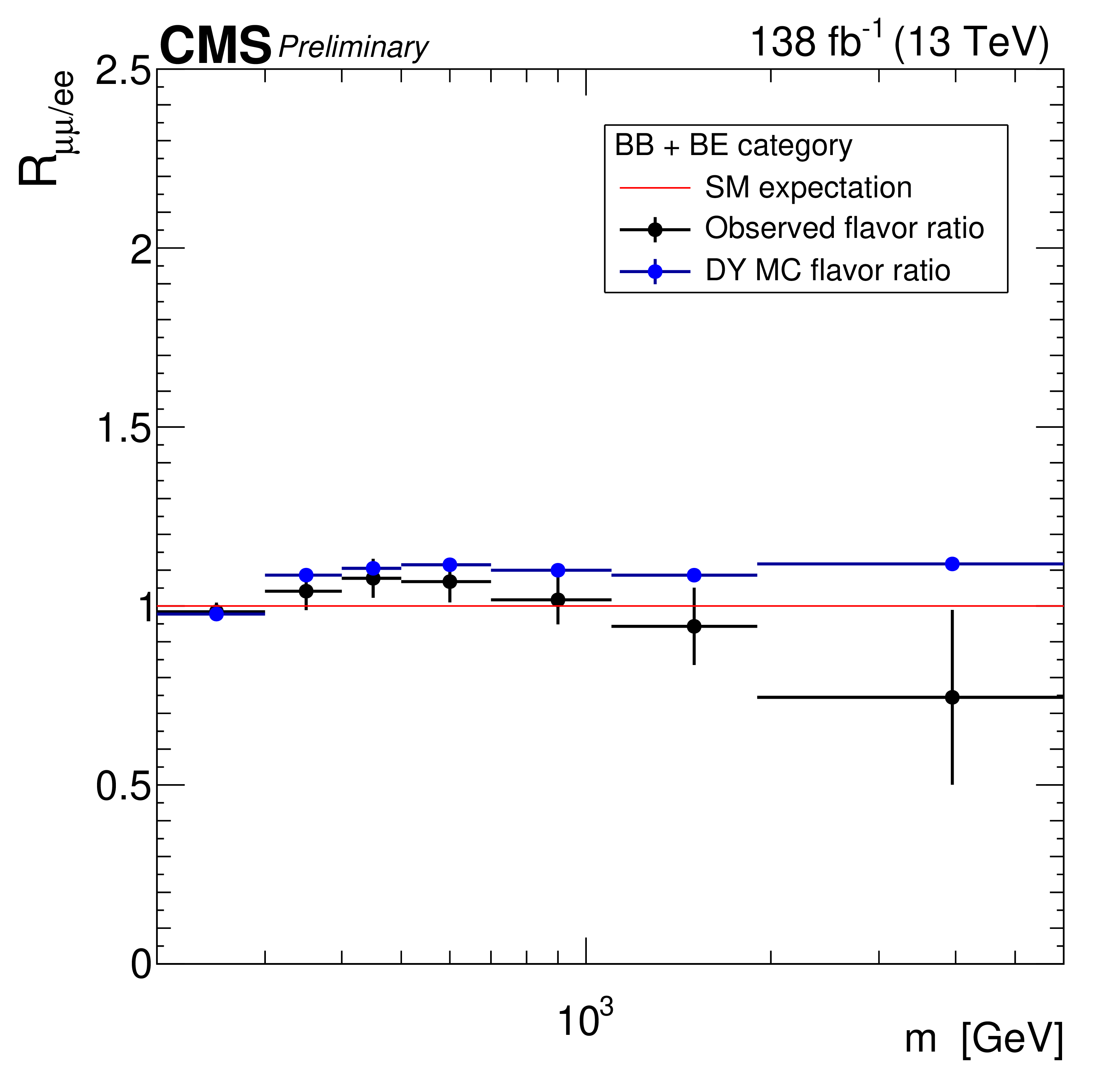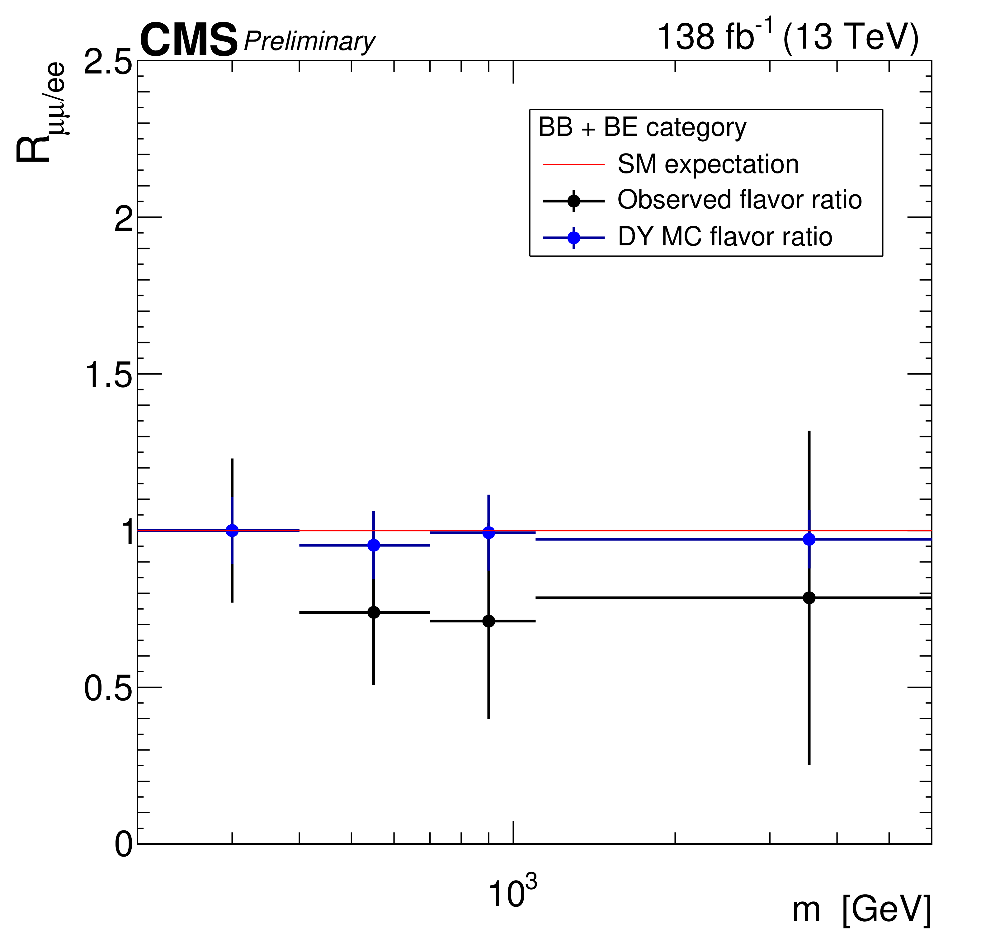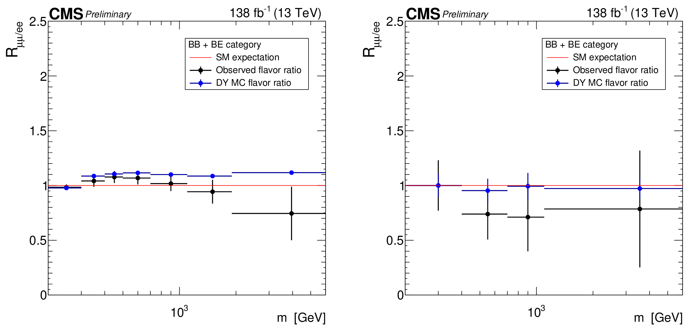 Ratio of the differential dilepton production cross section in the dimuon and dielectron channels as a function of dilepton mass in 0b final state (left) and 1b + 2b final state (right). The ratio is obtained after correcting the reconstructed mass spectra to particle level. The error bars include both statistical and systematic uncertainties. |