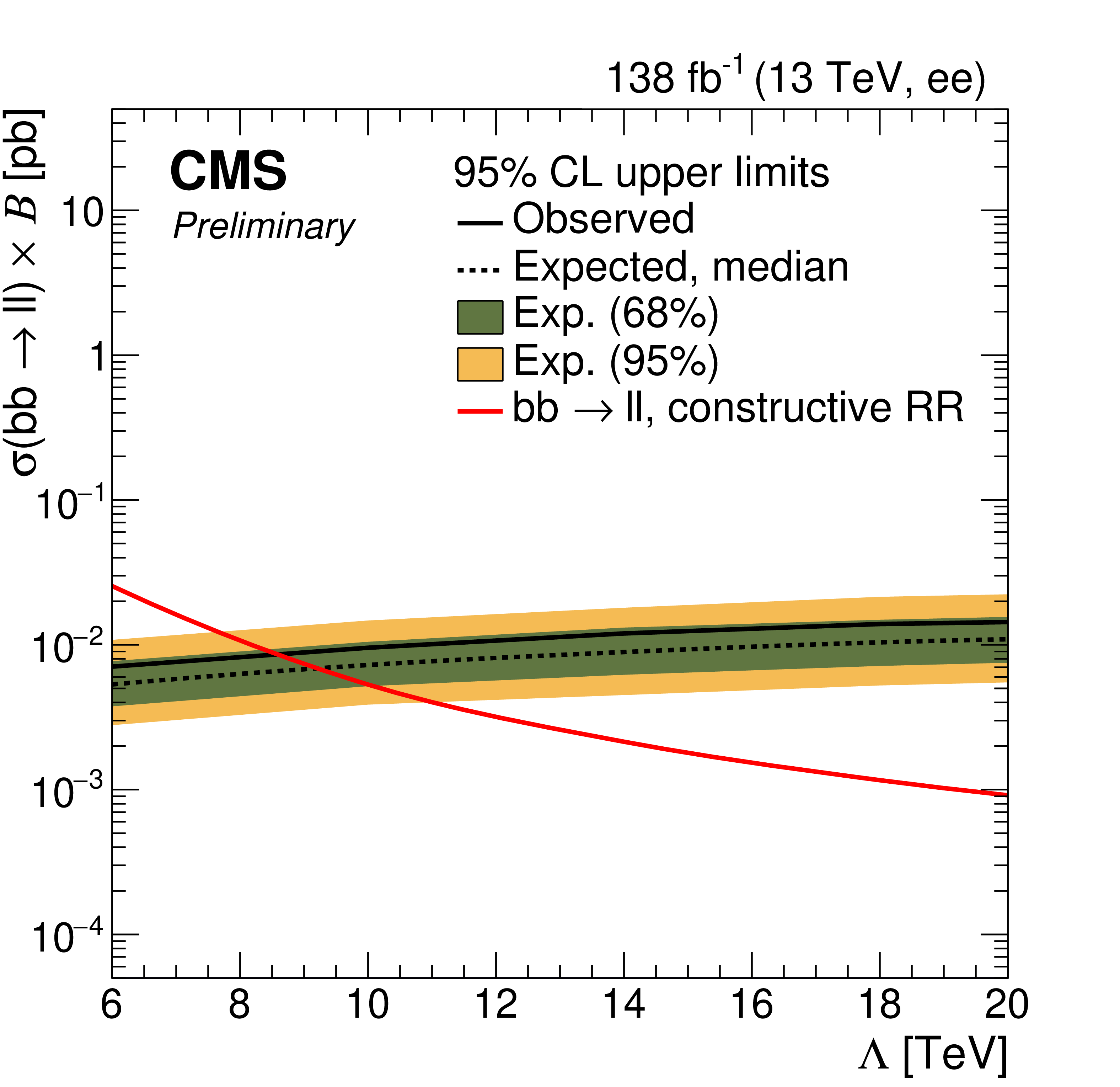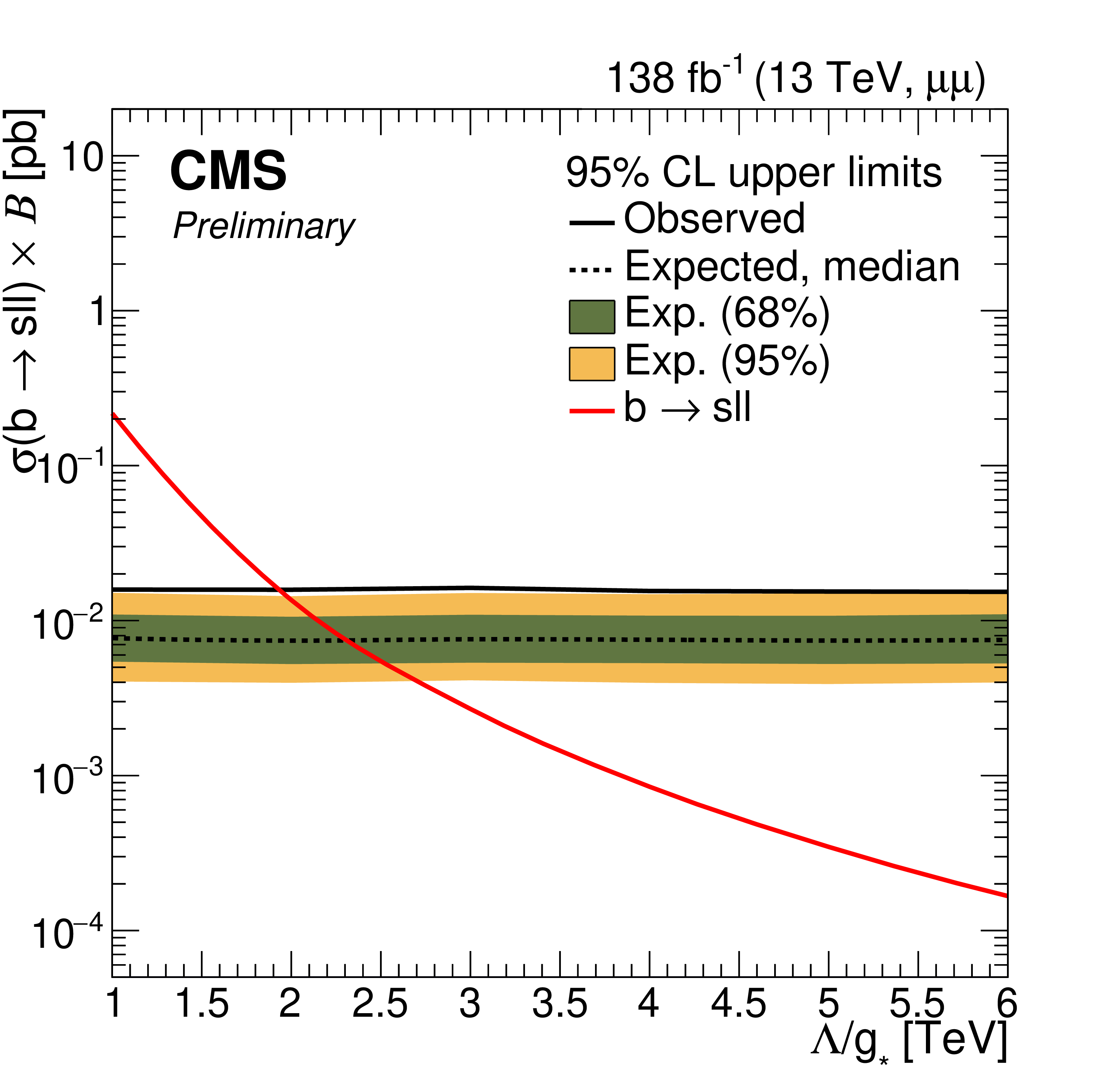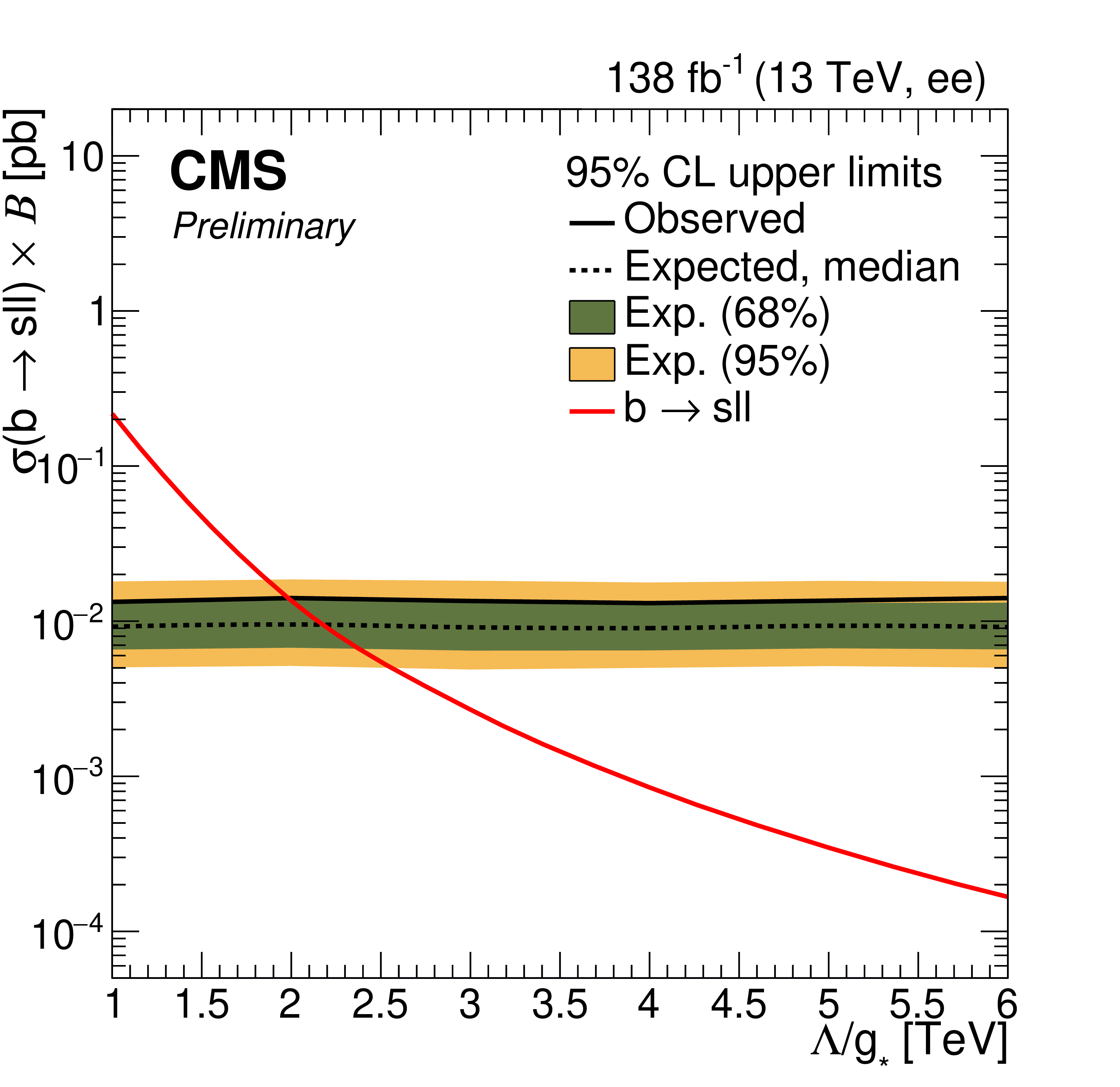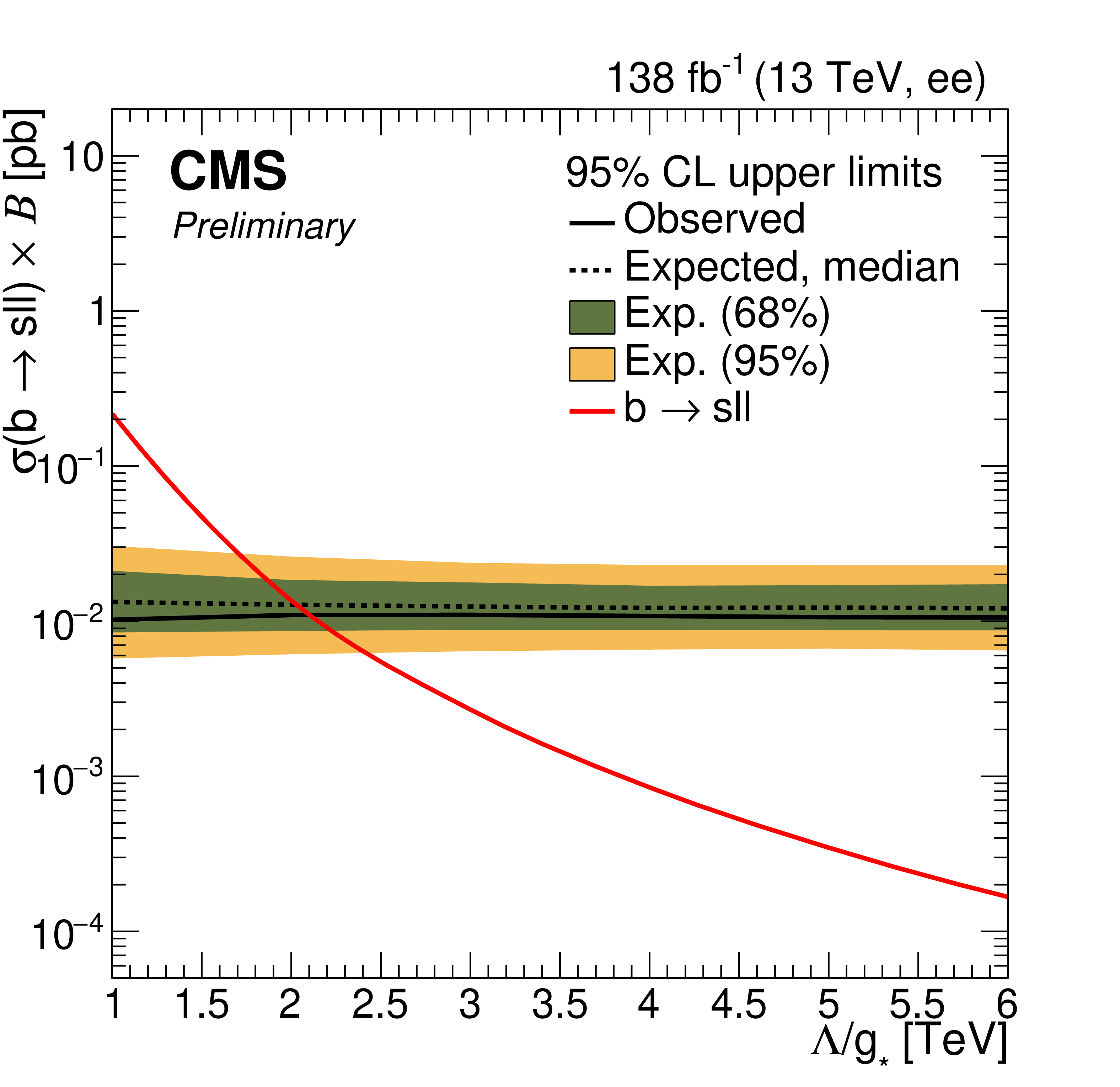 Upper limits at 95% CL on the product of the production cross section and the branching fraction for $ \mathrm{b}\mathrm{s}\ell\ell $ signal in $ \mathrm{e}\mathrm{e} $ channel (left) and $ \mu\mu $ channel (right) with 0 b-tagged jets. The shaded bands correspond to the 68 and 95% quantiles for the expected limits. The red line corresponds to the theoretical predictions for the $ \mathrm{b}\mathrm{s}\ell\ell $ signal. |
