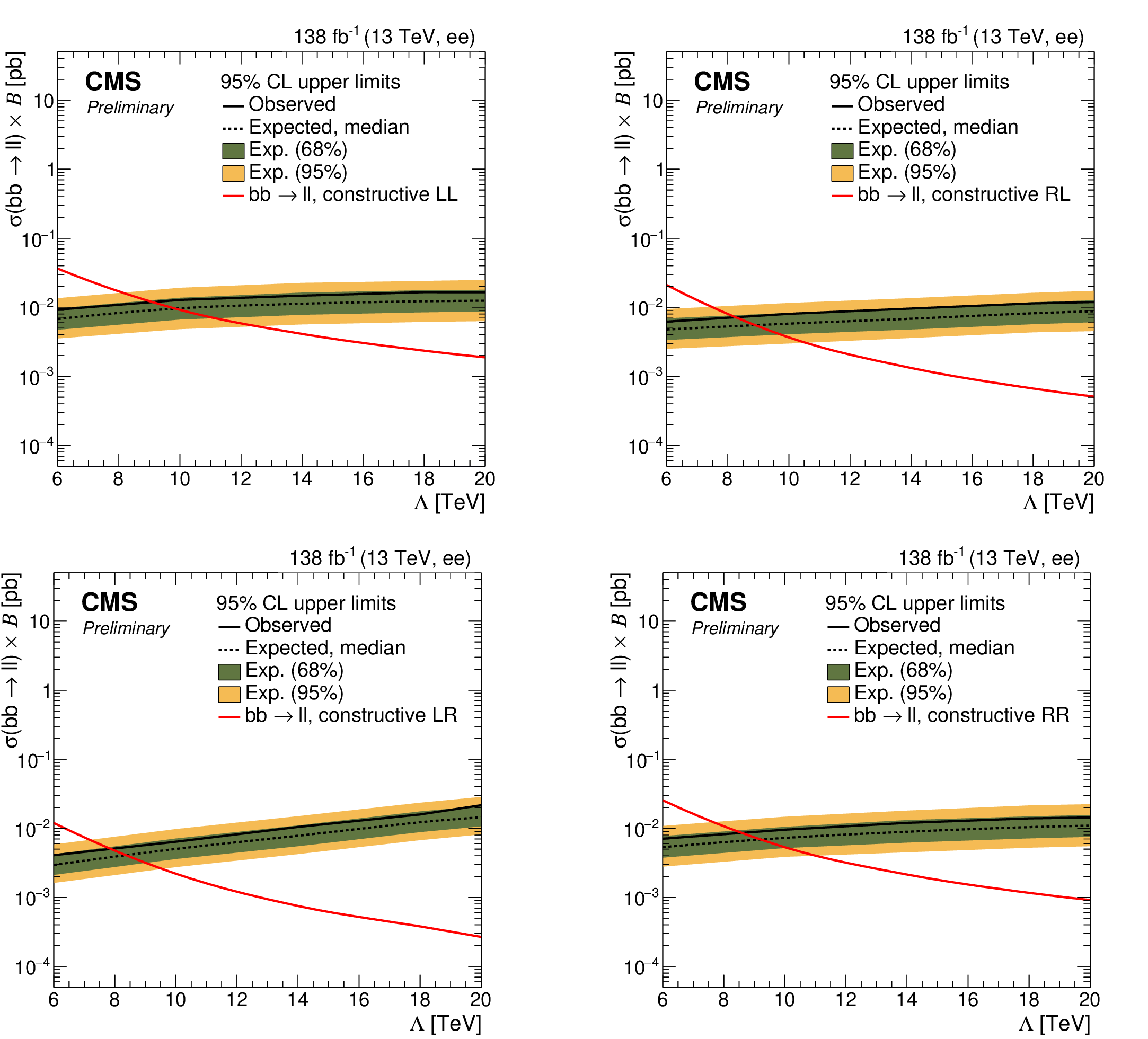 Upper limits at 95% CL on the product of the production cross section and the branching fraction for $ \mathrm{b}\mathrm{b}\ell\ell $ signal with different chirality condition in $ \mathrm{e}\mathrm{e} $ channel with $ \geq $ 0 b-tagged jets. The shaded bands correspond to the 68 and 95% quantiles for the expected limits. The red line corresponds to the theoretical predictions for the $ \mathrm{b}\mathrm{b}\ell\ell $ signal. |