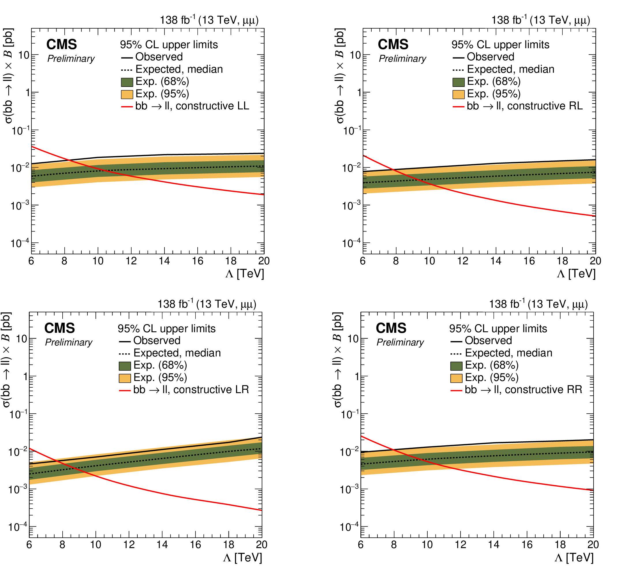 Upper limits at 95% CL on the product of the production cross section and the branching fraction for $ \mathrm{b}\mathrm{b}\ell\ell $ signal with different chirality condition in $ \mu\mu $ channel with $ \geq $ 0 b-tagged jets. The shaded bands correspond to the 68 and 95% quantiles for the expected limits. The red line corresponds to the theoretical predictions for the $ \mathrm{b}\mathrm{b}\ell\ell $ signal. |