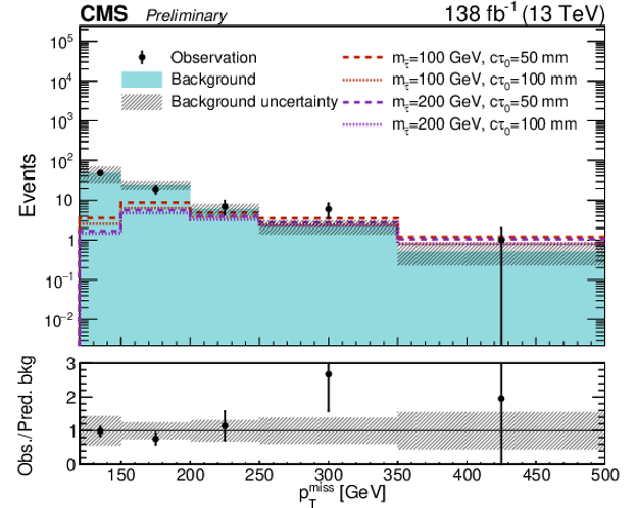 Observed and predicted event yields in the eight SR bins as defined in Table 2. The signal yields expected in the maximally mixed scenario for a few representative sets of ($m_{\tilde{\tau}}$ [GeV], $ c\tau_{0}$ [mm]) values are overlaid: (100, 50), (100, 100), (200, 50), and (200, 100). In bins where the observed yield is zero, the Poissonian upper limit at 68% CL is shown as a positive uncertainty. The lower panel indicates the ratio of the observed number of events to the total predicted number of background events in each bin. The shaded bands indicate the statistical and systematic uncertainties in the background, added in quadrature. The predicted yields and uncertainties shown here are prior to the maximum likelihood fit described in Section 8. |
