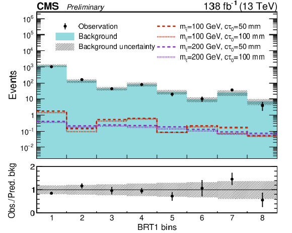 Observed and predicted event yields in the eight BRT1 bins as defined in Table 2. The signal yields expected in the maximally mixed scenario for a few representative sets of ($m_{\tilde{\tau}}$ [GeV], $c\tau_{0}$ [mm]) values are overlaid: (100, 50), (100, 100), (200, 50), and (200, 100). The lower panel indicates the ratio of the observed number of events to the total predicted number of background events in each bin. The shaded bands indicate the statistical and systematic uncertainties in the background, added in quadrature. |
