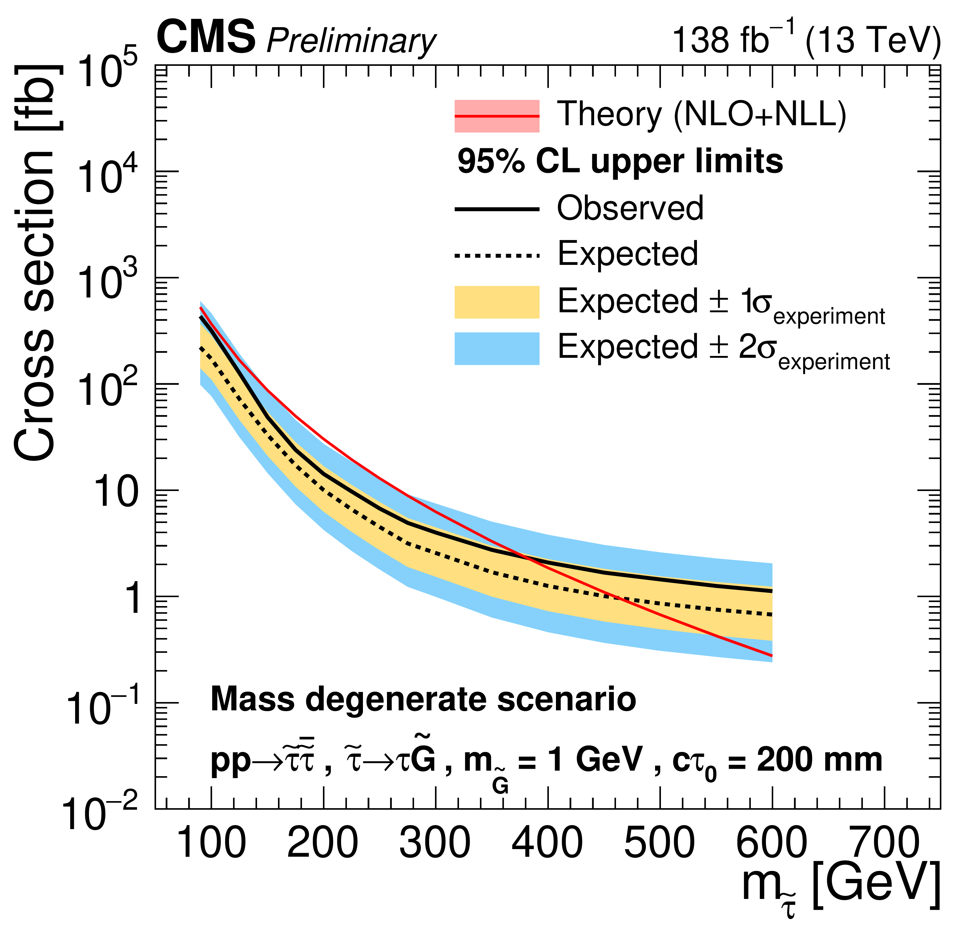 Cross section upper limits at 95% CL for the pair production of long-lived staus in the mass degenerate scenario, as a function of $ m_{\tilde{\tau}} $, for $ c\tau_{0}= $ 10, 30, 50, 100, 200, and 300 mm (left to right, upper to lower). The inner (yellow) and outer (blue) bands indicate the regions containing 68 and 95%, respectively, of the distribution of limits expected under the background-only hypothesis. The central values of the expected upper limits are denoted by the dashed black line. The solid black line represents the observed upper limits. The signal cross sections and uncertainties evaluated using NLO$ + $NLL calculations are shown as a red line and shaded band. The limits presented here have been obtained using an asymptotic approximation of the test statistic. |