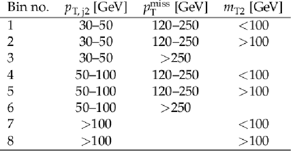 The eight regions defined in bins of $ p_{\text{T,j2}} $, $ p_{\mathrm{T}}^\text{miss} $, and $ m_{\mathrm{T2}} $. |