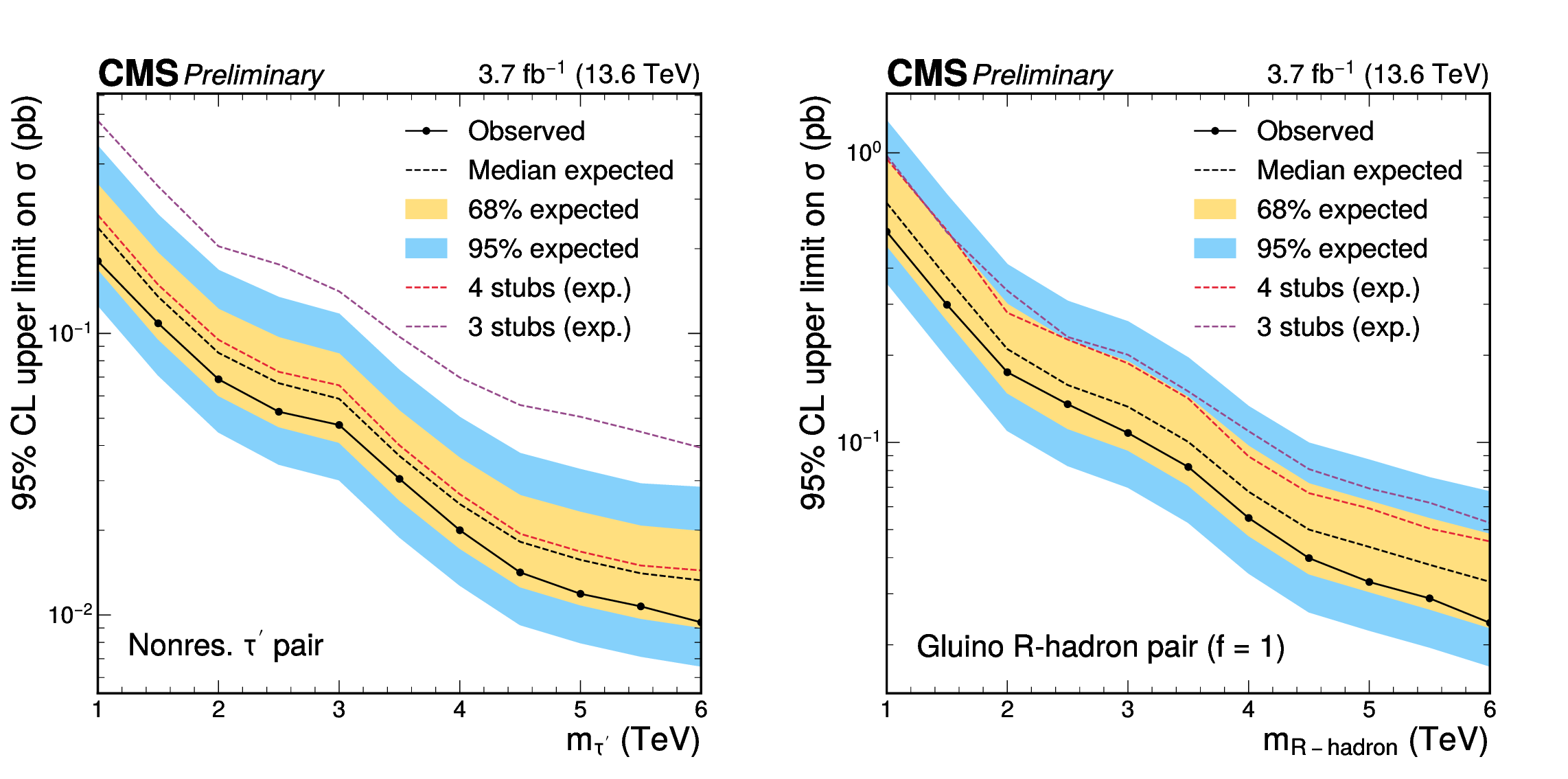 Observed (full line with markers) and expected (dashed black line) upper limits at 95% CL on the production cross section of heavy fourth-generation leptons through nonresonant DY production (left) and of a gluino $ R $-hadron pair with $ f= $ 1 (right). The inner (yellow) band and the outer (blue) band indicate the regions containing 68 and 95%, respectively, of the distribution of limits expected under the background-only hypothesis. The expected limits for the combinations of three-stub (dashed purple line) and four-stub (dashed-red line) categories are also shown. |