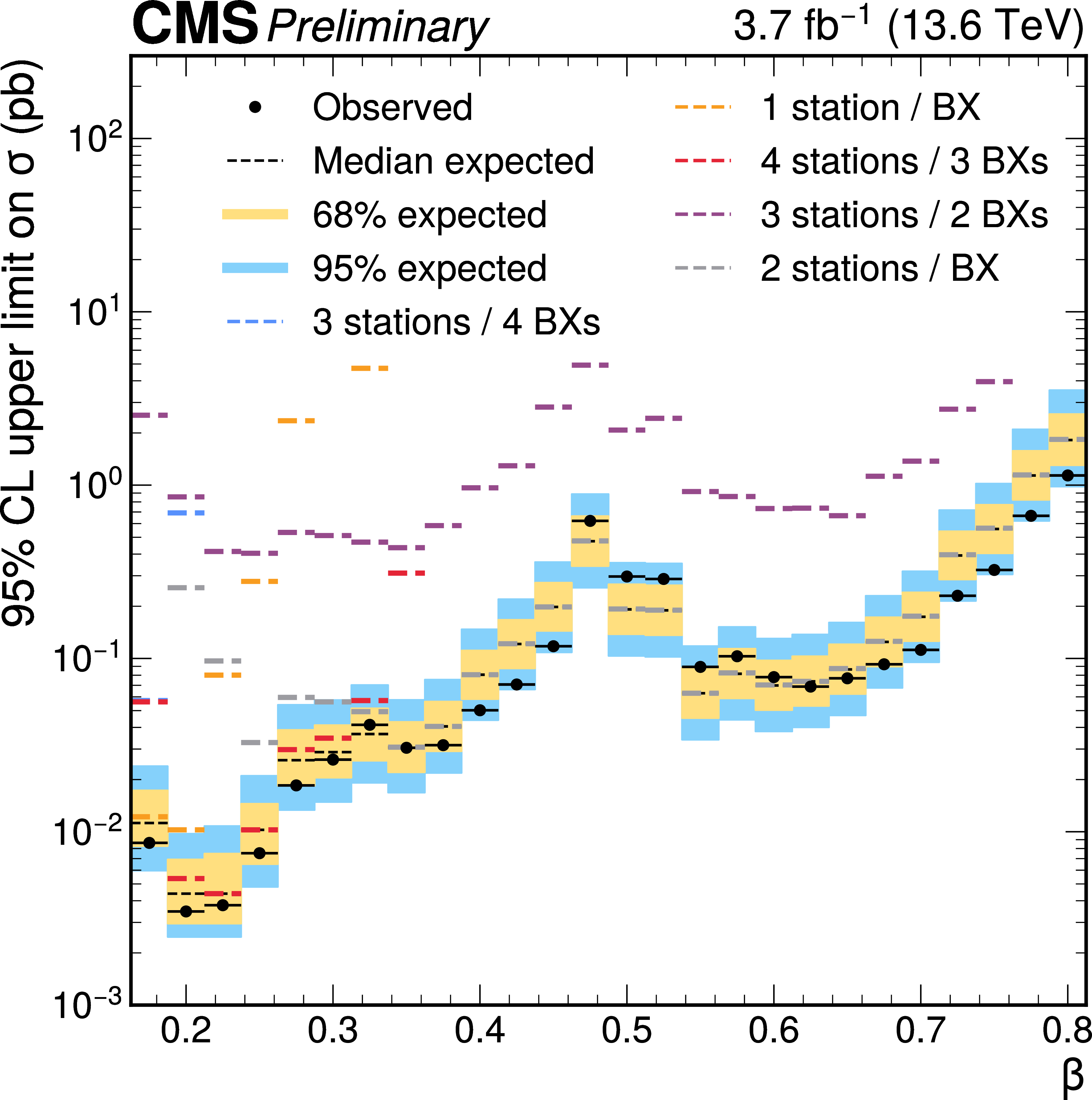 Observed and expected upper limits at 95% CL on the fiducial cross section of a heavy particle leaving a signature in the muon stations with $ p_{\mathrm{T}} > $ 500 GeV, $ |\eta| < $ 0.83, and a given $ \beta $ range. The inner (yellow) band and the outer (blue) band indicate the regions containing 68 and 95%, respectively, of the distribution of limits expected under the background-only hypothesis. The expected limits for groups of categories corresponding to a different number of stations crossed per BX are also shown with colorful dashed lines. |