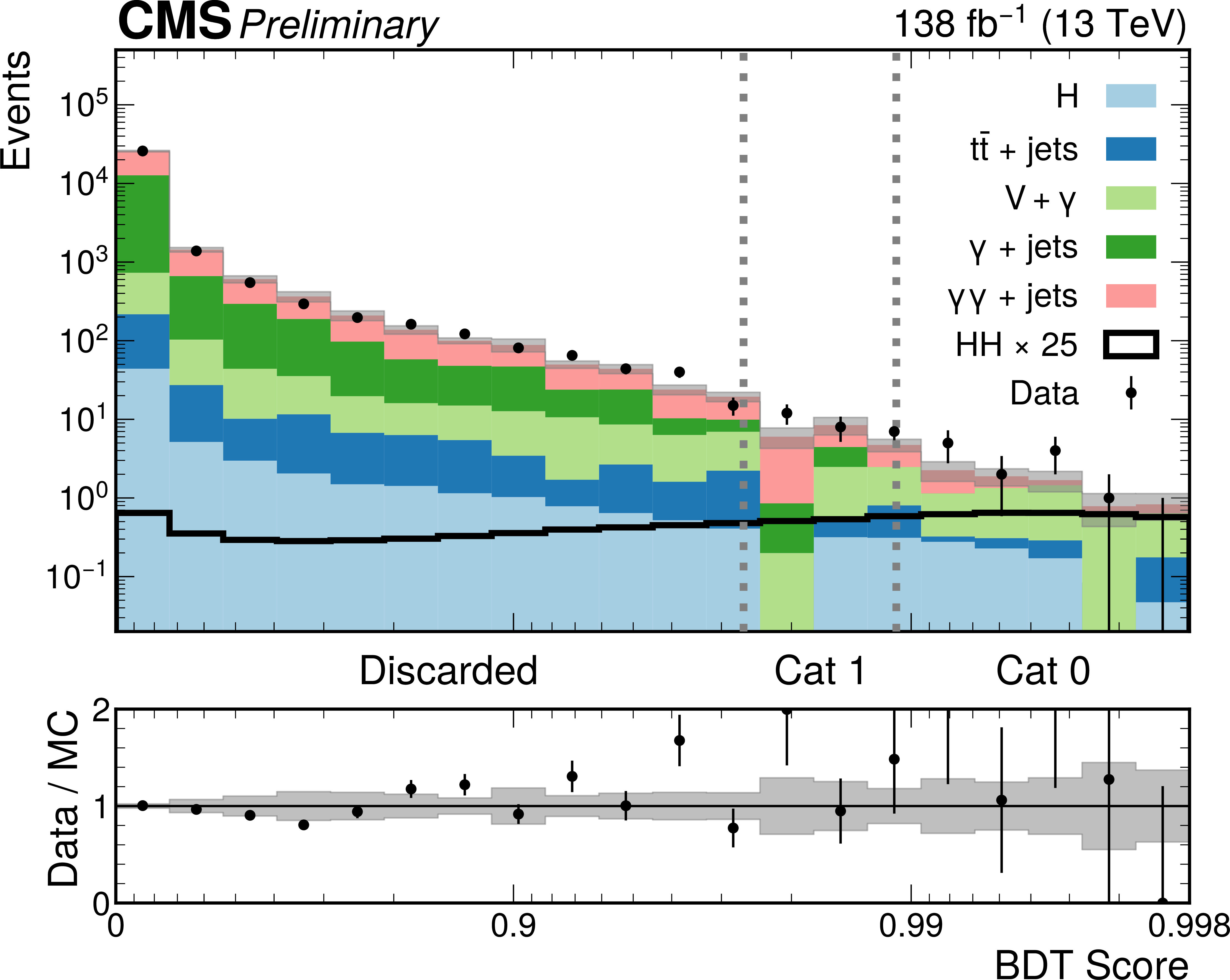 Distribution of the BDT scores used for the nonresonant analysis event categorization from data (black points) and predictions from MC simulation (coloured histograms). The ``H'' process includes ggH, VBF, VH, and $ {\mathrm{t}\overline{\mathrm{t}}} $H. The background histograms are stacked, while the signal distribution is shown separately. The normalization of the signal distribution is set to 25 times the SM prediction and the background MC simulation is normalized to data. The ratio of the data to the sum of the background predictions is shown in the lower panel. Statistical MC uncertainties for the background are represented by the grey-shaded bands. The grey dotted lines represent the boundaries that define the analysis categories. |