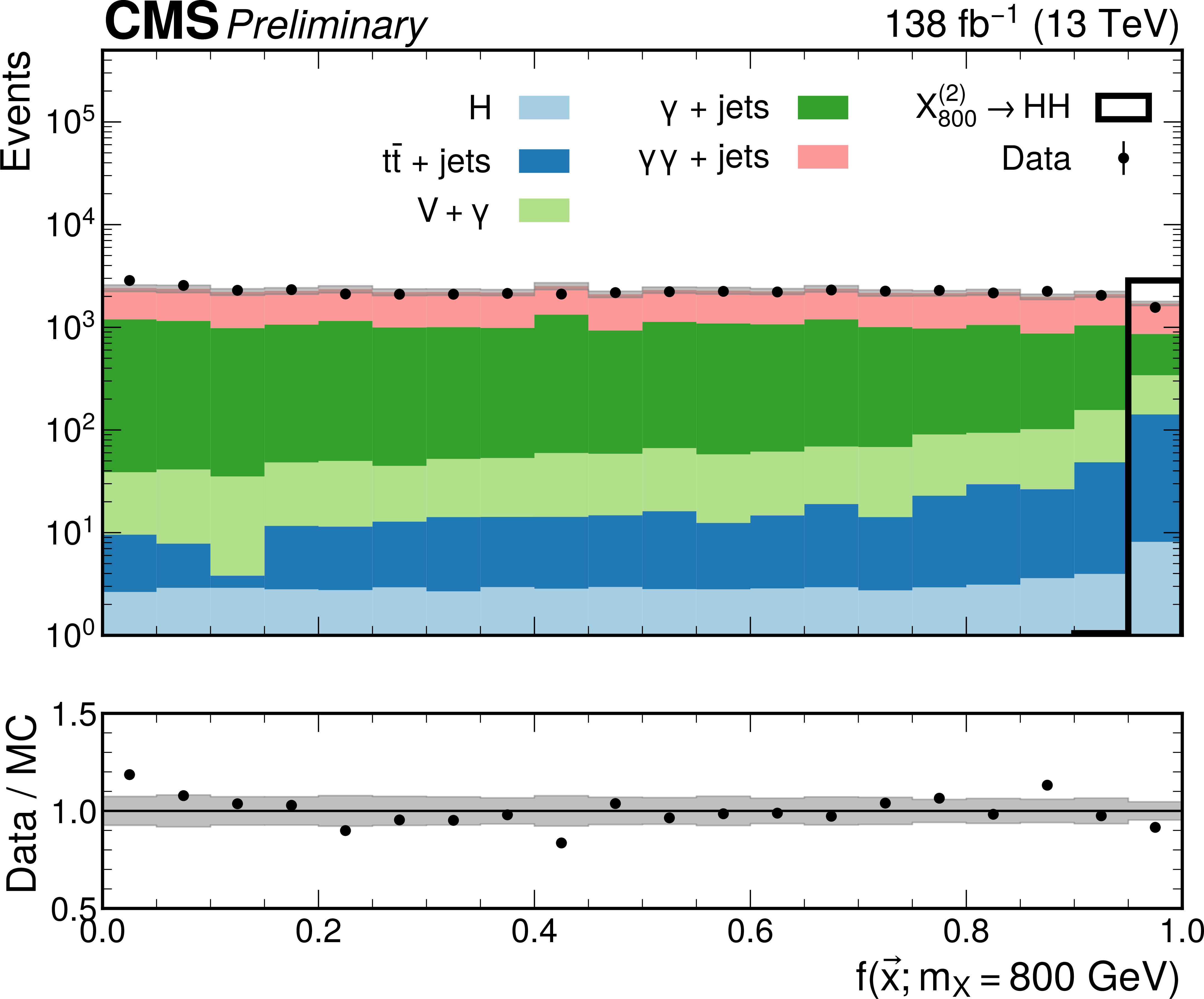 Transformed output of the pNN used in the $ \mathrm{X}^{(2)} \to \mathrm{H}\mathrm{H} $ search, evaluated at $ m_{\mathrm{X}}= $ 260 GeV (left) and $ m_{\mathrm{X}}= $ 800 GeV (right). The filled histograms represent the background simulation, and the data are shown by the black points. The ``H'' process includes ggH, VBF, VH, and $ {\mathrm{t}\overline{\mathrm{t}}} $H. The targeted signal distributions for which the pNN is evaluated are shown by the black unfilled histograms. The background MC simulation is normalized to data and the signal is normalized to an arbitrary cross section for representation purposes. The ratio of the data to the sum of the background predictions is shown in the lower panel. Statistical MC uncertainties for the background are represented by the grey-shaded bands. |