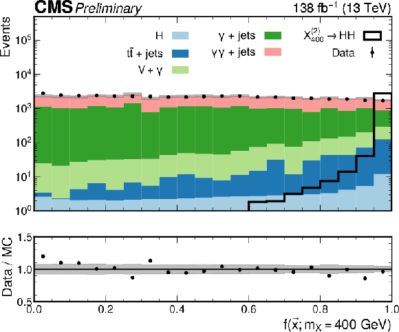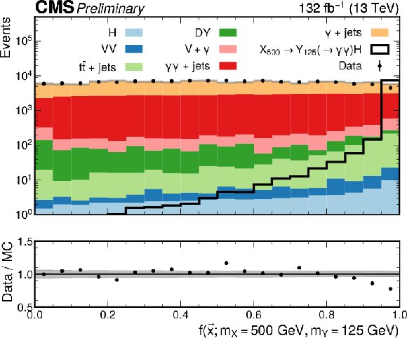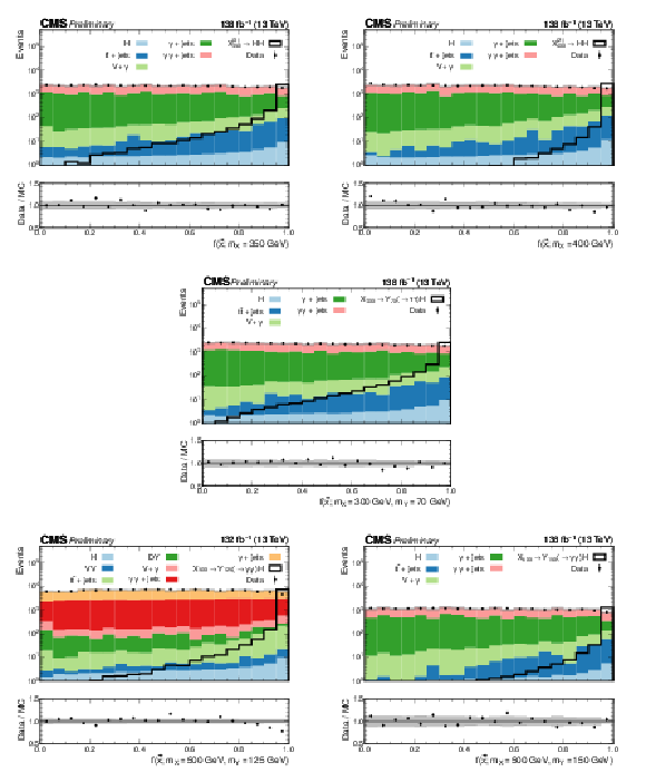 Transformed output of the pNNs used in the $ \mathrm{X}^{(0)} \to \mathrm{H}\mathrm{H} $ (top left), $ \mathrm{X}^{(2)} \to \mathrm{H}\mathrm{H} $ (top right), $ \mathrm{X} \to \mathrm{Y}(\tau\tau)\mathrm{H}(\gamma\gamma) $ (middle), low-mass $ \mathrm{X} \to \mathrm{Y}(\gamma\gamma)\mathrm{H}(\tau\tau) $ (bottom left) and high-mass $ \mathrm{X} \to \mathrm{Y}(\gamma\gamma)\mathrm{H}(\tau\tau) $ (bottom right) searches. The pNNs are evaluated at the mass points where the largest excess with respect to the background-only hypothesis is observed. If the MC simulation at this mass point is not available, then the sample produced at a mass point closest to the excess is shown. The filled histograms represent the background simulation, and the data are shown by the black points. The ``H'' process includes ggH, VBF, VH, and $ {\mathrm{t}\overline{\mathrm{t}}} $H. The targeted signal distributions for which the pNN is evaluated are shown by the black unfilled histograms. The background MC simulation is normalized to data and the signal is normalized to an arbitrary cross section for representation purposes. The ratio of the data to the sum of the background predictions is shown in the lower panel. Statistical MC uncertainties for the background are represented by the grey-shaded bands. |