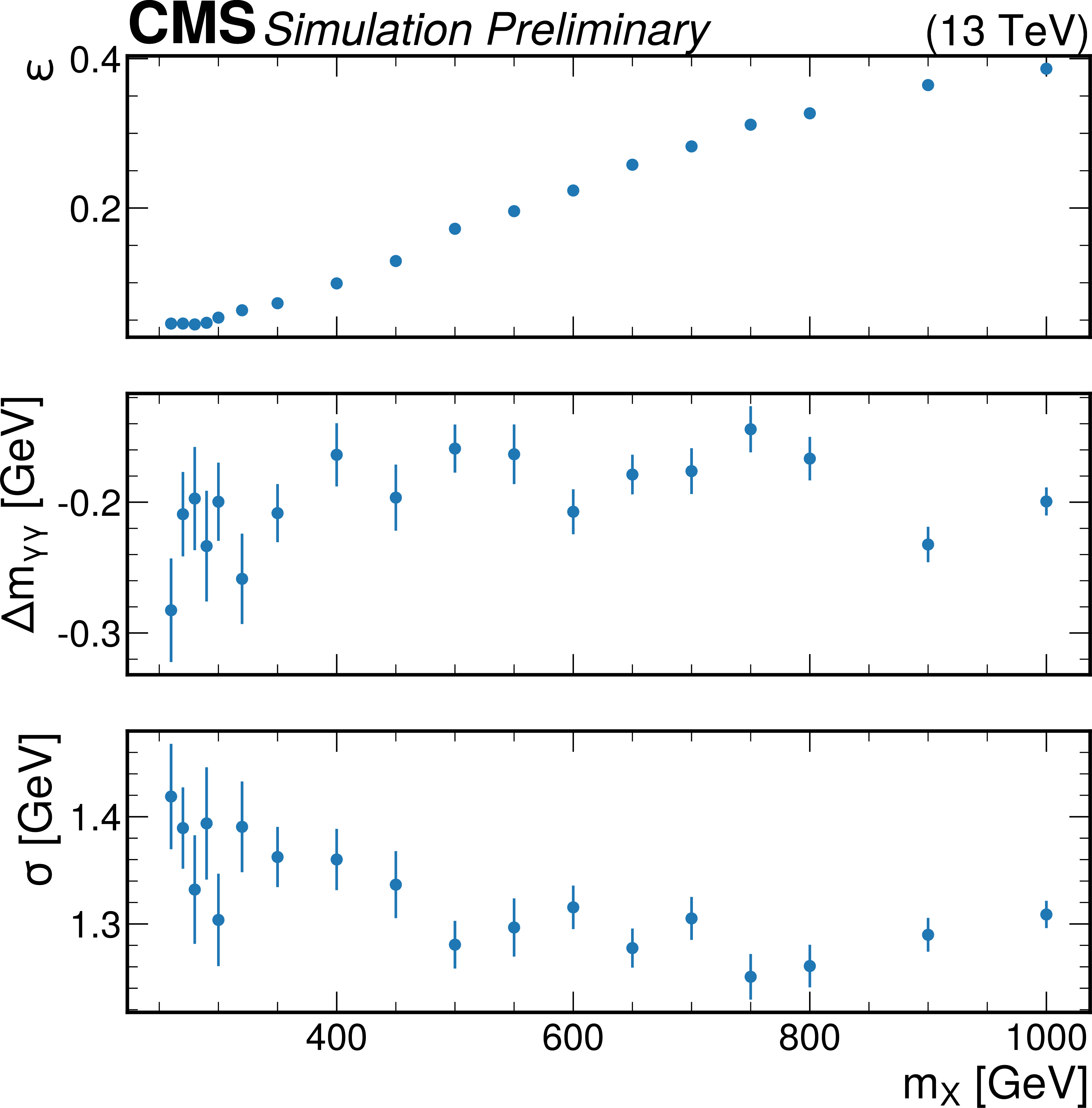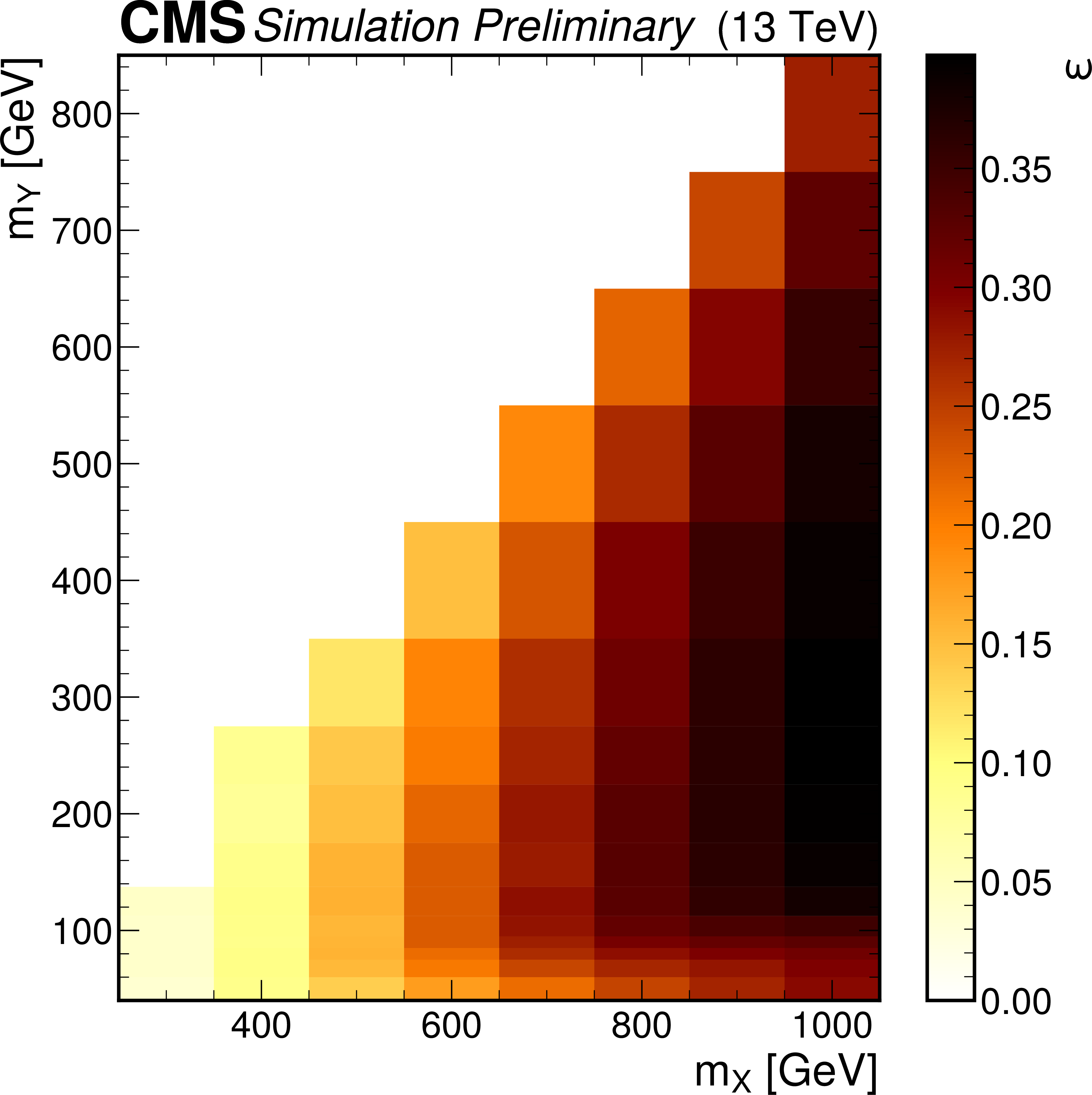 Signal efficiency, $ \epsilon $, and interpolated DCB shape parameters, $ \Delta m_{\gamma\gamma} $ and $ \sigma $, for the highest purity analysis category in the $ \mathrm{X}^{(2)} \to \mathrm{H}\mathrm{H} $ search, as functions of $ m_{\mathrm{X}} $ (left). The first shape parameter, $ \Delta m_{\gamma\gamma} $, is defined as $ \overline{m}_{\gamma\gamma}- $ 125. Signal efficiency in the ($ m_{\mathrm{X}} $,$ m_{\mathrm{Y}} $) plane for the highest purity analysis category in the $ \mathrm{X} \to \mathrm{Y}(\tau\tau)\mathrm{H}(\gamma\gamma) $ search (right). |