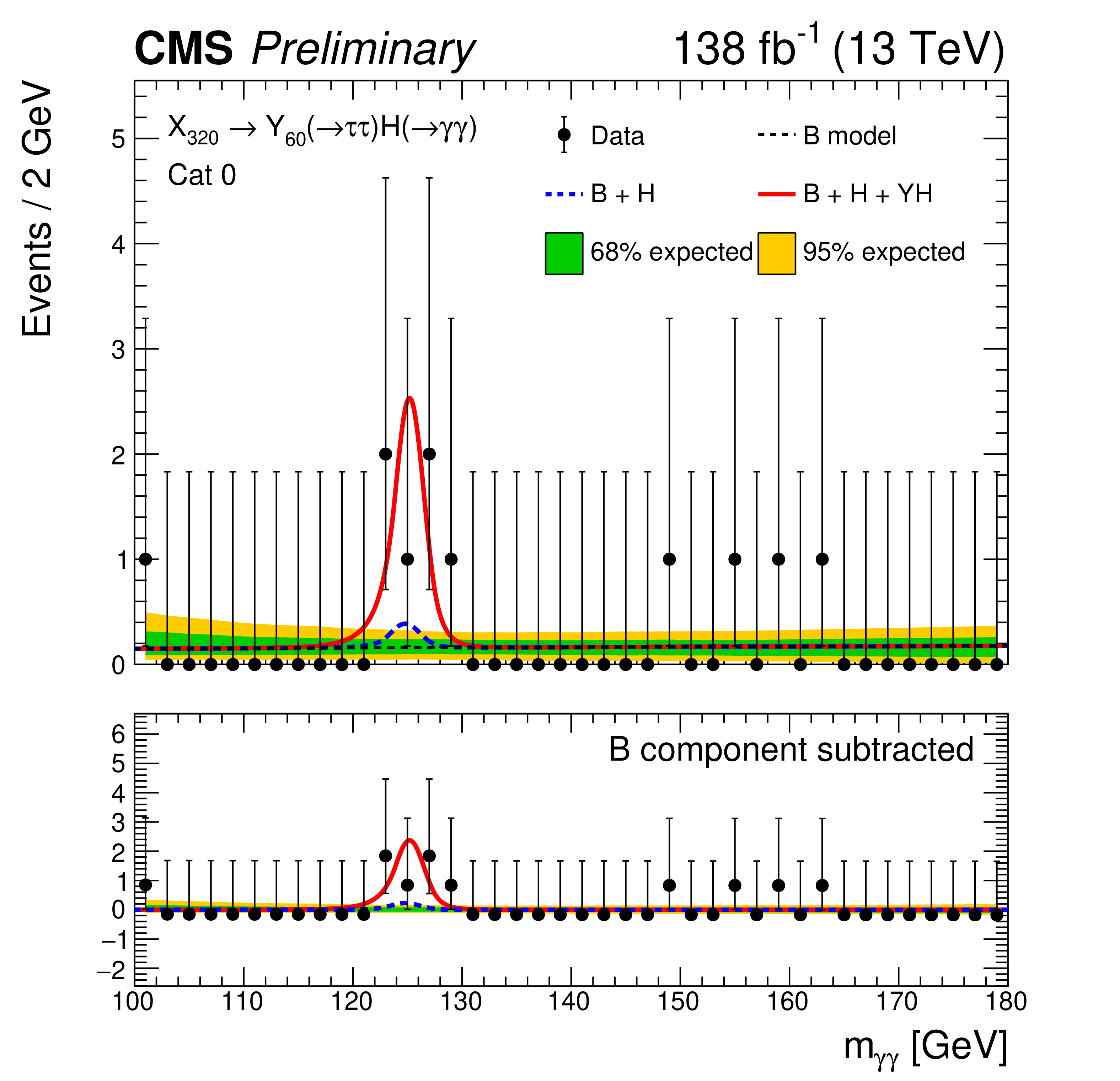 Data points (black) and signal-plus-background models for the most sensitive analysis category in each search channel are shown: nonresonant (top left), $ \mathrm{X}^{(0)} \to \mathrm{H}\mathrm{H} $ (top right), $ \mathrm{X}^{(2)} \to \mathrm{H}\mathrm{H} $ (middle left), $ \mathrm{X} \to \mathrm{Y}(\tau\tau)\mathrm{H}(\gamma\gamma) $ (middle right), low-mass $ \mathrm{X} \to \mathrm{Y}(\gamma\gamma)\mathrm{H}(\tau\tau) $ (bottom left) and the high-mass $ \mathrm{X} \to \mathrm{Y}(\gamma\gamma)\mathrm{H}(\tau\tau) $ (bottom right). The analysis categories for the resonant search channels correspond to the mass hypotheses where the largest excesses with respect to the background-only hypothesis are observed. The one (green) standard deviation and two (yellow) standard deviation bands show the uncertainties in the background component of the fit. The solid red line shows the sum of the fitted signal and background components, the solid blue line shows the continuum background and the background from single H production together, and the dashed black line shows only the continuum background component. The lower panel in each plot shows the residual signal yield after subtraction of the background. |