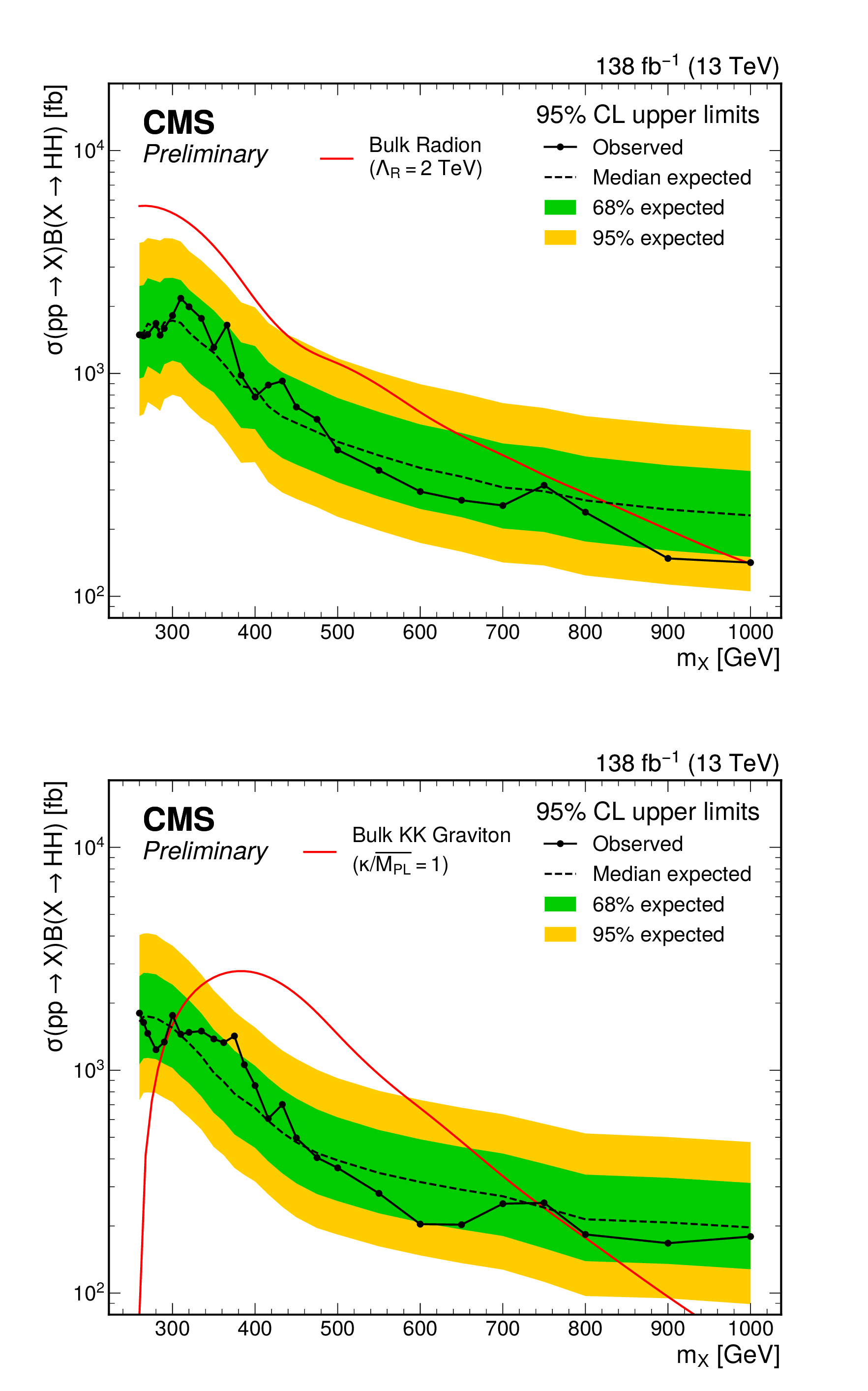 Expected and observed 95% CL upper limit on the resonant production cross section, $ \sigma({\rm{pp}} \to \mathrm{X} \to \mathrm{H}\mathrm{H}) $ for the spin-0 $ \mathrm{X}^{(0)} \to \mathrm{H}\mathrm{H} $ search (top) and spin-2 $ \mathrm{X}^{(2)} \to \mathrm{H}\mathrm{H} $ search (bottom). The dashed and solid black lines represent the expected and observed limits, respectively. The green and yellow bands represent the one and two standard deviations for the expected limit, respectively. The red lines show the theoretical predictions with different energy scales and couplings [82]. |