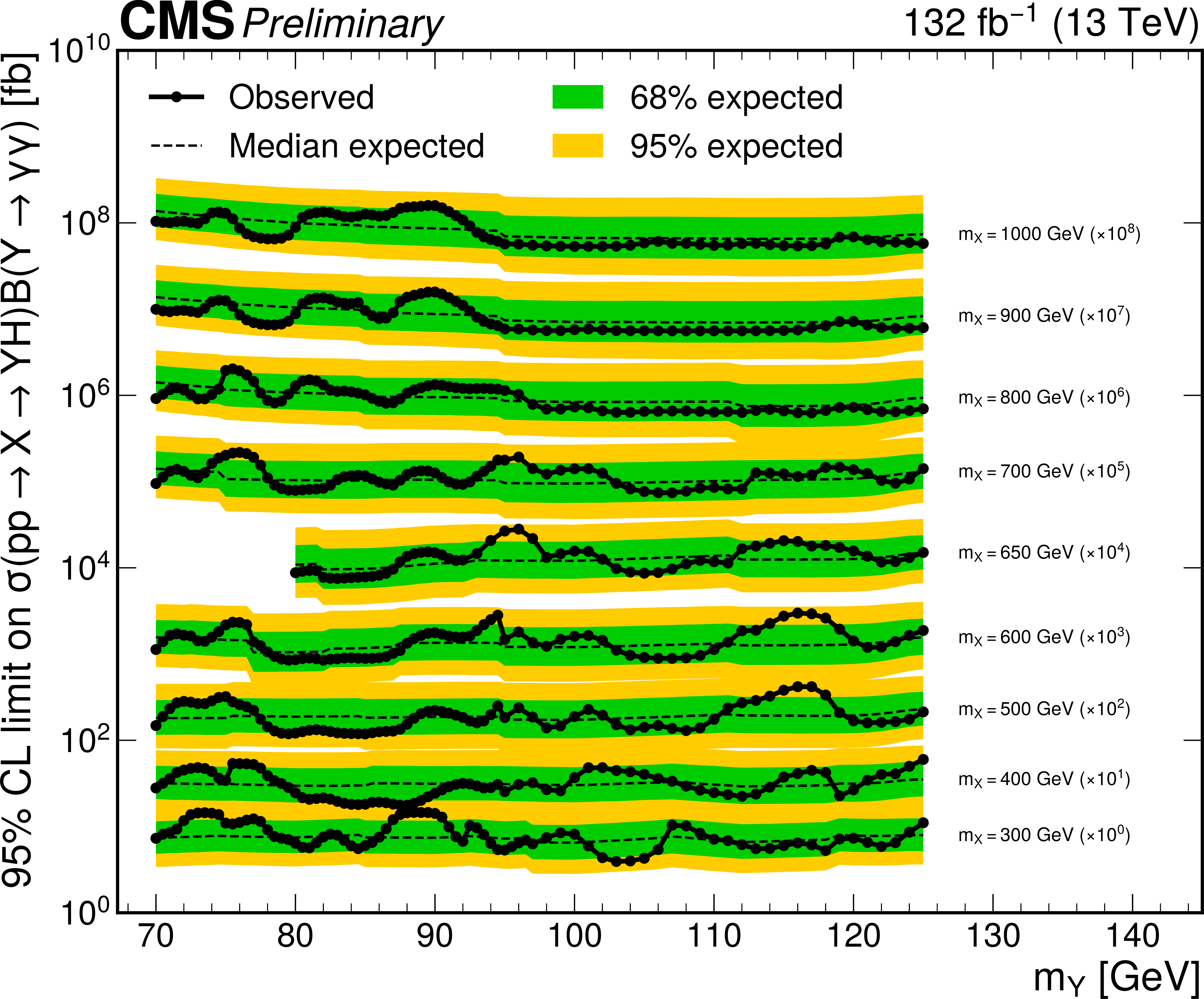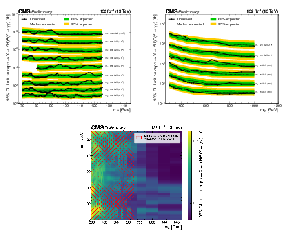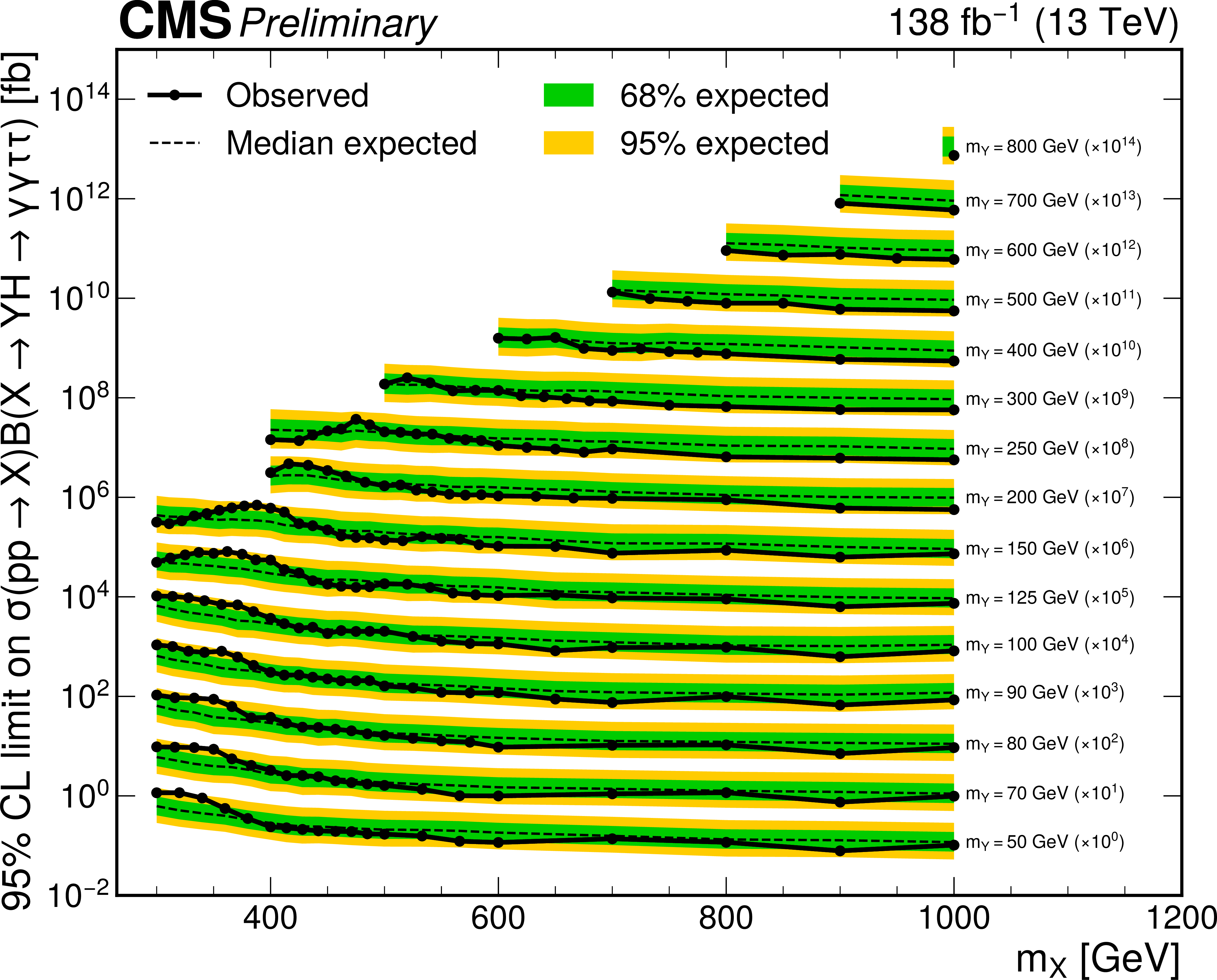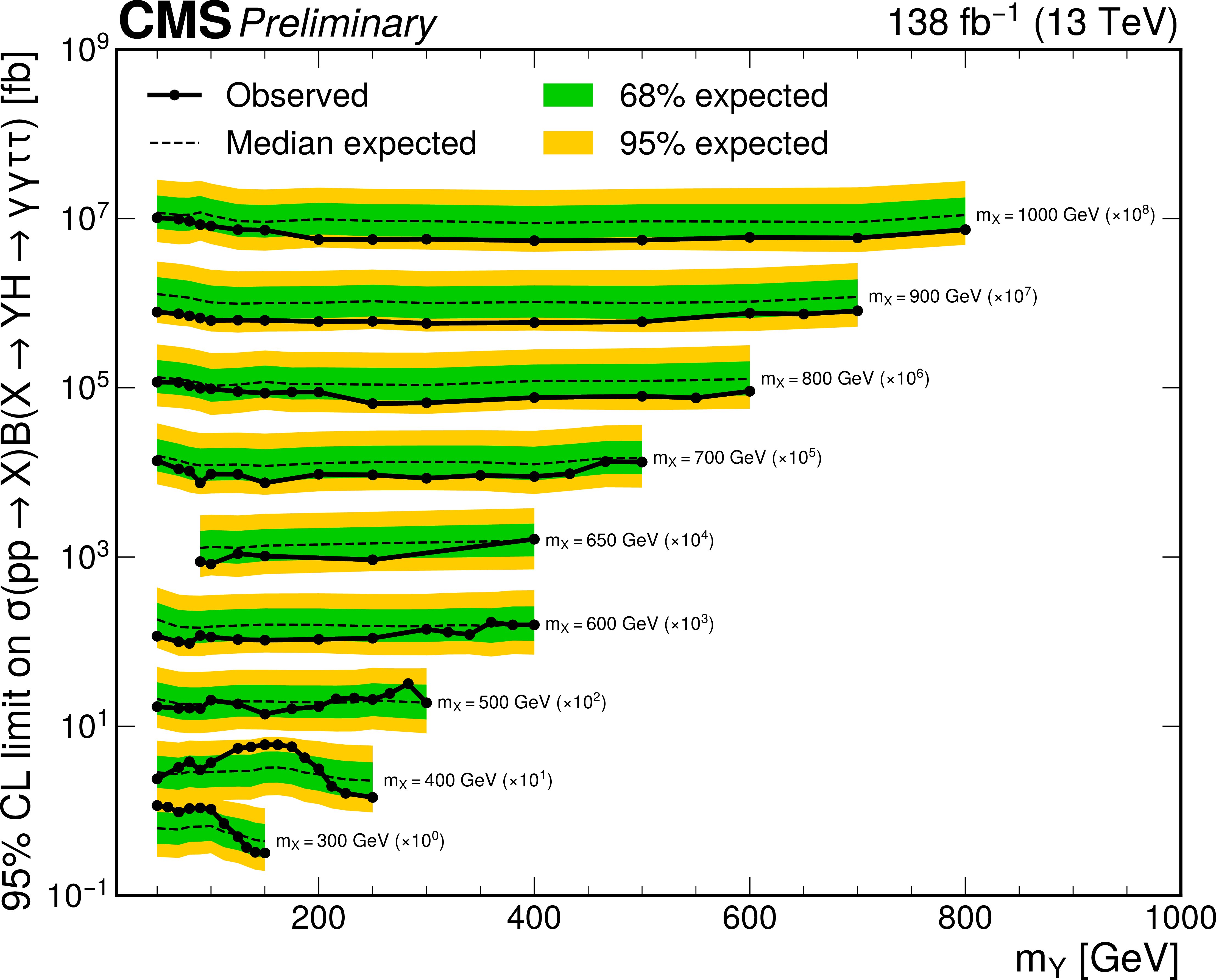 The top plot shows the expected and observed 95% CL upper limit on $ \sigma({\rm{pp}} \to \mathrm{X} \to \mathrm{Y}\mathrm{H} \to \gamma\gamma\tau\tau) $ for the $ \mathrm{X} \to \mathrm{Y}(\tau\tau)\mathrm{H}(\gamma\gamma) $ search. The dashed and solid black lines represent the expected and observed limits, respectively. The green and yellow bands represent the one and two standard deviations for the expected limit, respectively. Limits are scaled by orders of 10, labeled in the plot, depending on $ m_{\mathrm{X}} $ (left) or $ m_{\mathrm{Y}} $ (right). The bottom plot shows the observed upper limits in the 2D ($ m_{\mathrm{X}} $,$ m_{\mathrm{Y}} $) plane. The values of the limits are shown by the colour scale. |