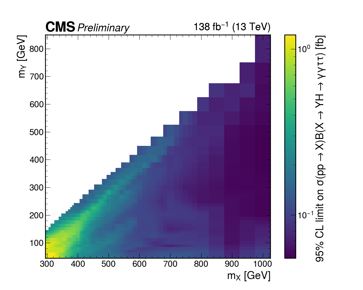 The top plot shows the expected and observed 95% CL upper limit on $ \sigma({\rm{pp}} \to \mathrm{X} \to \mathrm{Y}\mathrm{H})B(\mathrm{Y} \to \gamma\gamma) $ for the high-mass $ \mathrm{X} \to \mathrm{Y}(\gamma\gamma)\mathrm{H}(\tau\tau) $ search. The dashed and solid black lines represent the expected and observed limits, respectively. The green and yellow bands represent the one and two standard deviations for the expected limit, respectively. Limits are scaled by orders of 100 (left) or 10 (right), labeled in the plot, depending on $ m_{\mathrm{X}} $ (left) or $ m_{\mathrm{Y}} $ (right). In the top-left plot, there is a discontinuity in the limits for $ m_{\mathrm{X}}= $ 650 GeV which is due to the chosen limit granularity in $ m_{\mathrm{X}} $ and $ m_{\mathrm{Y}} $. For the range $ m_{\mathrm{Y}}\in[274, 388]\,\text{Ge\hspace{-.08em}V} $, there are limits placed at $ m_{\mathrm{X}}= $ 600, 633, 666 and 700 GeV instead of 600, 650 and 700 GeV. The bottom plot shows the observed upper limits in the 2D ($ m_{\mathrm{X}} $,$ m_{\mathrm{Y}} $) plane. The values of the limits are shown by the colour scale. |