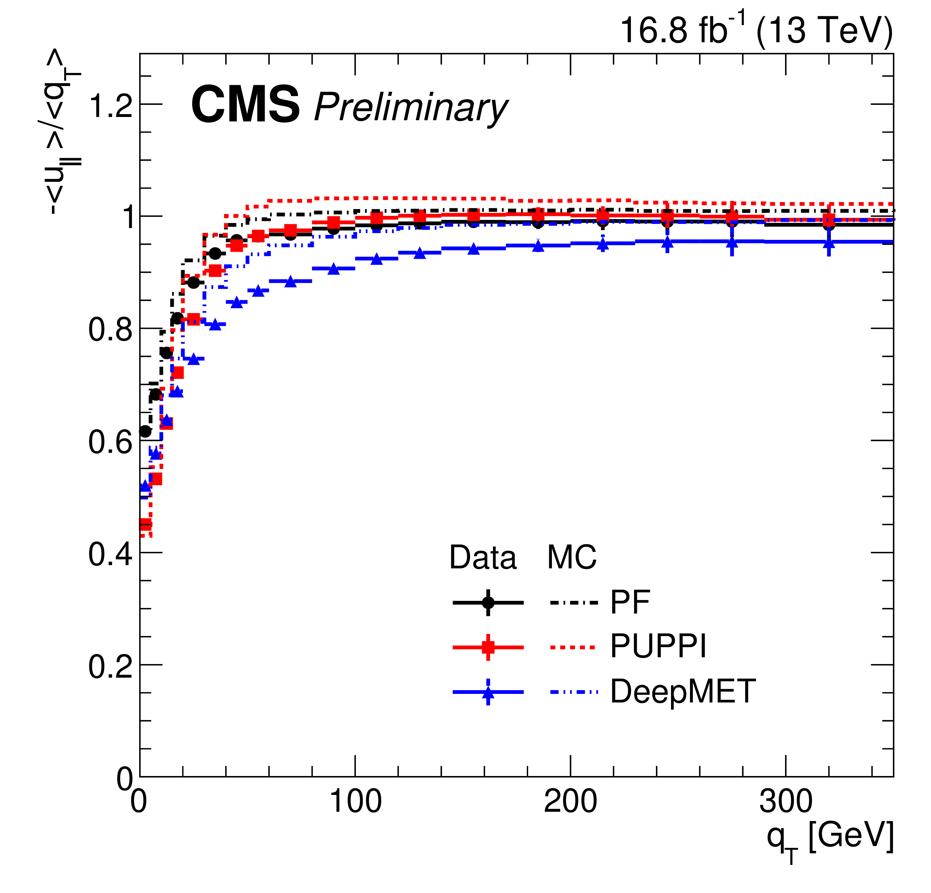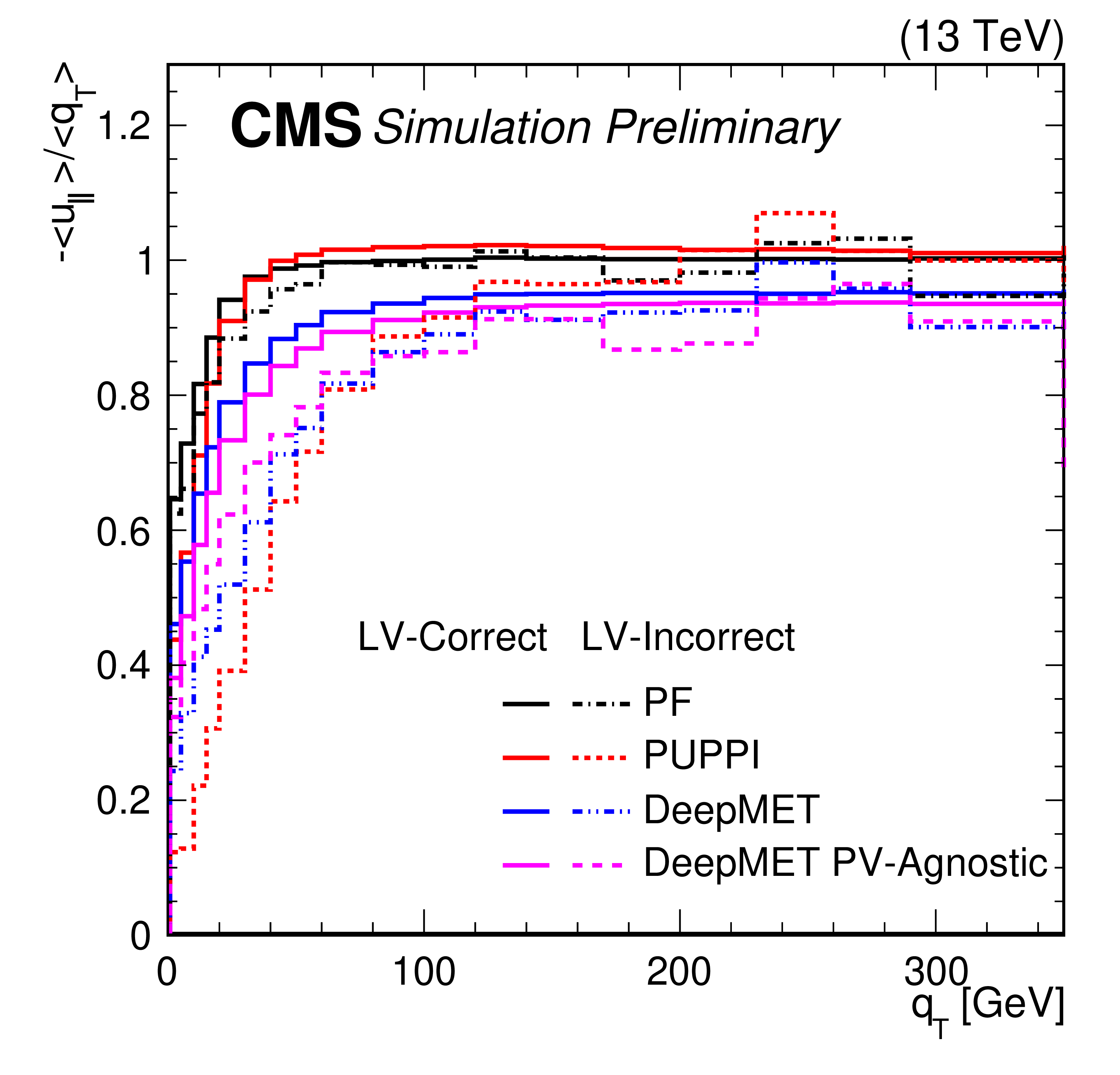Recoil responses of different $ p_{\mathrm{T}}^\text{miss} $ estimators in data (solid) and MC simulations (dashed) after the $ \mathrm{Z}\to\mu\mu $ selections. |