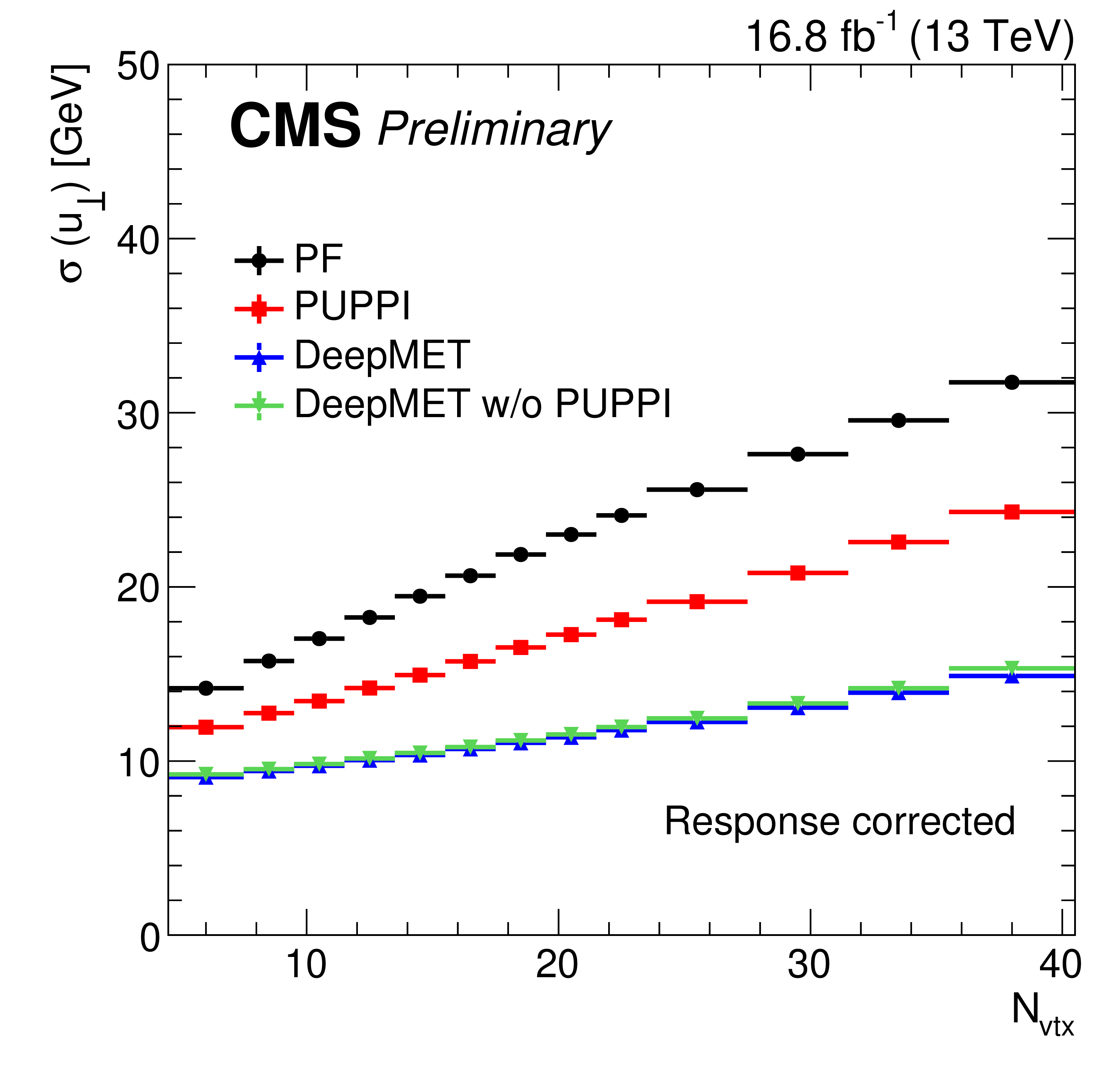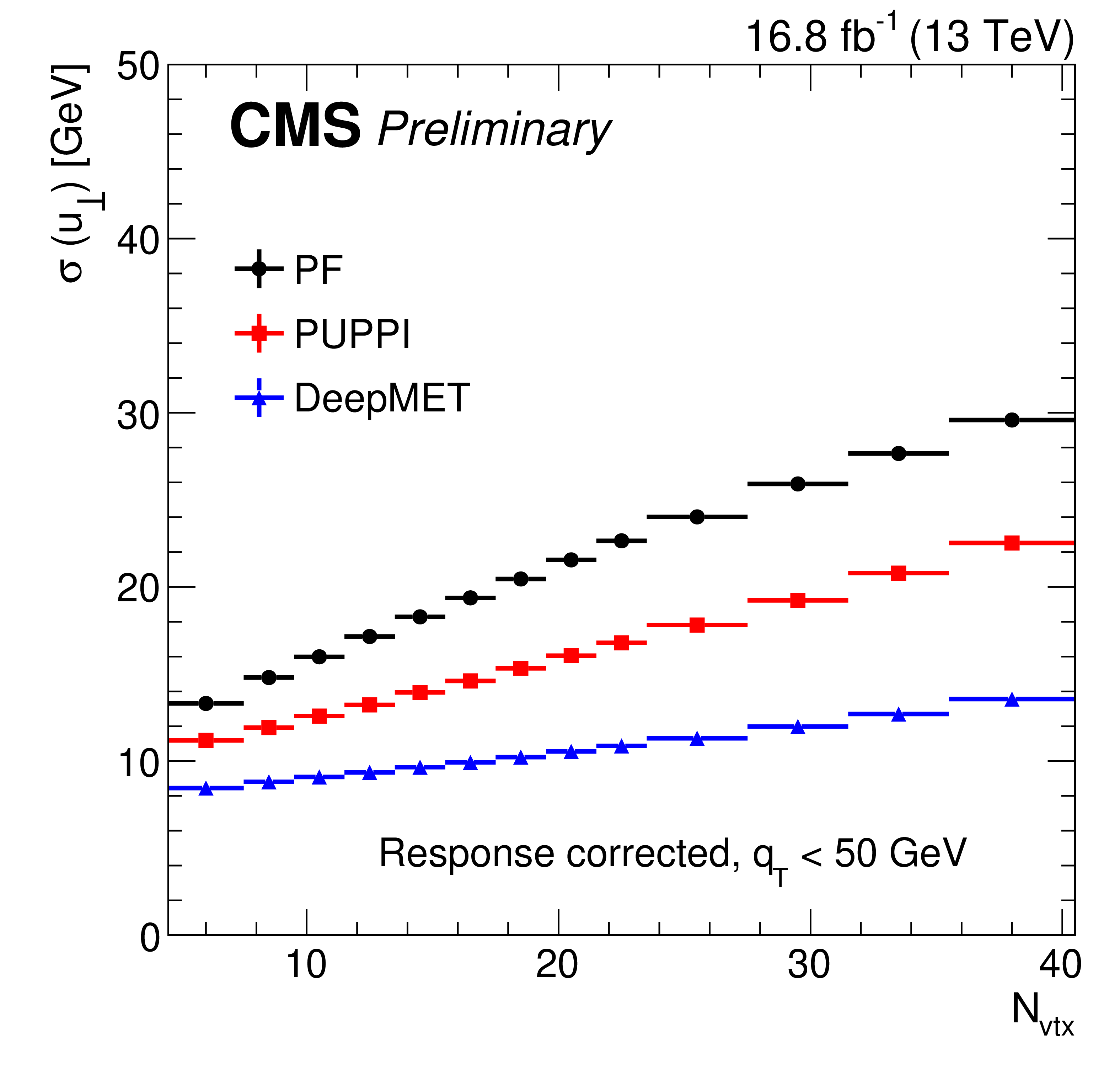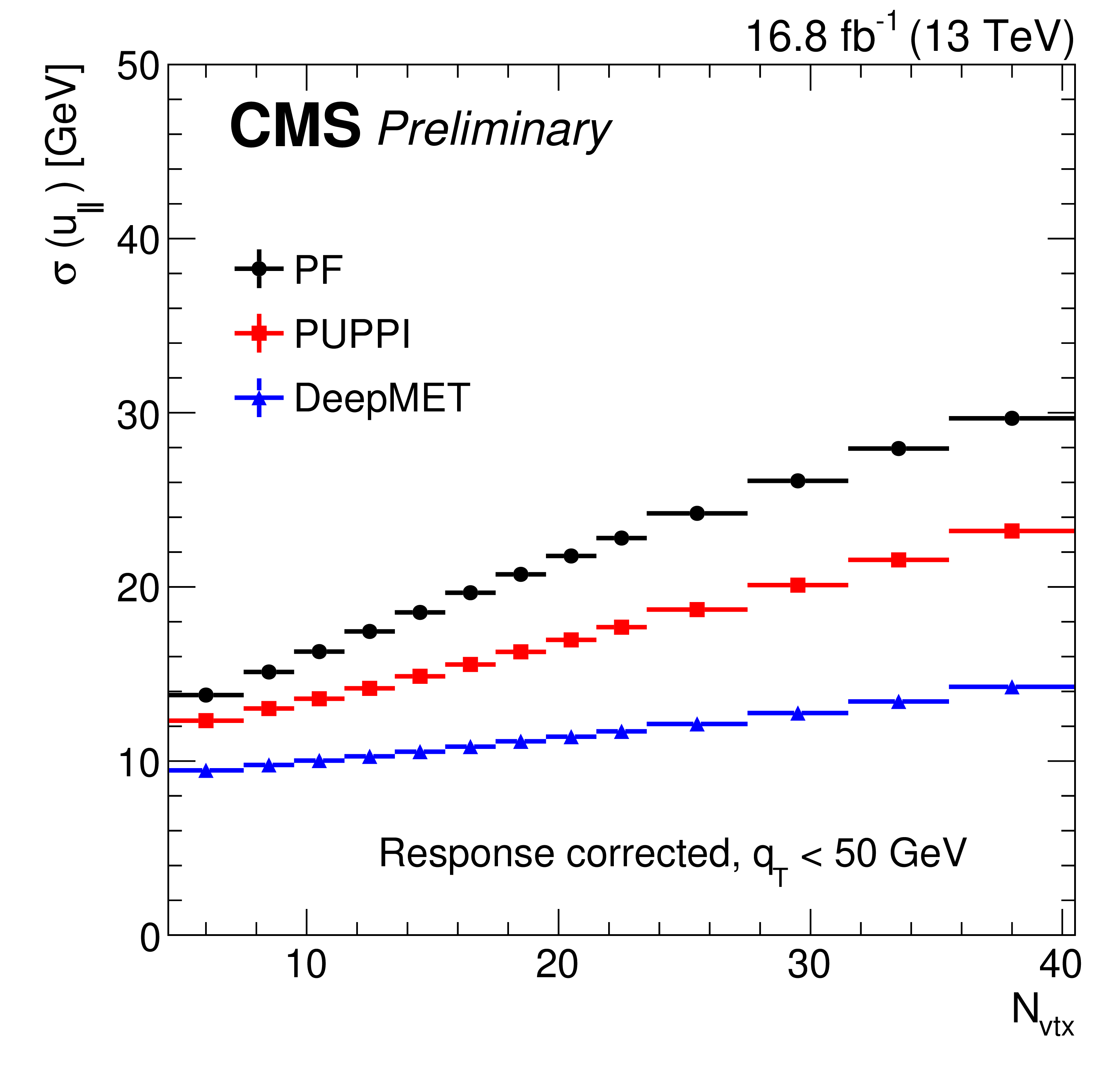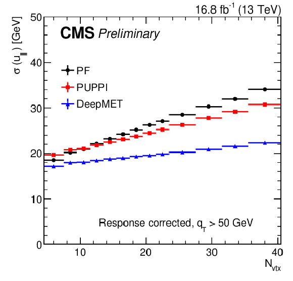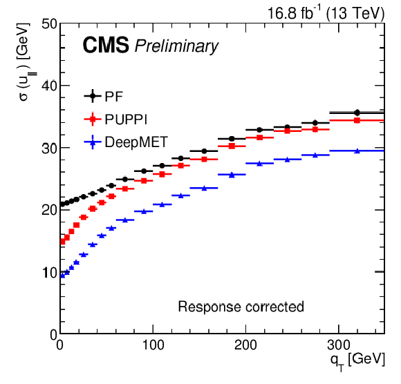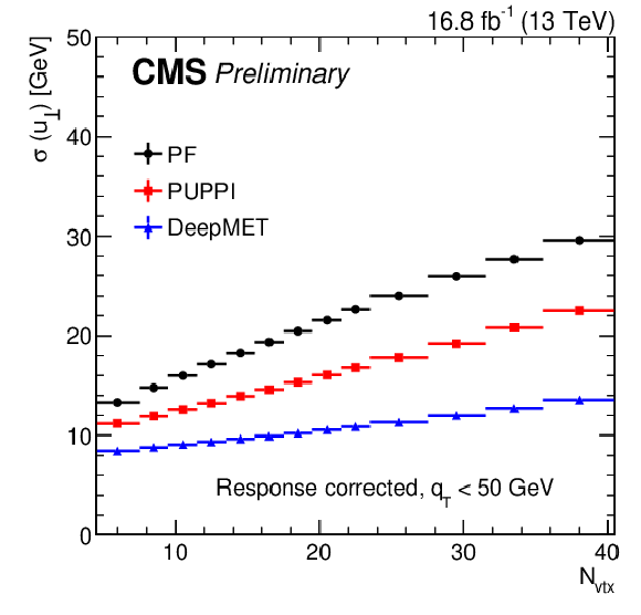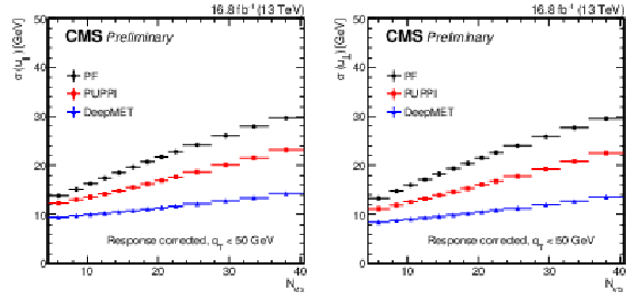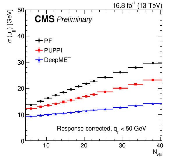 Response-corrected resolutions of $ u_{\parallel} $ (left) and $ u_{\perp} $ (right) vs. number of reconstructed PVs of different $ p_{\mathrm{T}}^\text{miss} $ estimators in data after the $ \mathrm{Z}\to\mu\mu $ selections in the region with $ q_{\mathrm{T}} < $ 50 GeV. |