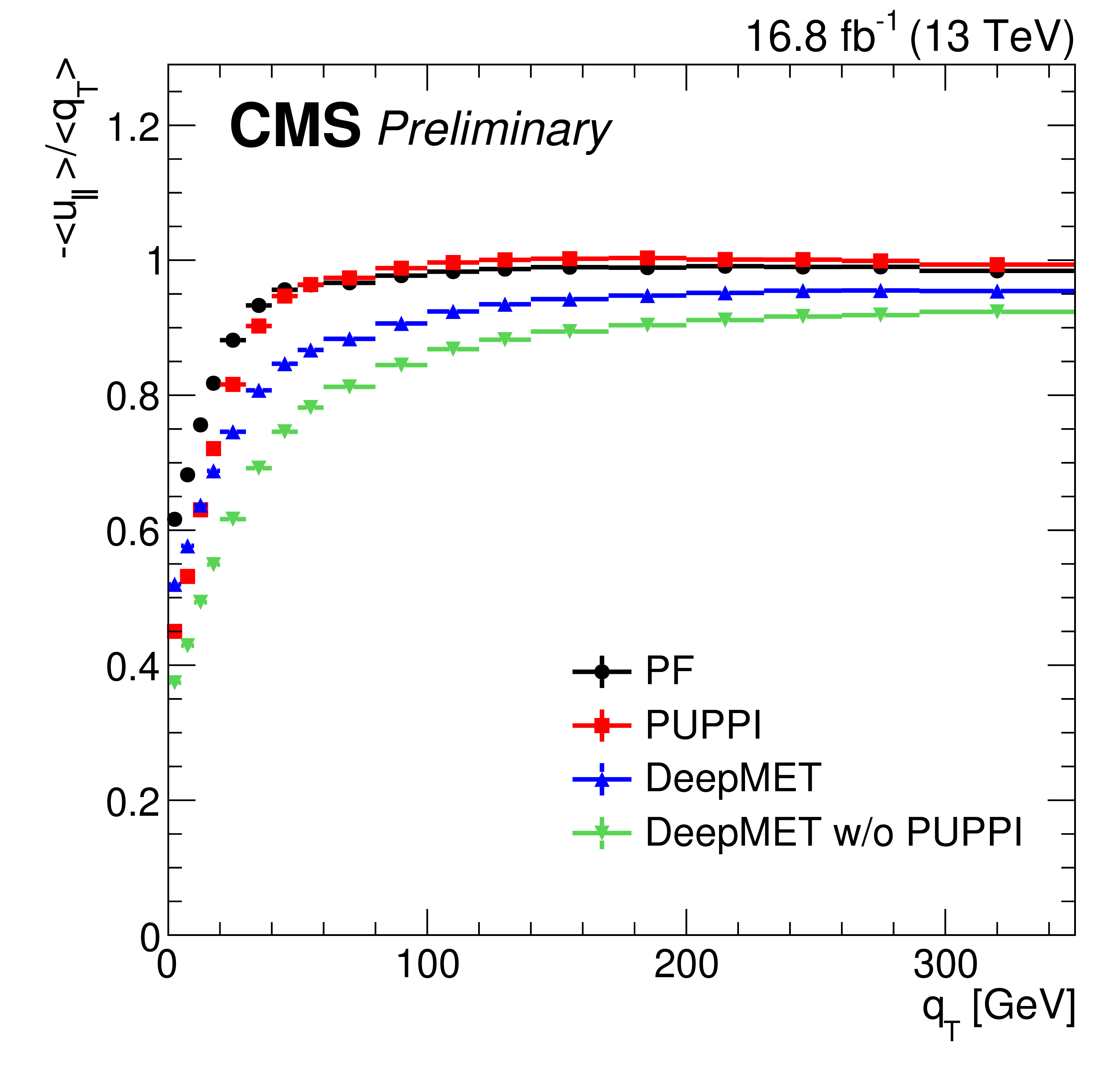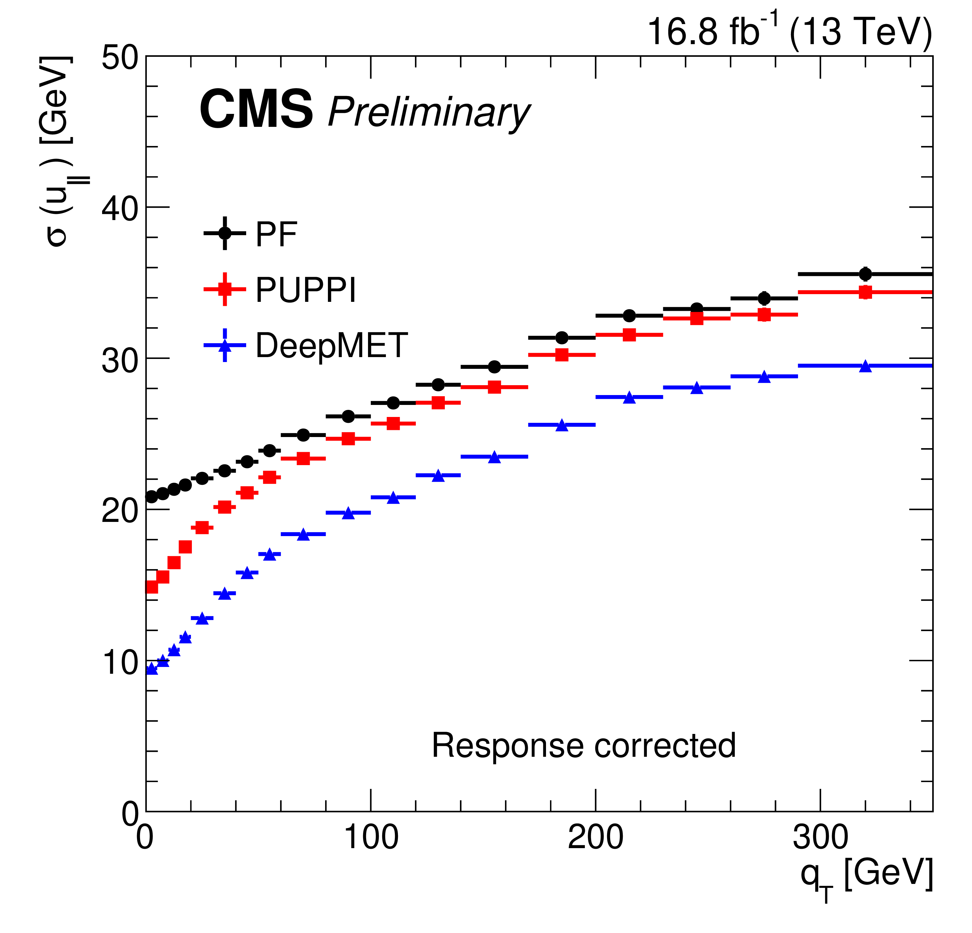 Response-corrected resolutions of $ u_{\parallel} $ (left) and $ u_{\perp} $ (right) vs. $ q_{\mathrm{T}} $ of different $ p_{\mathrm{T}}^\text{miss} $ estimators in data after the $ \mathrm{Z}\to\mu\mu $ selections. |