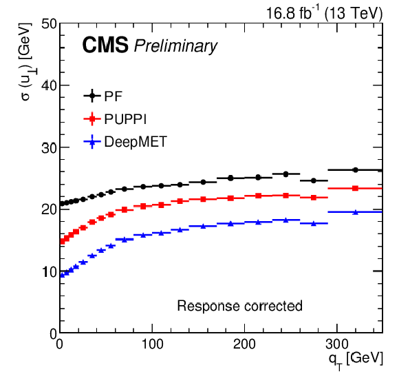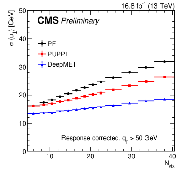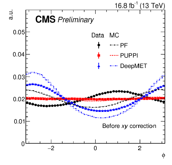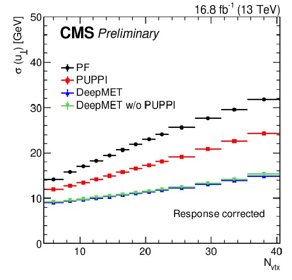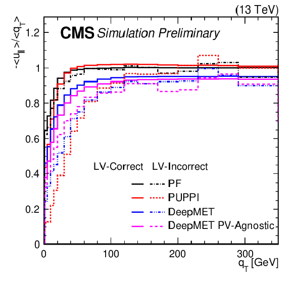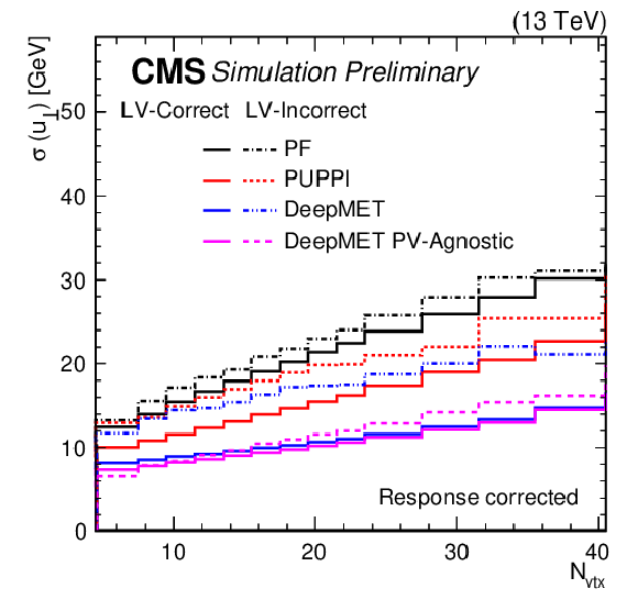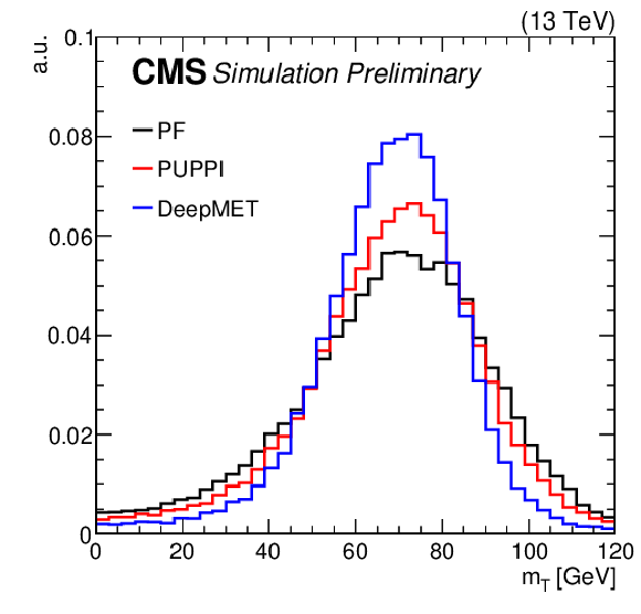 | Abstract: At hadron colliders, the net transverse momentum of particles that do not interact with the detector (missing transverse momentum) is a crucial observable in many analyses. In the standard model, missing transverse momentum originates from neutrinos. Many beyond-the-standard-model particles such as dark matter candidates are also expected to leave the experimental apparatus undetected. This note presents a novel missing transverse momentum estimator DeepMET, developed for the CMS experiment at the LHC, that is based on deep neural networks. DeepMET produces a weight for each reconstructed particle based on its properties. The estimator is the negative vector sum over all reconstructed particles of their weighted transverse momenta. Compared with other estimators currently employed by CMS, DeepMET improves the missing transverse momentum resolution by 10-20%, shows improvement for a wide range of final states, is easier to train, and is more resilient against the effects of additional proton-proton interactions accompanying the collision of interest. A version of DeepMET that is less dependent on correct reconstruction of the hard scattering vertex position is also presented. | ||