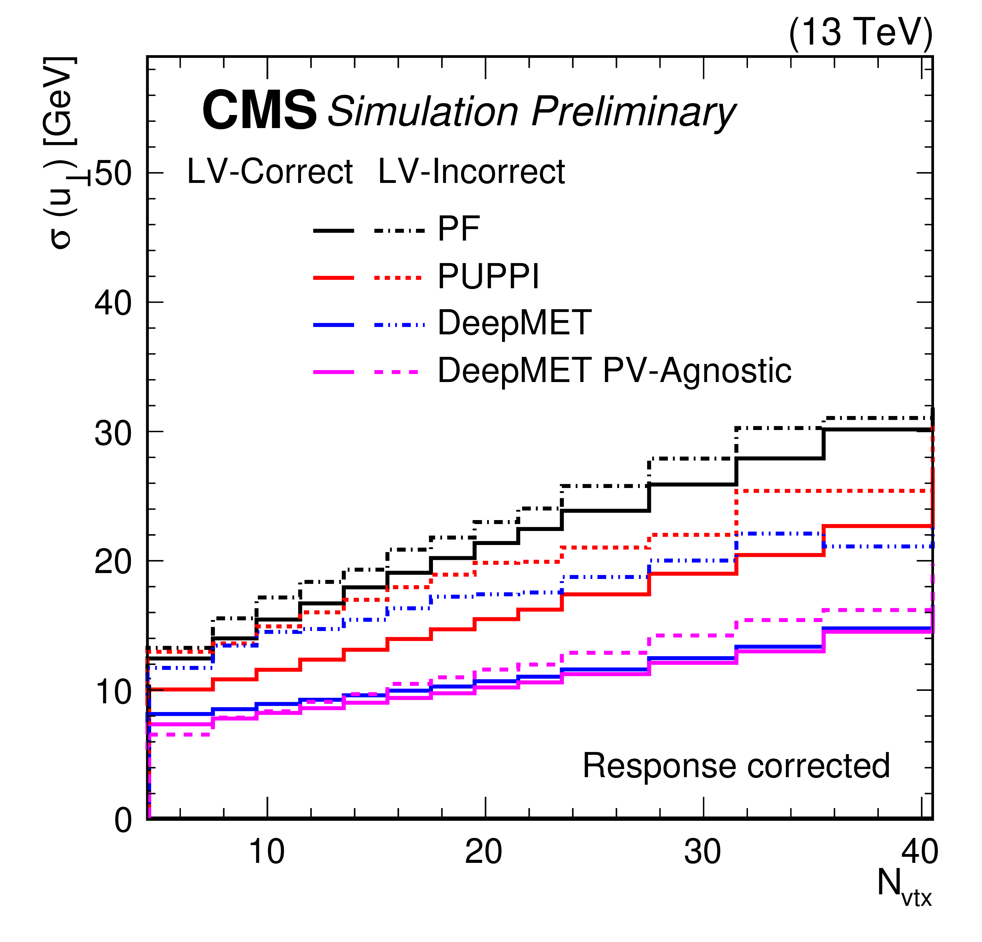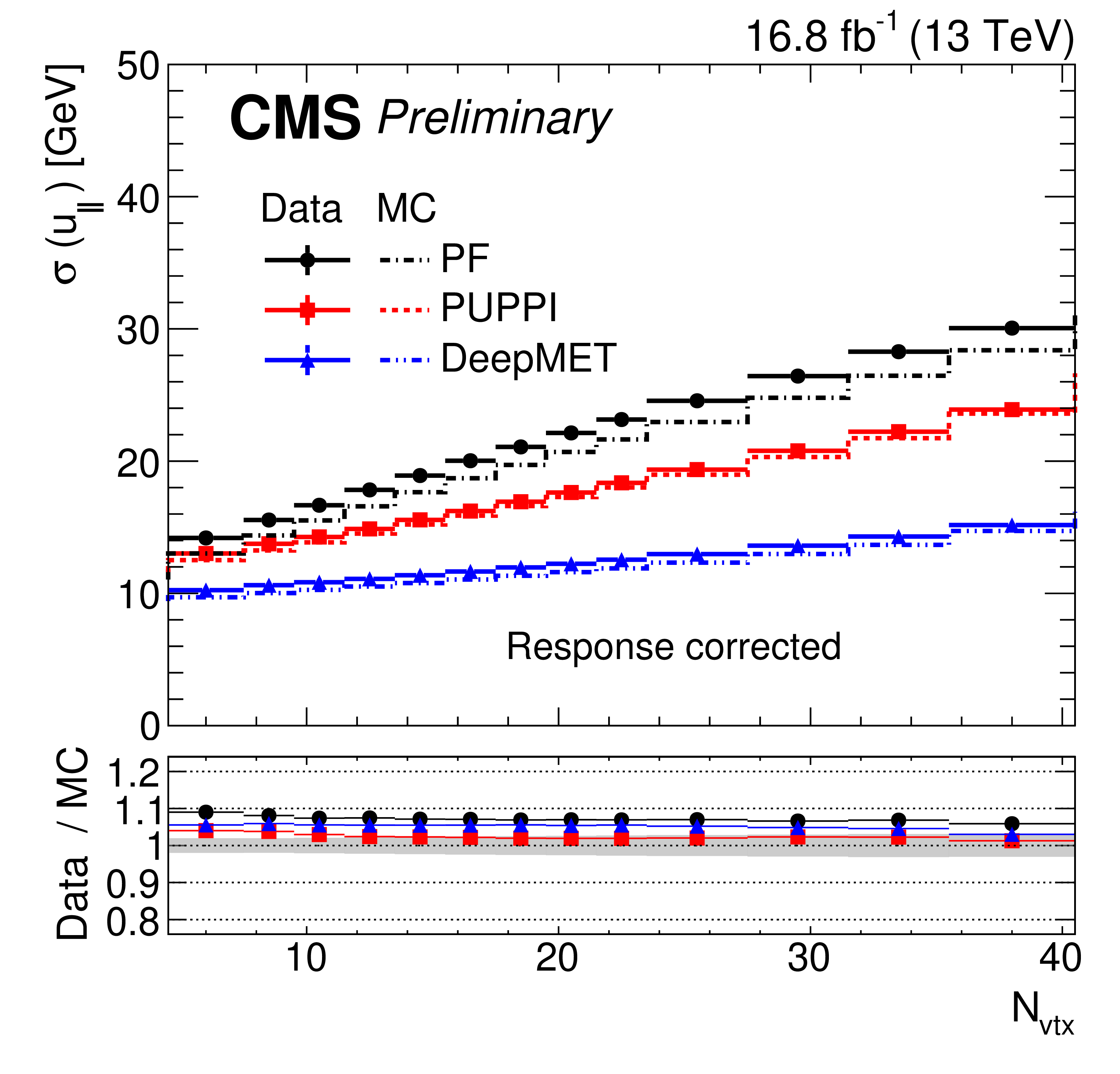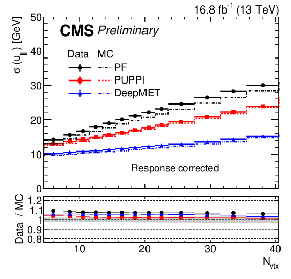 Response-corrected resolutions of $ u_{\parallel} $ (left) and $ u_{\perp} $ (right) vs. number of reconstructed PVs of different $ p_{\mathrm{T}}^\text{miss} $ estimators in data (solid) and MC simulations (dashed) after the $ \mathrm{Z}\to\mu\mu $ selections. The systematic uncertainties for PUPPI $ p_{\mathrm{T}}^\text{miss} $ due to the JES, the JER, and variations in the EU are added in quadrature and displayed with a band. |