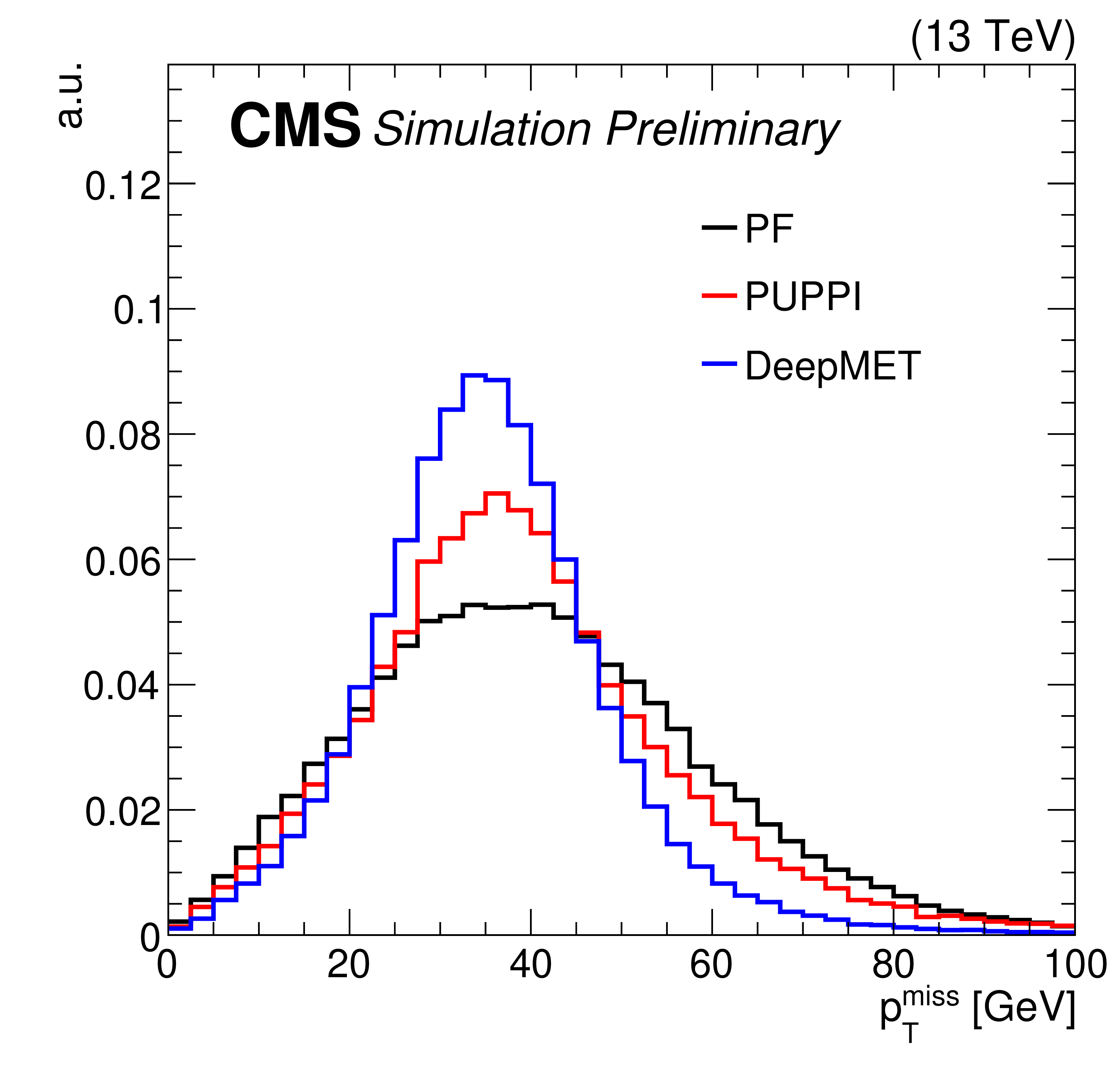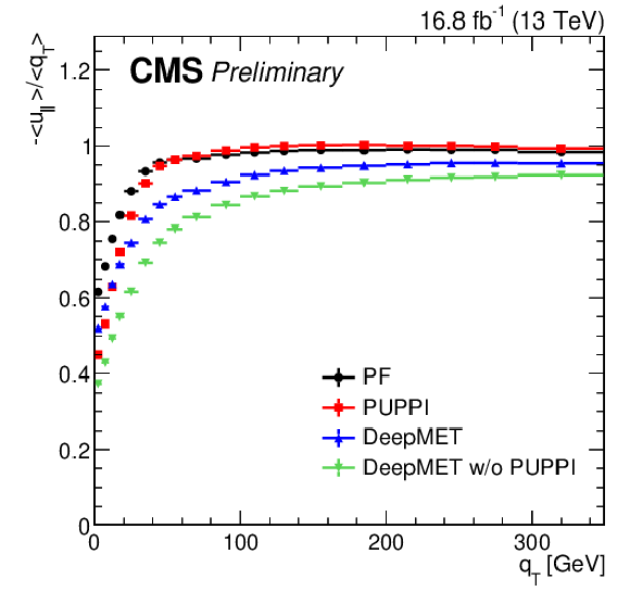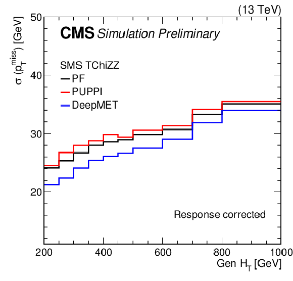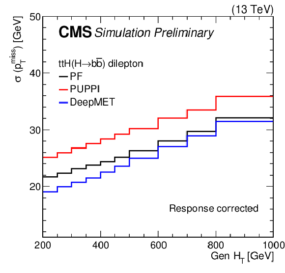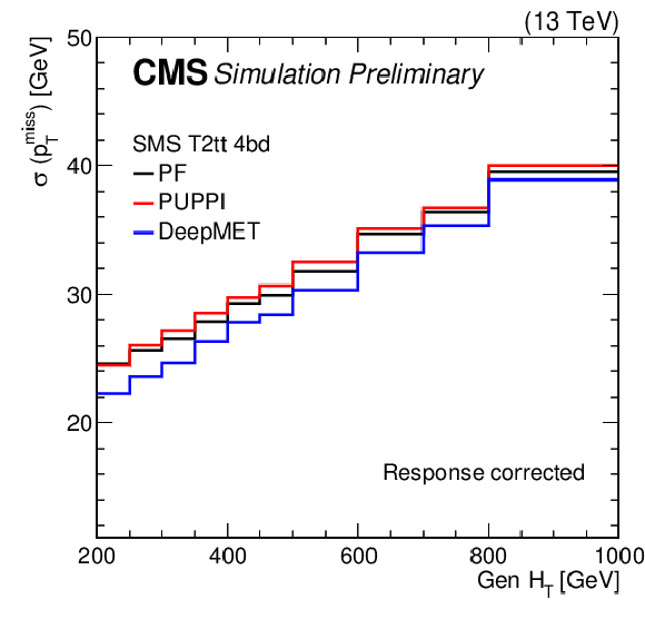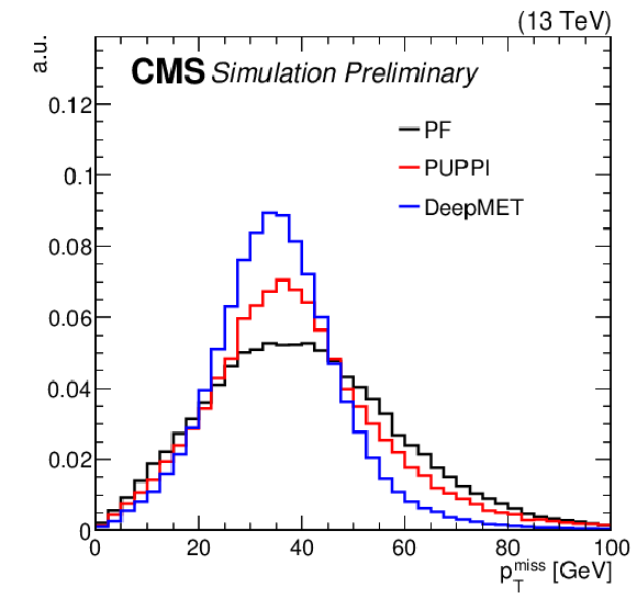 | This paper presents a new $ p_{\mathrm{T}}^\text{miss} $ estimator, DeepMET, which is based on a deep neural network. DeepMET utilizes each individual particle reconstructed by the CMS particle-flow algorithm as input and assigns a weight $ w_i $ and two bias terms $ b_{i,x}, b_{i,y} $ to each candidate. The estimated $ p_{\mathrm{T}}^\text{miss} $ is the negative of the vector sum of the weighted transverse momenta of all candidates plus their bias contributions. With only 4541 trainable parameters, DeepMET manages to achieve 10-20% better resolution compared with the current PF and PUPPI $ p_{\mathrm{T}}^\text{miss} $ estimators. In addition, the DeepMET algorithm shows a larger resilience to pileup. DeepMET demonstrates the potential to improve the precision of SM measurements and to achieve a higher sensitivity in BSM searches. |