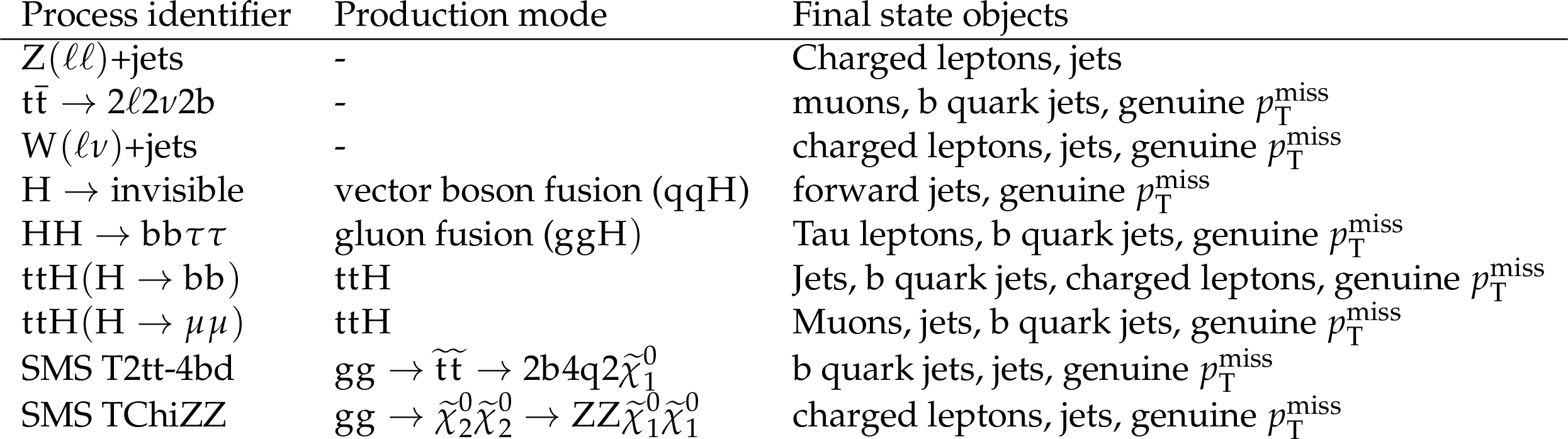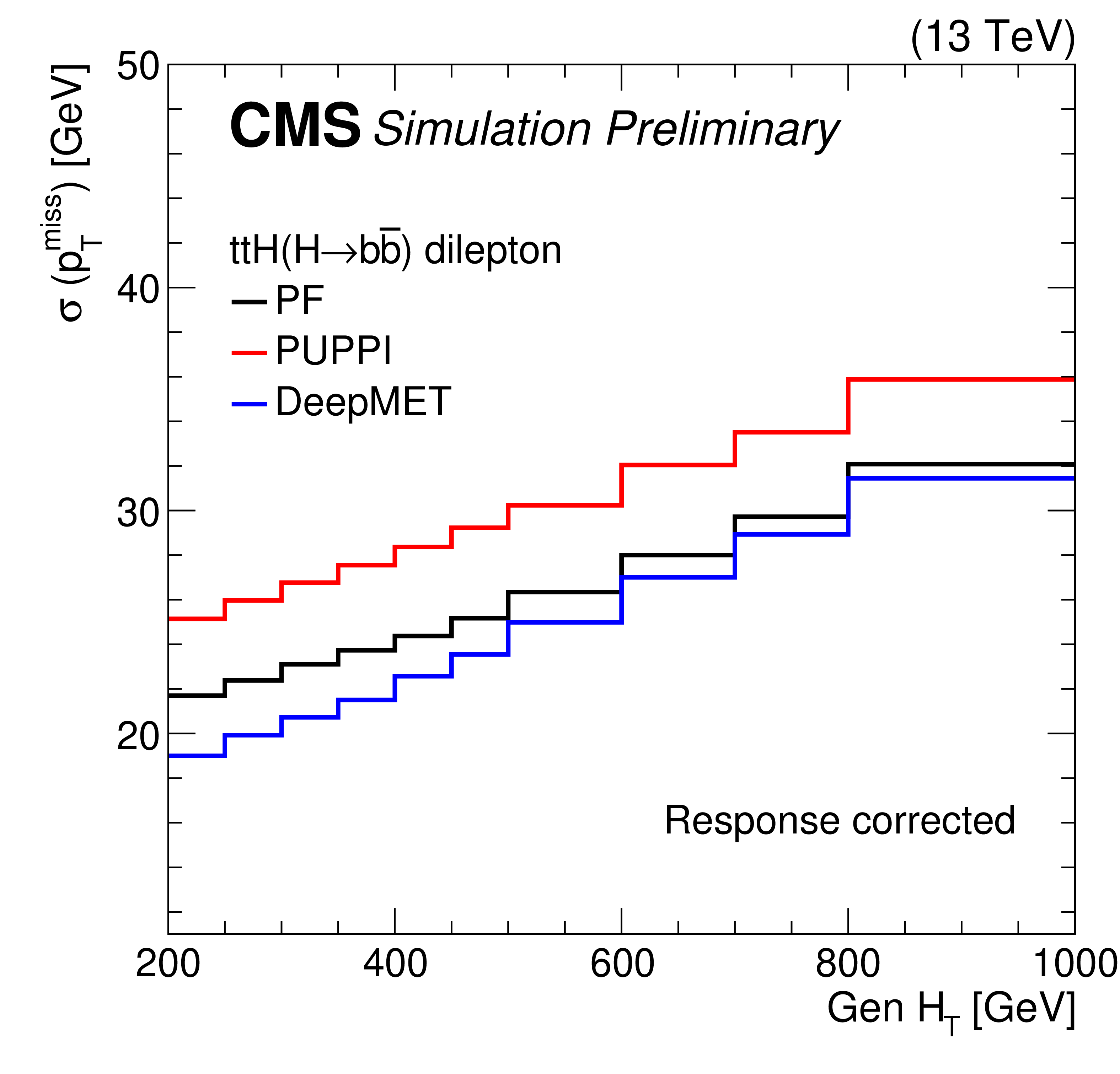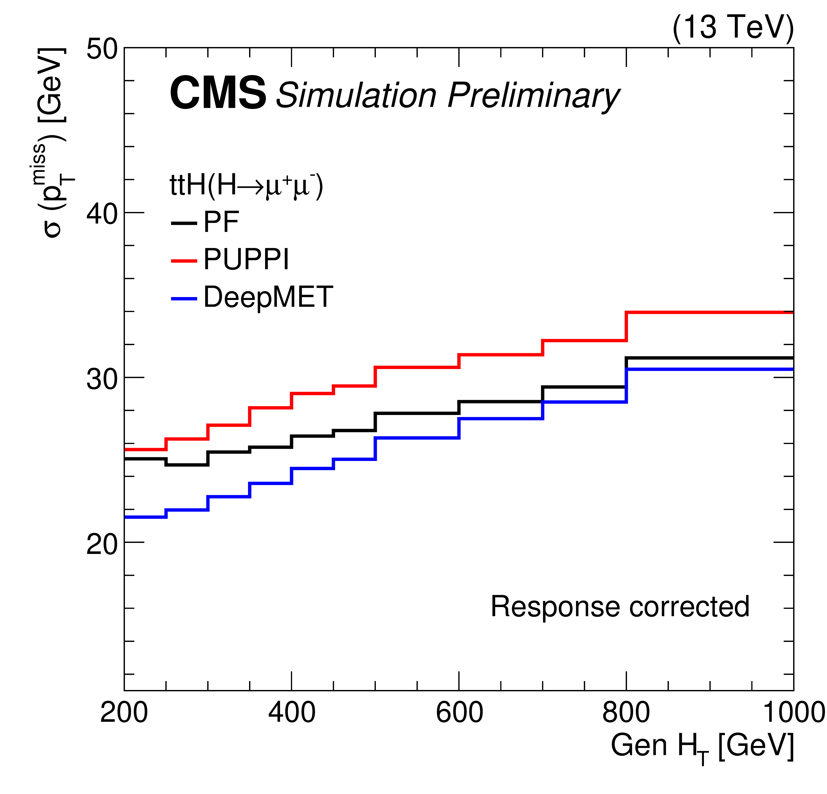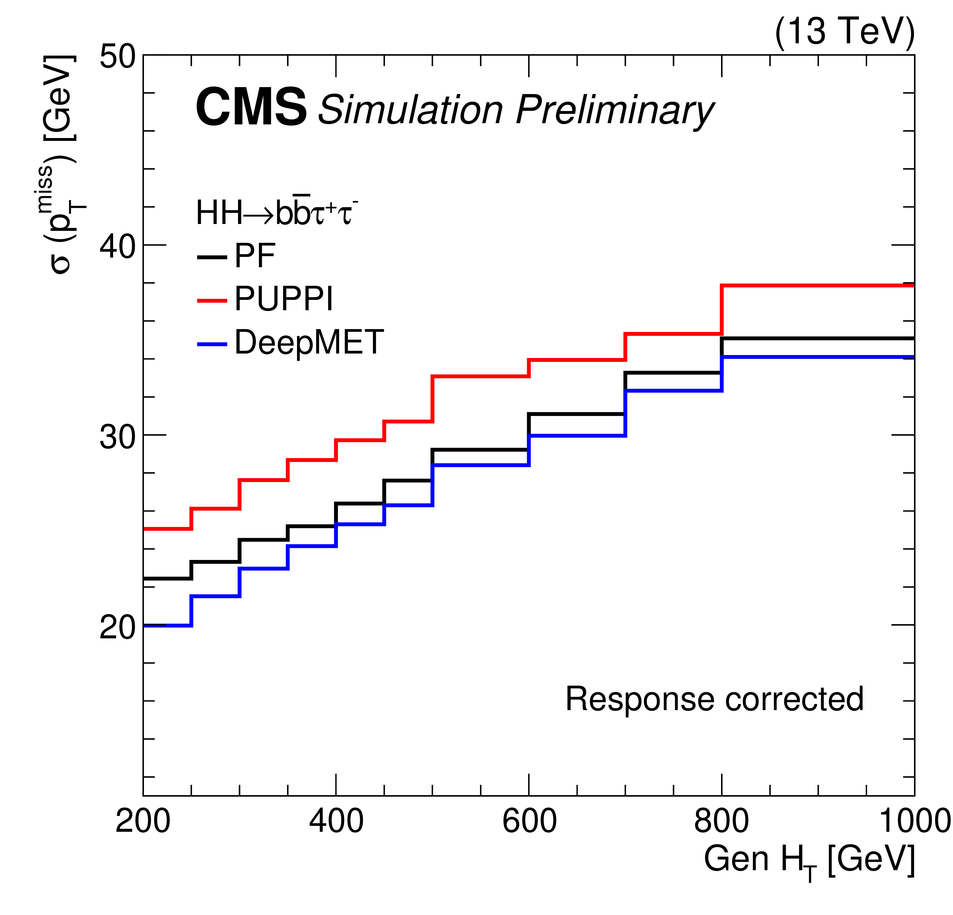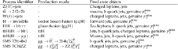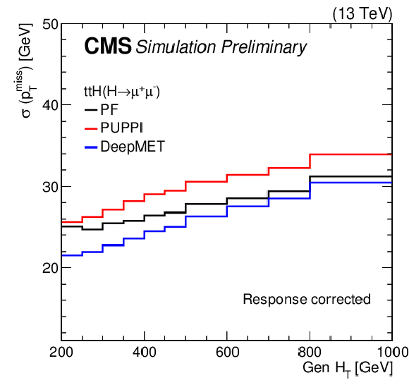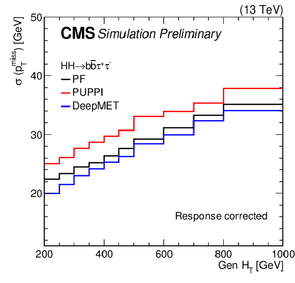 Comparison of $ p_{\mathrm{T}}^\text{miss} $ resolution for various physics processes in simulated events. The considered processes are HH production via gluon fusion with $ \mathrm{H}\mathrm{H}\to\mathrm{b}\mathrm{b}\tau\tau $ (top right), H production via vector boson fusion with $ \mathrm{H}\to\text{invisible} $ (top right), $ \mathrm{t}\mathrm{t}\mathrm{H} $ production with either $ \mathrm{H}\to\mathrm{b}\mathrm{b} $ (middle left) or $ \mathrm{H}\to\mu\mu $ (middle right), the SMS T2b-4bd process (bottom left), and the SMS TChiZZ process (bottom right). |